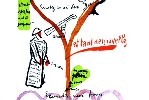 Le recueil porte d’ailleurs le sous-titre « Poèmes de la Paix et de la Guerre ». Pour sa dernière œuvre avant de succomber à ses blessures le 9 novembre 1918, Apollinaire avait choisi de concilier l’art de la poésie et celui du dessin. Cette exposition, organisée avec le comité des centenaires de Calligrammes et de la mort d’Apollinaire, présente une dizaine de calligrammes issus de ce recueil, en lien avec Paris et la Grande Guerre.