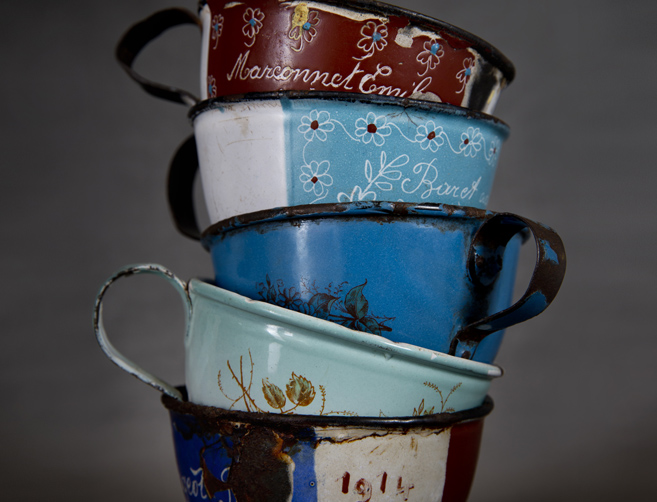 Dans une guerre qui paraissait interminable et s’enlisait de jours en jours, le quotidien des poilus sur le front n’était pas fait uniquement de combats. Il fallait souvent attendre, patienter et donc s’occuper. C’est ainsi que dans les tranchées, les soldats ont fabriqué et utilisé de nombreux petits objets en tout genre. Ont ainsi été retrouvés des flasques, des trousses de coutures, des petits couteaux en bois, etc. Cette exposition de photographies réalisées par Philippe Abergel présente ces objets centenaires sous un format polaroïd. Elle offre ainsi un autre regard sur les poilus, avec l’idée que derrière ces petites créations artisanales, il y avait des hommes et des savoirs faire, et non de simples soldats.