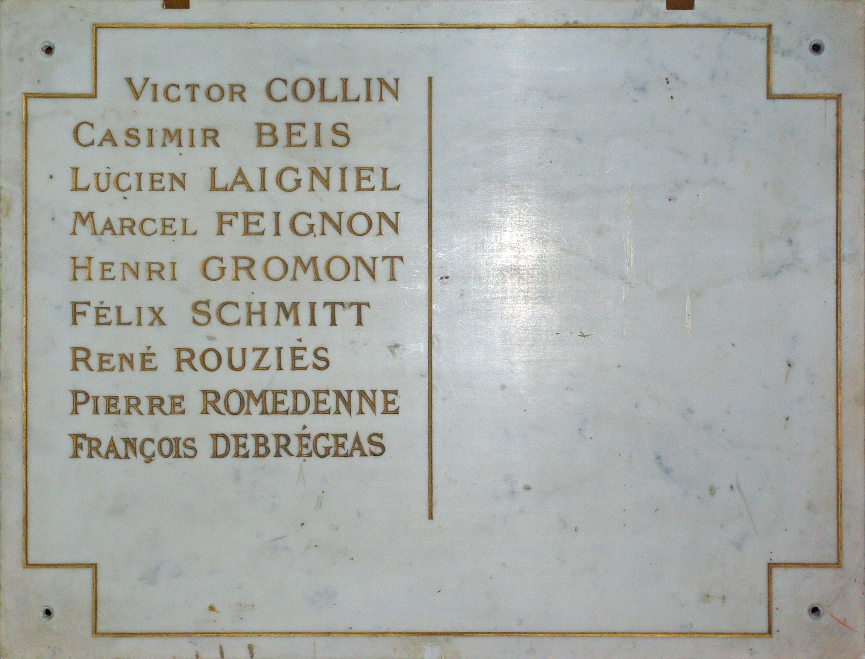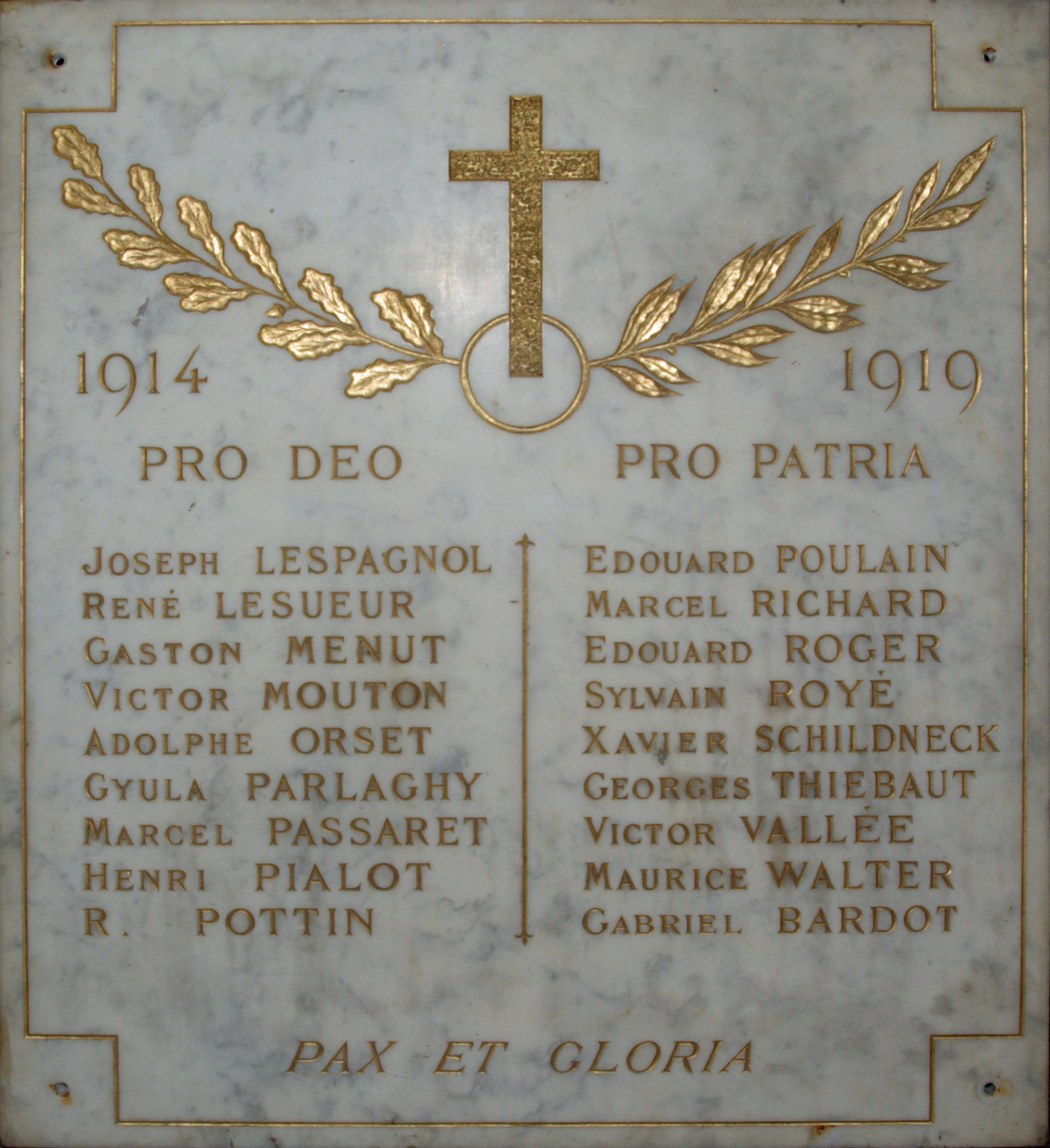 Trois plaques de marbre légèrement veiné de noir dont deux d'entre-elles sont décorées par une croix et des branches de laurier et de chêne et listent deux colonnes de noms gravés et dorés. Les trois présentent des lignes d'encadrement dorées et gravées. La troisième plaque est plus simple : neuf noms gravés et dorés. Les plaques mentionnent en tout 47 noms. Les deux plaques qui ont été déposées et ne sont donc visibles que pour les cérémonies du 11 novembre. Épitaphes sur les deux plaques : Au-dessus de la liste de noms : 1914 [motif central] 1919 PRO DEO PRO PATRIA Puis en dessous : PAX ET GLORIA © M. Aynié / DHMMA / Mairie de Paris