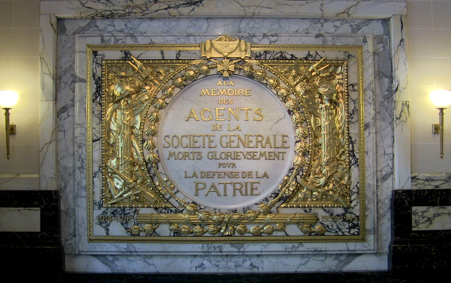 Le monument est situé dans le hall de l'agence centrale de la Société Générale. L'épitaphe est insérée dans une table fouillée en marbre veiné, garnie d'une inscription et d'un riche décor de bronze doré avec faisceaux des licteurs, trophées d'armes et guirlandes de laurier. Dimensions : h. 220 x l. 307 cm. Épitaphe : A LA MÉMOIRE DES AGENTS DE LA SOCIÉTÉ GÉNÉRALE MORTS GLORIEUSEMENT POUR LA DÉFENSE DE LA LA PATRIE 1914-1918 1939-1945 Historique : Le monument fut inauguré en 1948, substituant un monument honorant les seules victimes de la Première Guerre mondiale. Il honore la mémoire des 1839 salariés de la Société Générale mort pour la France. © M. Aynié / DHMMA / Mairie de Paris. Monument aux morts du Crédit foncier d’Algérie et de Tunisie (CFAT) Il existe un autre monument au sous-sol de l’Agence centrale de la Société Générale, devant l’entrée de la salle des coffres, à la mémoire des employés de l’ancien Crédit foncier d’Algérie et de Tunisie (CFAT) morts pendant la Première Guerre mondiale. Sur un socle de 10 centimètres de hauteur se trouve une base sur laquelle sont gravés sur trois colonnes les noms des défunts, l’ensemble est encadré de palmes. Au-dessus, un bas-relief copie Le Départ des volontaires de 1792, ou La Marseillaise sculptée par François Rude en 1836, pour l’arc de triomphe de l'Étoile. Dimension Plaque : h. 172 x l. 109 cm.