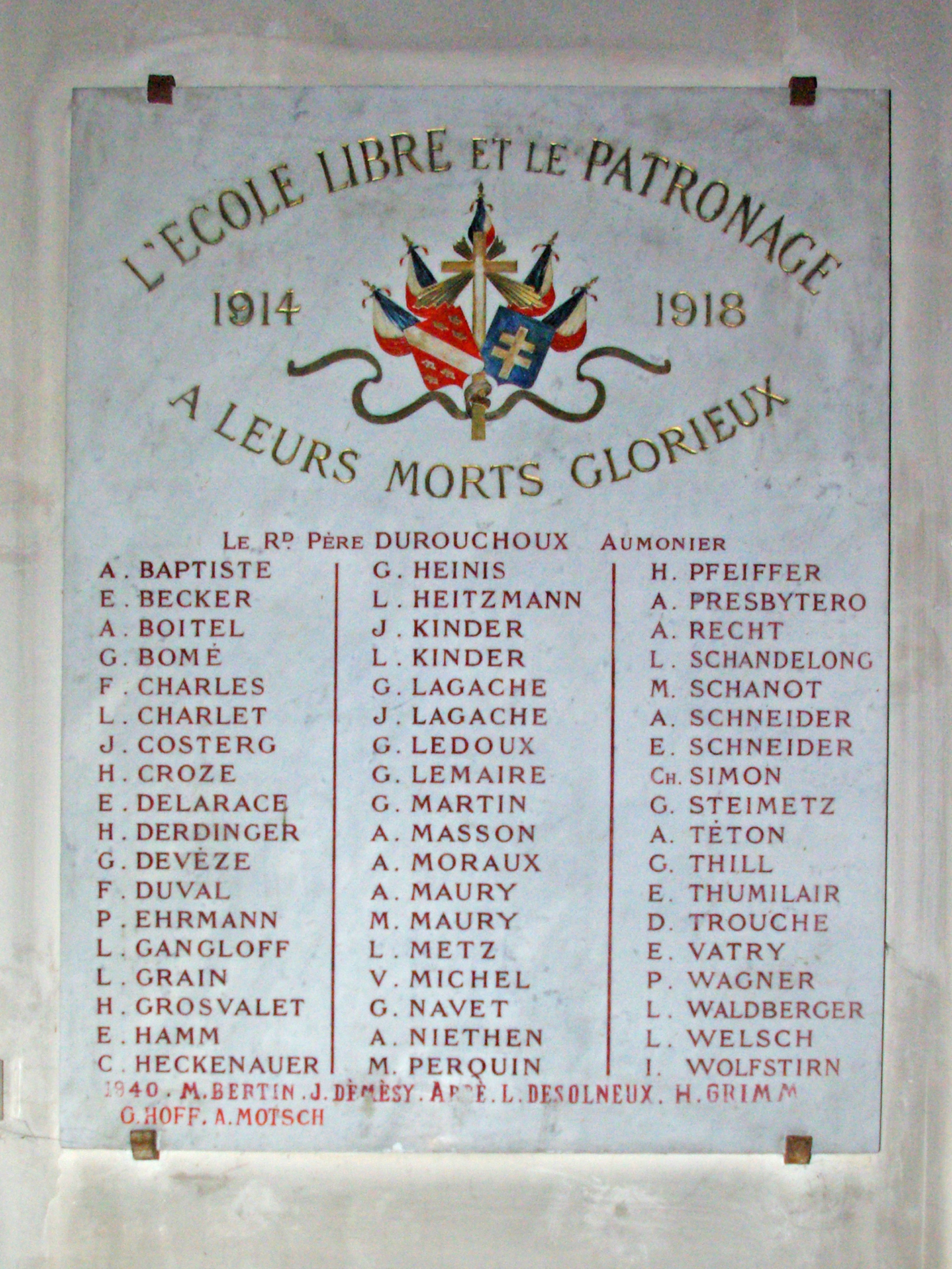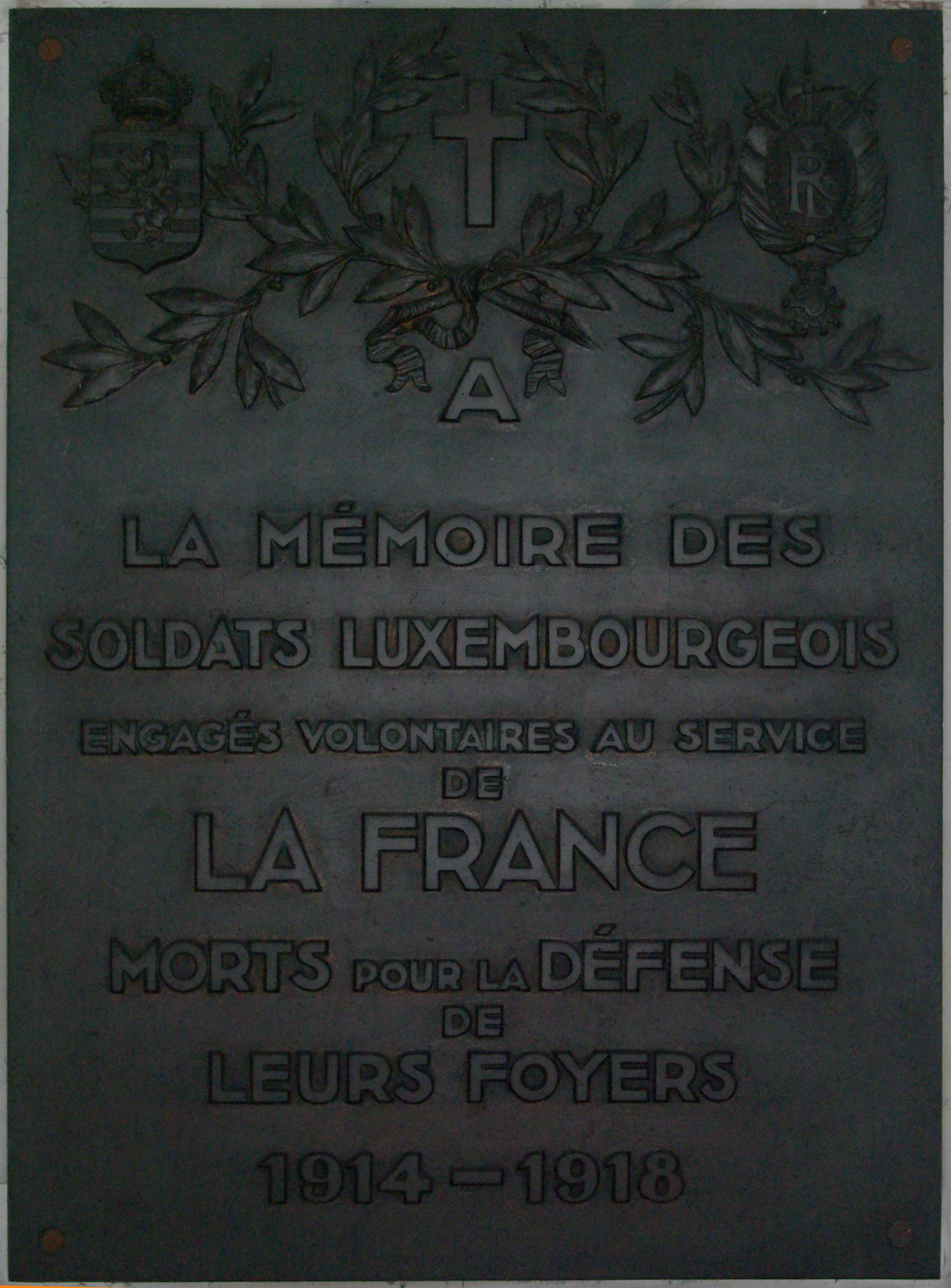 Deux plaques sont accrochées face à face dans l'entrée de l'église. Plaque 1 : Plaque en fonte décorée d'une croix encadrée de deux branches de laurier et de deux armoiries dont celle du Luxembourg. Épitaphe : A LA MEMOIRE DES SOLDATS LUXEMBORGEOIS ENGAGE VOLONTAIRES AU SERVICE DE LA FRANCE MORTS POUR LA DEFENSE DE LEURS FOYERS 1914 - 1918 Plaque 2 : Plaque en marbre blanc légèrement veiné de gris, décorée par une croix latine ornée des rayons du saint Esprit, puis de cinq drapeaux français et deux blasons non identifiés. Accroché au pied de la croix, un philactère ondule. L'épitaphe est gravée et dorée. Trois colonnes comportent 55 noms gravés et rehaussés de rouge bordeaux. Au bas de la plaque, les noms de sept soldats morts en 1940 ont été peints directement sur la plaque. Épitaphe : L'ECOLE LIBRE ET LE PATRONAGE 1914 [ motif central] 1918 A LEURS MORTS GLORIEUX © M. Aynié / DHMMA / Mairie de Paris