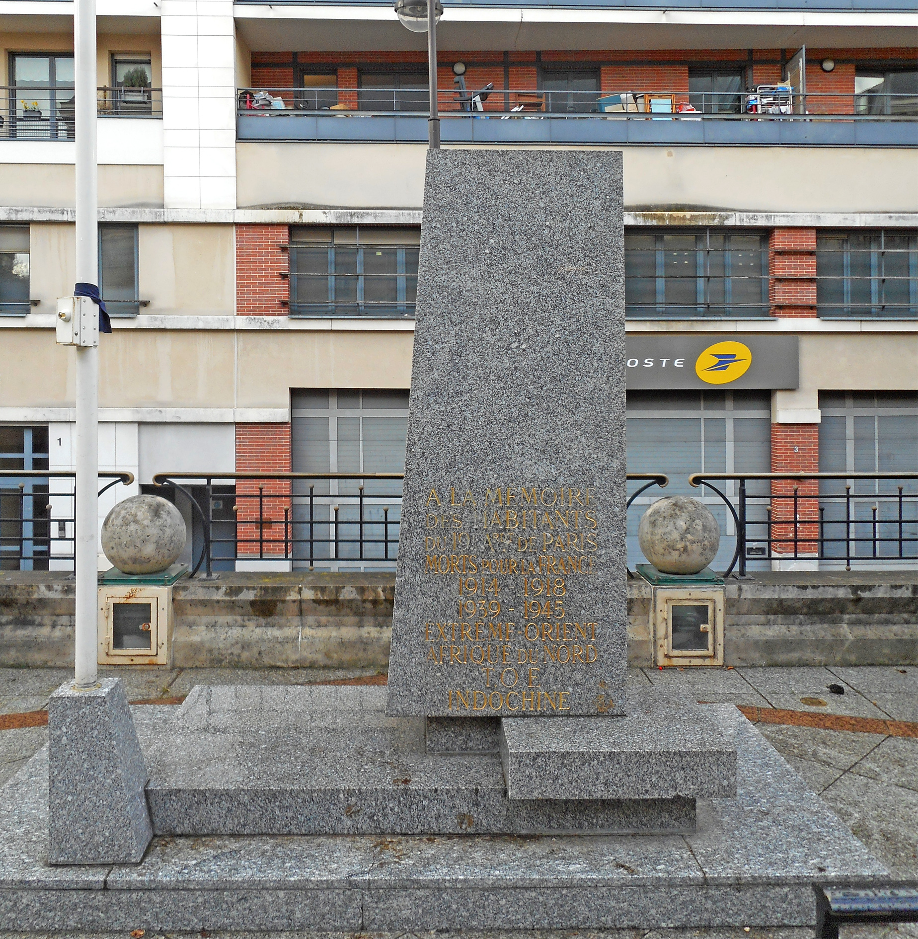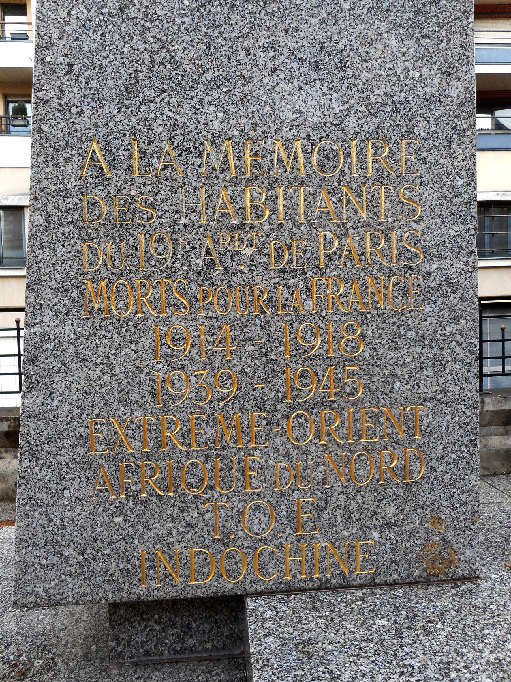 ÉPITAPHE : À LA MEMOIRE DES HABITANTS DU 19E ARDT DE PARIS MORTS POUR LA FRANCE 1914-1918 1939-1945 EXTREME-ORIENT AFRIQUE DU NORD T.O.E INDOCHINE Historique : le 30 avril 1969, il fut décidé de substituer l’ancien monument au mort du 19e arrondissement (voir la fiche correspondante) par un nouveau qui serait disposé soit dans le parc des Buttes-Chaumont, soit en bordure du parc. Le 10 mars 1970, le préfet de Paris donna sa préférence pour un emplacement dans le parc lui-même, juste devant la mairie d’arrondissement. Le monument fut choisi à ce moment-là. Observez dans les archives consultés, on le mentionne toujours comme « le projet n° 1 » sans que jamais le nom de son auteur ne soit évoqué. Le monument sélectionné, une stèle aux formes abstraites devait avoir des dalles brutes en ardoise à sa base, symbolisant la figuration d’une déflagration. Mais le préfet proposa de les supprimer, les considérant comme quelque peu surannées pour un tel monument. La proposition de dépense pour le projet de budget modificatif de 1970, prévoit un budget de 31 000 francs pour la construction du monument, dont 20 000 pour la sculpture elle-même. Le projet fut adopté par le Conseil de Paris par délibération du 9 juillet 1970. L’arrêté d’autorisation des travaux fut signé le 17 septembre 1970. En 1996, le monument fut déplacé sur la terrasse du parc de stationnement André Dubois, à l’arrière de la maire d’arrondissement. Dimensions du monument : Soubassement : 210 x 95 cm. Monolithe : 191 cm de haut. Base du monolithe : 80 x 61 cm. Sommet du monolithe : 65 x 41 cm. Bibliographie : Archives de la COARC. © D. Grenèche / CHVP / Mairie de Paris