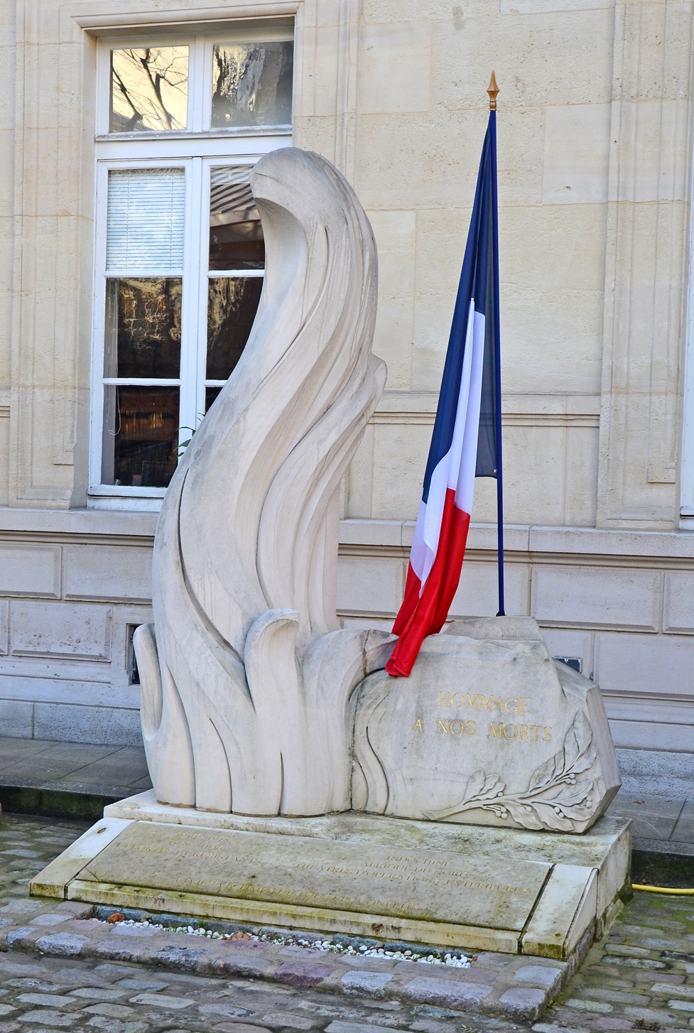 Le monument aux morts du 3e arrondissement a été inauguré le 11 novembre 1984 dans une cour latérale de la mairie donnant sur la rue Perret. À l’origine, le monument commémorant les défunts de l’arrondissement était composé d’une simple stèle se trouvant dans la cour latéral de la mairie, côté rue de Bretagne. En 1987, la cour a été pavée, le monument reculé. Le projet d’un monument aux morts a été confié au sculpteur Costas Spourdos. Dans son devis en date du 15 juin 1984, il propose une : « sculpture d’une flamme taillée en pierre de Lavoux, avec à sa droite un volume de pierre évoquant un rocher orné d’une inscription gravée ». Le budget total de ce programme est de 191.760 francs. La sculpture est livrée le 15 octobre 1984. Dimensions : flamme : h. 280 x l. 96 x p. 80 cm ; rocher : h. 0.85 x l. 1,10 x p. 0,50 m ; socle : h. 0,25 x 2,10 x 0,85 m. Le monument est composé de d’un bloc pesant 3,5 tonnes et de , 900 kilos et de nouveau 900 kilos. Épitaphe : HOMMAGE A NOS MORTS Puis sur une plaque posé sur le socle, colonne de gauche : « 1914 – 1918 / 1939 – 1945 / DEPORTES ET RESISTANTS. Sur la colonne de droite : INDOCHINE / AFRIQUE DU NORD / THEATRES D’OPERATIONS EXTERIEURES ». En bas au centre : « CIVILS VICTIMES DE TOUS LES CDONFLITS. » © Frédéric Jimeno / CHVP / Mairie de Paris.