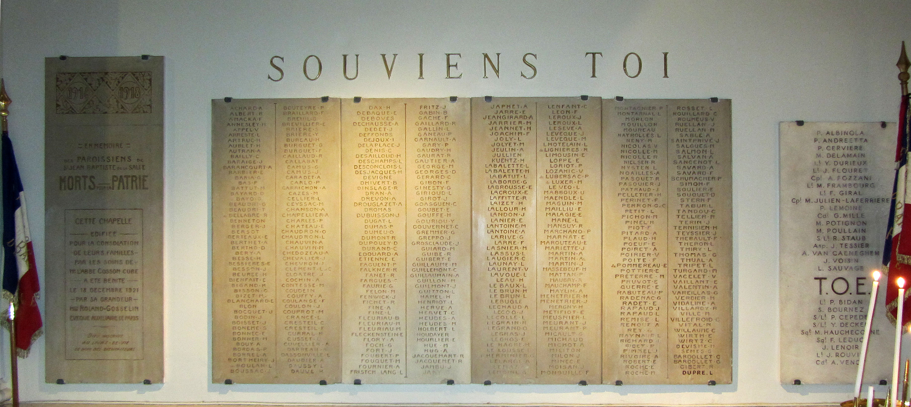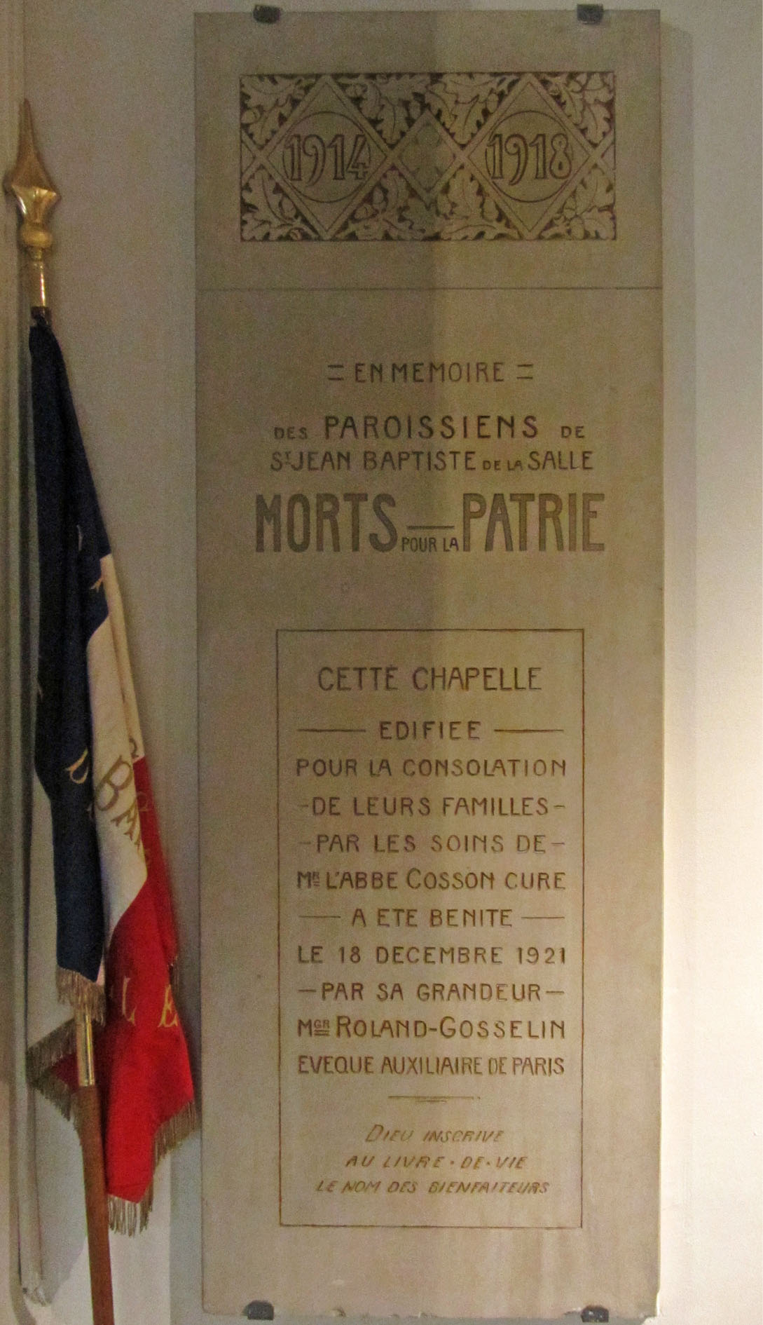 Épitaphe : 1914 - 1918 EN MEMOIRE DES PAROISSIENS DE St JEAN BAPTISTE DE LA SALLE MORTS POUR LA PATRIE CETTE CHAPELLE EDIFIE POUR LA CONSOLATION DE LEURS FAMILLES PAR LES SOINS DE Mr L'ABBE COSSON CURE A ETE BENITE LE 18 DECEMBRE 1921 PAR SA GRANDEUR Mgr ROLAND-GOSSELIN EVEQUE AUXILIAIRE DE PARIS Dieu inscrive au livre de vie le nom des bienfaiteurs. Puis au-dessus de la plaque centrale : SOUVIENS TOI Localisation : dernière chapelle du bas-côté gauche. Description : Statue de la Pietà face à nous, sur le mur de gauche, une plaque en marbre pour l'épitaphe, pour seul décor, quelques feuilles de chênes stylisées autours des dates, puis quatre plaques où sont gravés les noms des 400 enfants de la paroisse morts pour la France, et enfin une dernière plaque plus récentes. © S. Rouelle / CHVP / Mairie de Paris.