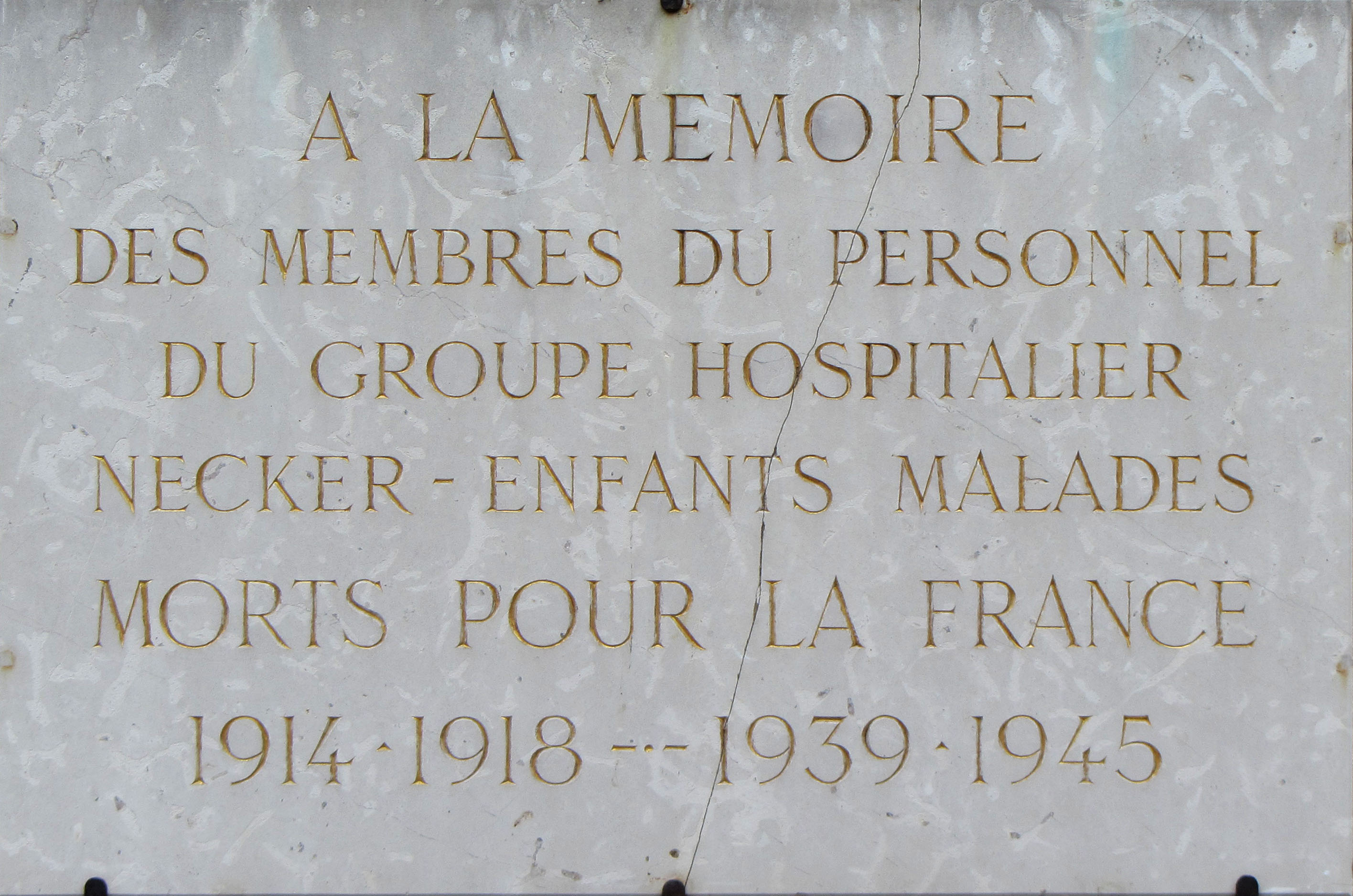 Plaque en pierre, lettres gravées et réchampies dorées. Localisation : Hôpital Necker - Enfants malades, carré Necker, cour intérieure, depuis l'entrée, au centre du mur droit. Épitaphe : A LA MEMOIRE DES MEMBRES DU PERSONNEL DU GROUPE HOSPITALIER NECKER - ENFANTS MALADES MORTS POUR LA FRANCE 1914 . 1918 - 1939 . 1945.