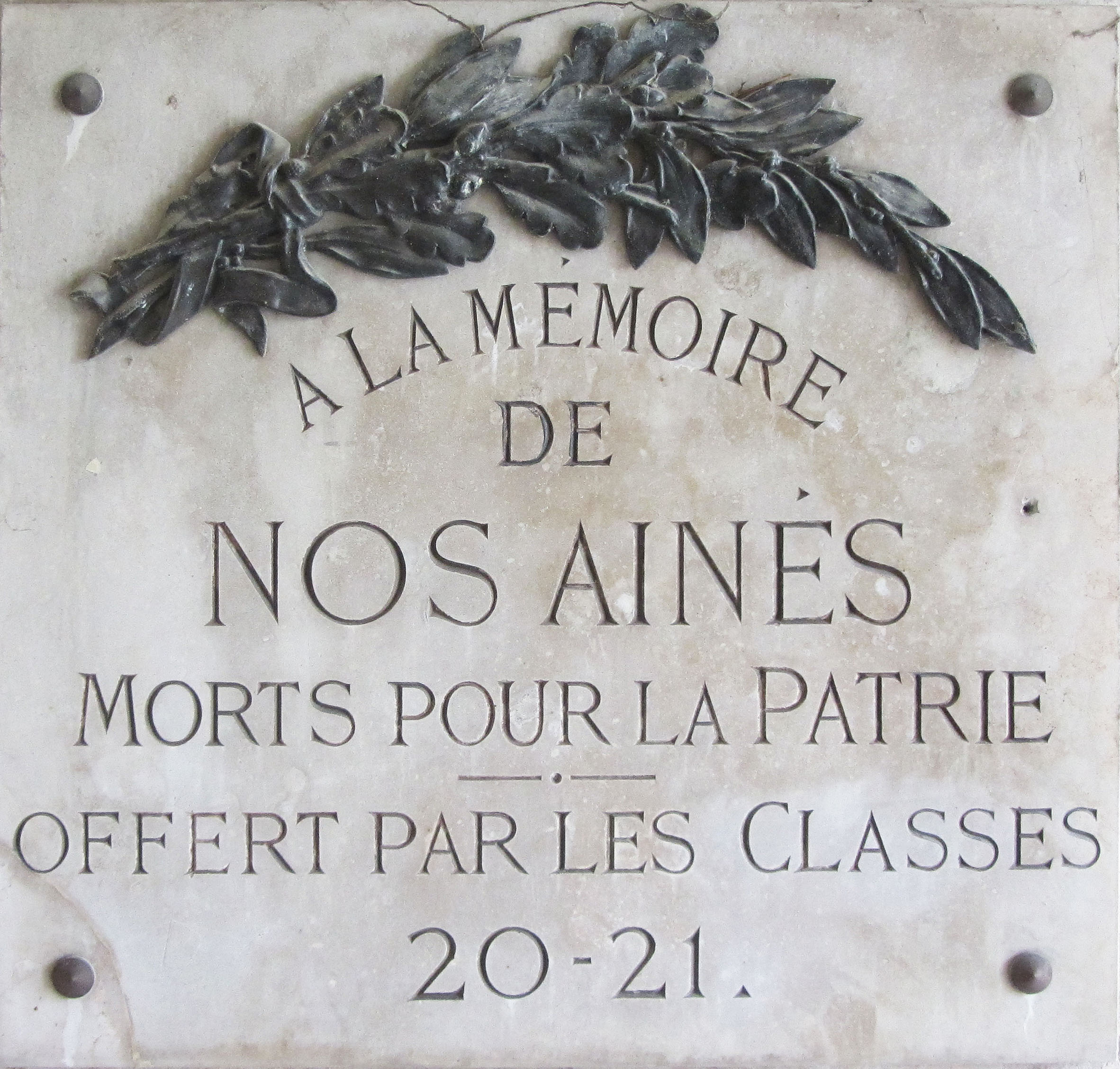 Les deux plaques sont situées dans le parc Georges Brassens, dans le porche d'entrée du beffroi de l'ancien marché à la criée des abattoirs de Vaugurard (Ernst Moreau (1894-1897), architecte), sur les murs lattéraux. Plaque 1 : Plaque en marbre blanc, l'épitaphe est encadrée par de palmes de lauriers en métal. L'ensemble des inscriptions, l'épitaphe et les deux colonnes de noms sont gravés et originellement réhaussé de rouge bordeaux. La plaque mentionne 59 noms de soldats. Épitaphe : HONNEUR ET SOUVENIR AUX PATRONS ET OUVRIERS BOUCHERS DES ABATTOIRS DE VAUGIRARD MORTS POUR LA PATRIE 1914 - 1918 Plaque 2 : Plaque en marbre blanc, inscriptions gravées et réhaussés de noir, pour seul décor une palme de laurier métallique et quatre cabochons aux angles. En toute logique, la plaque devrait dater de 1921 ou 1922. Épitaphe : A LA MÉMOIRE DE NOS AINÉS MORTS POUR LA PATRIE OFFERT PAR LES CLASSES 20 - 21 © S. Rouelle / CHVP / Mairie de Paris