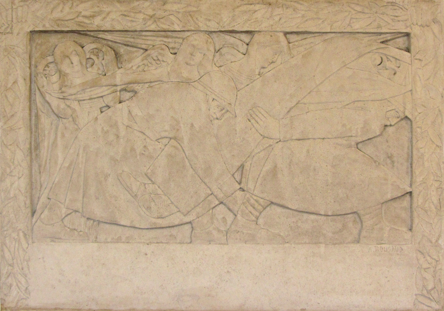 Épitaphe : Aux Fonctionnaires de l'Administration Centrale Morts pour la France [liste de 30 noms par ordre alphabétique puis deux femmes] OFFERT PAR LE PERSONNEL CIVIL ET MILITAIRE DE L'ADMINISTRATION CENTRALE Descriptions : La stèle en pierre (h. 200 x l. 100 cm environ) est signée en bas à droite du bas-relief : 'A. ROUSAUD', œuvre du sculpteur Aristide Rousaud (1868-1946), auteur de plusieurs monuments aux morts, notamment ceux de Langres et de L'Aigle (Orne). La stèle est encadrée d'une guirlande de feuilles stylisées de style Art-Déco. La partie supérieure est occupée par un bas-relief représentant deux soldats portant le cadavre de l'un de leur camarade, au fond de la composition des anges regardent la scène. Dans la partie inférieure, l'épitaphe et le nom de 30 fonctionnaires, dont deux femmes, morts pendant la guerre. Le monument fut inauguré le 20 mai 1926 par Paul Painlevé, ministre de la Défense (Le Gaulois, 21 mai 1926, p. 2).