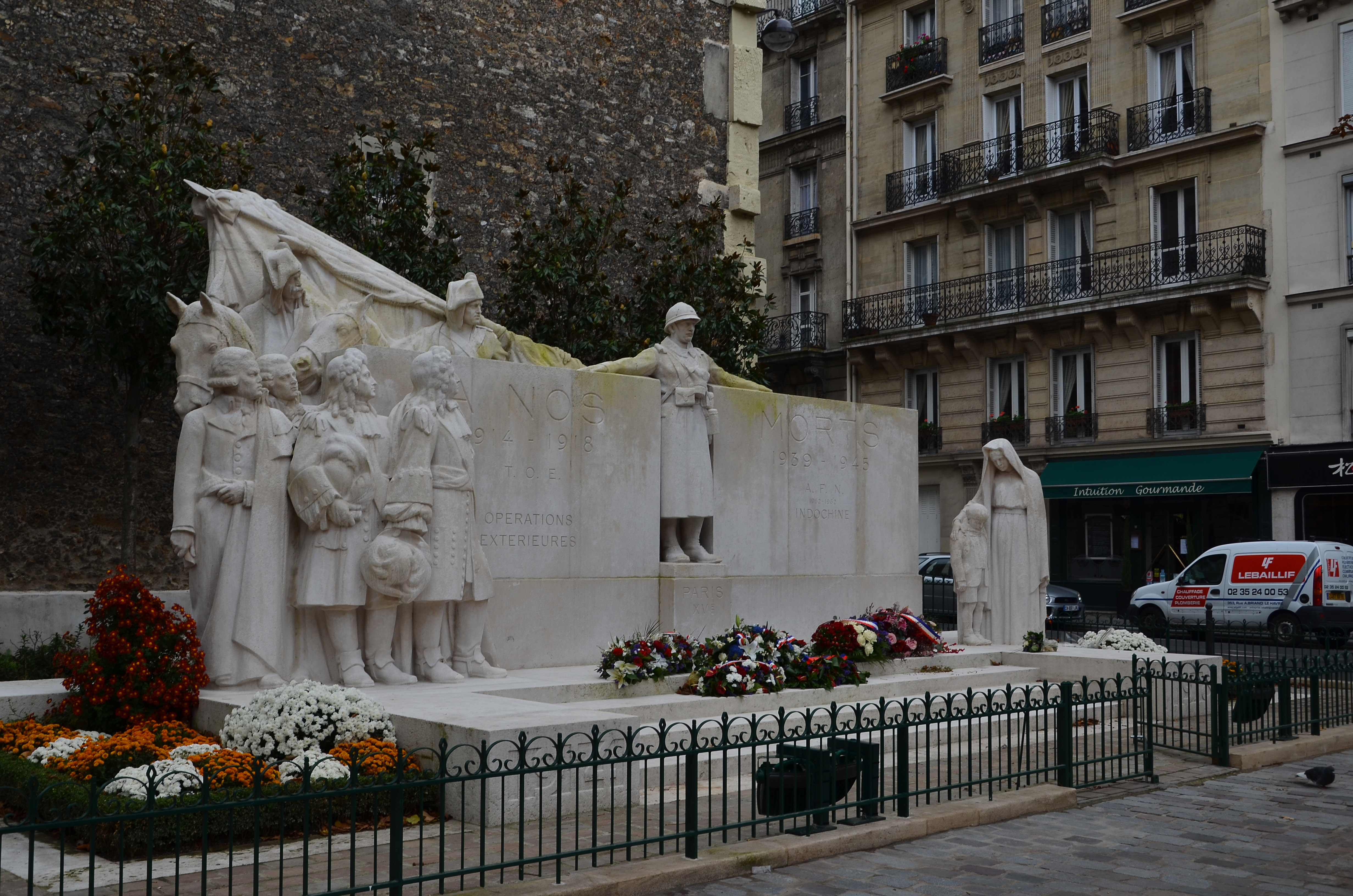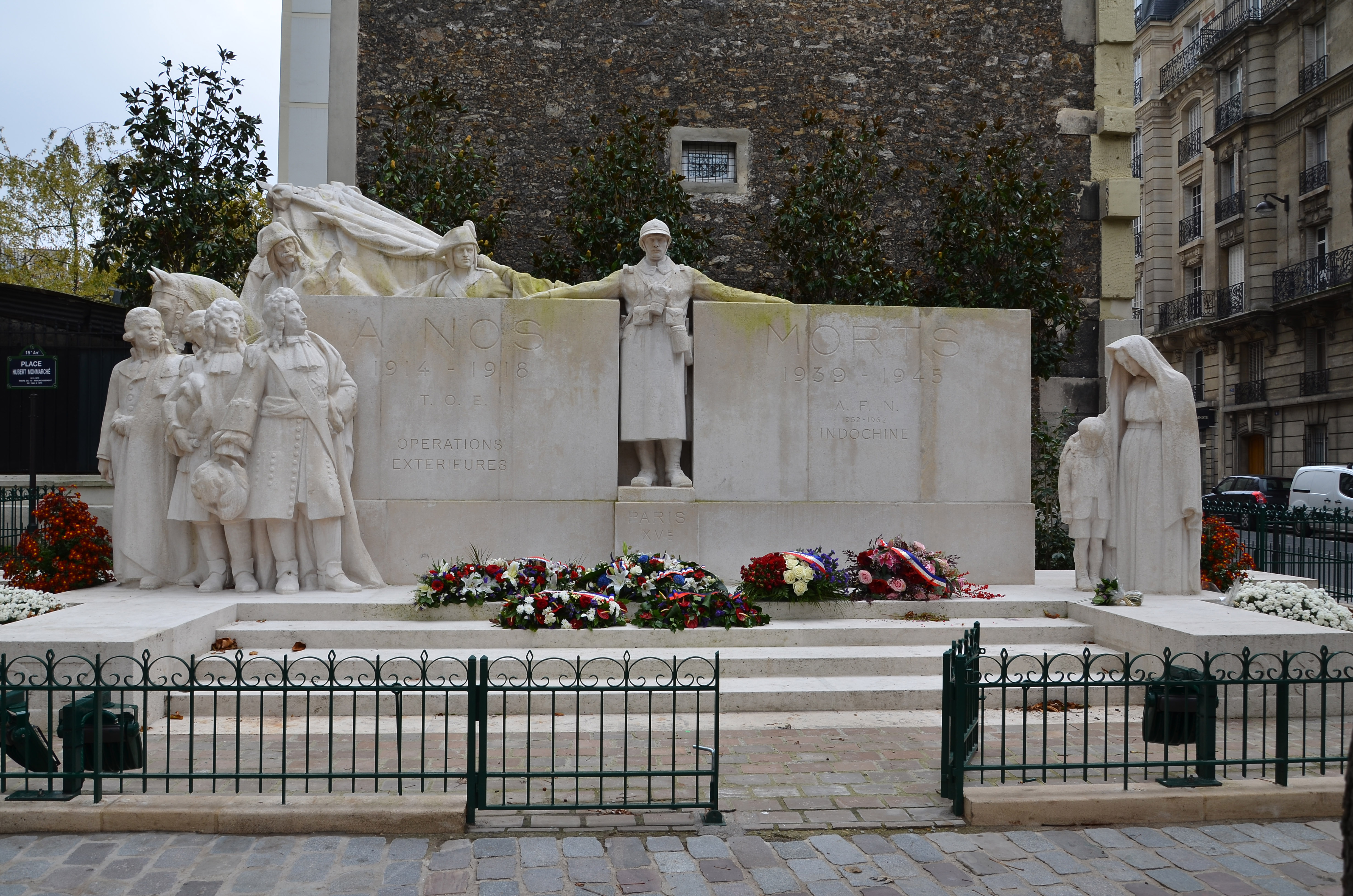 Le monument en pierre représente trois moments glorieux de l’histoire militaire de notre pays soit : - La victoire inespérée des armées françaises commandées par le maréchal de Villars à Denain en 1712 ; - La victoire de Valmy en 1792 ; - La victoire lors de la bataille de la Marne. Le monument représente donc de gauche à droite : un groupe formé par Louis XIV, le maréchal de Villars, Georges Jacques Danton et Pierre Victurnien Vergniaud ; au centre, entre les deux stèles, le poilu, avec derrière lui, deux soldats de Valmy ; à droite la veuve et l’orphelin. Épitaphe : À NOS MORTS 1914 - 1918 1939 - 1945 T.O.E. A.F.N. OPERATIONS 1952 – 1962 EXTERIEURES INDOCHINE PARIS XVE Historique : En 1931, la municipalité organisa un concours ouvert jusqu'au 20 mai en vue de l'attribution de la commande. Le jury qui se réunit le 17 juillet 1931, sélectionna le sculpteur et architecte Charles Yrondy (1885-1960). Les architectes Chappey et Quillet associés au sculpteur Lesieux obtinrent le deuxième prix. Allègre associé au sculpteur Félix Desruelles le troisième. Le Comité put réunir un budget de 90.000 francs pour réaliser le monument (http://monumentsmorts.univ-lille3.fr/monument/3443/paris-rue/). Inauguration : Il y eut deux cérémonies d’inauguration du monument le 17 juin 1734. En effet, et comme l’explique Le Journal (17 juin 1734, p. 7), une association d’anciens combattants adhérente au Parti Communiste refusa d’assister à cette commémoration si La Marseillaise était jouée. Il y eut donc une première cérémonie avec La Marseillaise, puis une seconde avec L’Internationale. Le Président de la République, Gaston Doumergue, qui dans un premier temps avait accepté d’assister à la cérémonie, annula sa participation. Une deuxième polémique vint entacher la cérémonie, puisque Charles Yrondy s’absenta « à la minute où glissera le voile qui recouvre son œuvre ». Il a d’ailleurs protesté auprès du président du Comité : 'J’ai été surpris de constater […] qu’en mon absence et sans mon consentement, vous vous étiez permis d’apporter des modifications au monument aux morts du XVe arrondissement, dont je suis l’auteur. Ma surprise s’est accrue quand j’ai constaté qu’un garde vigile devait m’empêcher de travailler si je n’étais pas de votre avis quant à ces modifications' » (Le Journal, 17 juin 1934, p. 7 ; BMO, 4 juillet 1934, p. 2433). Ces tensions politiques n’étaient pas rares à l’époque, ainsi le monument aux morts de Levallois-Perret (1926, inauguré le 3 avril 1927) toujours du sculpteur Charles Yrondy fut-il vandalisé, le pommeau du glaive tordu par l'Ouvrier fut brisé et c’est le ministre de l’intérieur lui-même qui dû intervenir pour défendre l’honneur de l’artiste dont l’attitude pendant la guerre fut exemplaire. © S. Rouelle / DHMMA / Mairie de Paris