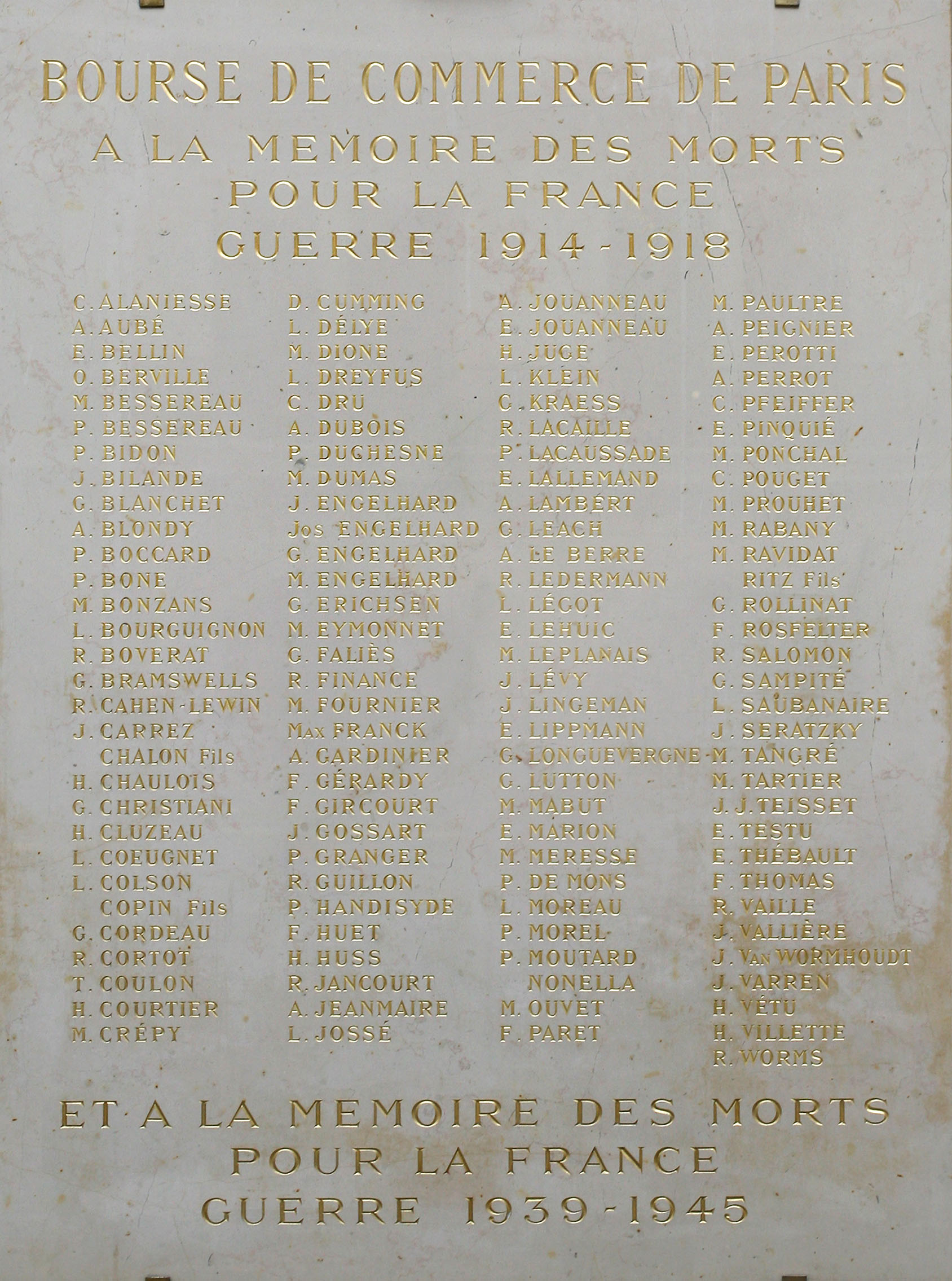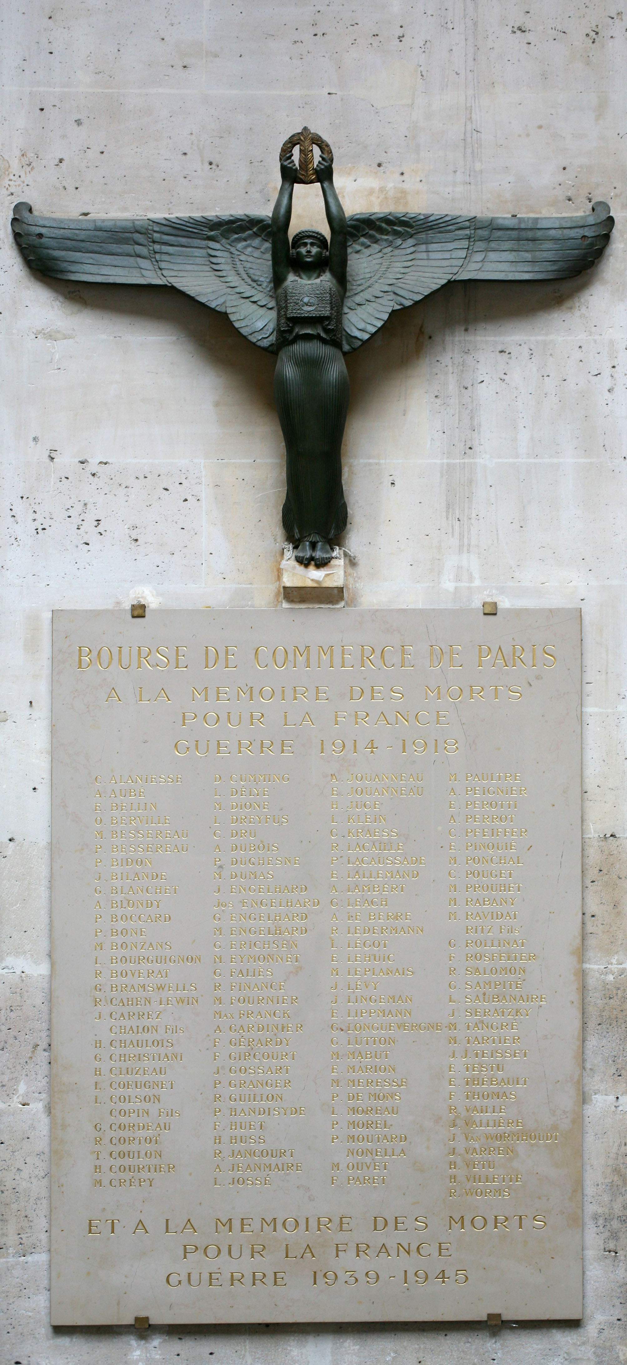 Une plaque en pierre blanche surmontée d'une Victoire en bronze. La plaque comprend une liste de 131 noms gravées et réchampies d'or. Épitaphe : BOURSE DE COMMERCE DE PARIS A LA MEMOIRE DES MORTS POUR LA FRANCE Historique : projet des architectes Jean-Baptiste Saacké (né en 1884) et Jacques Lambert (1884-1961) qui furent associés de 1921 à 1925. Jacques Lambert collabora a d'autres reprises avec le sculpteur Marcel Loyau. © M. Aynié / DHMMA / Mairie de Paris
