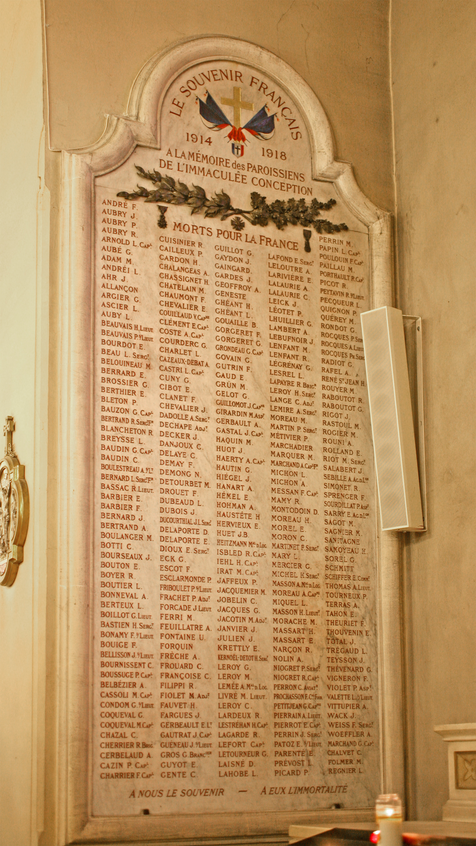 Dans le bas-côté droit, quatrième travée, et contre le mur de gauche, une plaque en marbre, dont la décoration comprend des branches de laurier et de chêne en bronze rapportées, des drapeaux français peints, une croix gravée et dorée, comporte une liste de 291 noms de victimes. L’épitaphe et les noms des défunts sont gravés et rehaussés de rouge bordeaux. Épitaphe : LE SOUVENIR FRANÇAIS A LA MEMOIRE DES PAROISSIENS DE L’IMMACULÉE CONCEPTION MORTS POUR LA FRANCE Puis en bas : A NOUS LE SOUVENIR – A EUX L’IMMORALITÉ Historique ; C’est à la demande du cardinal-archevêque de Paris, Léon-Adolphe Amette, qu’une première liste de noms de paroissiens morts pour la France est publiée dans le bulletin paroissial de janvier 1916 (p. 11-12), puisque : « Son Éminence le Cardinal Archevêque a exprimé le désir qu’à la fin des hostilités des plaques de marbre contenant les noms de tous les paroissiens morts pour la France soient apposées dans chaque église : nous voudrions qu’il n’y eût aucune omission à regretter. » Le projet est de nouveau mentionné dans un autre texte du même bulletin (p. 4) : « En honorant les Français sur notre Paroisse, je n’ai jamais oublié ceux de nos Paroissiens qui sont morts au loin. Mon désir serait d’avoir leurs noms et de les faire graver, après la guerre, sur une plaque de marbre dans une chapelle latérale de notre église. Nous avons commencé à dresser la liste de ces morts. Elle n’est pas complète, et la durée de la guerre ne nous fait pas espérer que nous puissions la clore d’ici longtemps. » Le monument a donc été préparé de 1916. Bibliographie : L. Coriton, « La paroisse de l’Immaculée-Conception du mois d’août 1914 au mois de janvier 1916 », Paroisse de l’Immaculée-Conception de Paris, n° 1, janvier 1916, p. 4. A savoir : La plaque est semblable à celle se trouvant dans l’église Sainte-Marguerite commandée par la même association, Le souvenir français, mais elle est plus petite et plus simple. Ainsi les drapeaux français en mosaïque de Sainte-Marguerite sont-ils peints à l’Immaculée Conception. Une deuxième plaque liste les victimes de la Seconde Guerre mondiale et des guerres d'Indochine et d'Afrique du Nord. © F. Jimeno / DHMMA / Mairie de Paris
