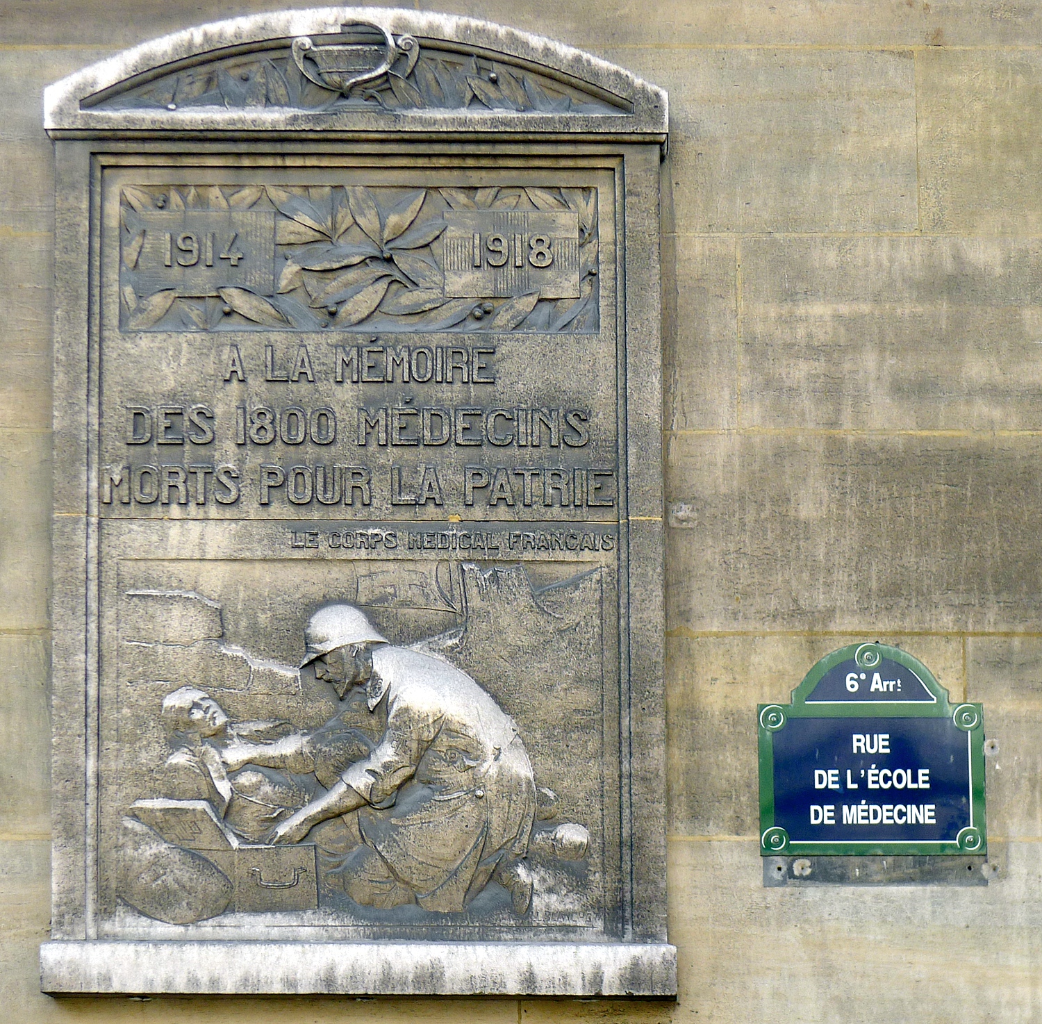 Plaque, située sur le mur de l'édifice donnant sur la rue. En calcaire, elle dispose au centre de l’épitaphe en relief, au-dessus d’elle les dates « 1914 » et « 1918 » en relief sur un tapis de feuillage. En-dessous de l’épitaphe, un relief représentant un médecin soignant un blessé dans un champ de bataille, au-dessus de lui flotte le drapeau de la Croix-Rouge. Le fronton est orné d’une sorte de caducée où l’on observe un serpent entrelacé sur une coupe antique, ainsi que des feuillages stylisées. Le relief signé ebad : « LL BLANCHOT » est traditionnellement attribué au sculpteur Léon-Alexandre Blanchot (1868-1947). Épitaphe : À LA MÉMOIRE DES 1800 MÉDECINS MORTS POUR LA PATRIE LE CORPS MEDICAL FRANCAIS Bibliographie : Christian Hottin, Quand la Sorbonne était peinte, Paris, Éditions Maisonneuve et Larose, 2001, p. 157. © Mbzt / Wikimedia Commons.