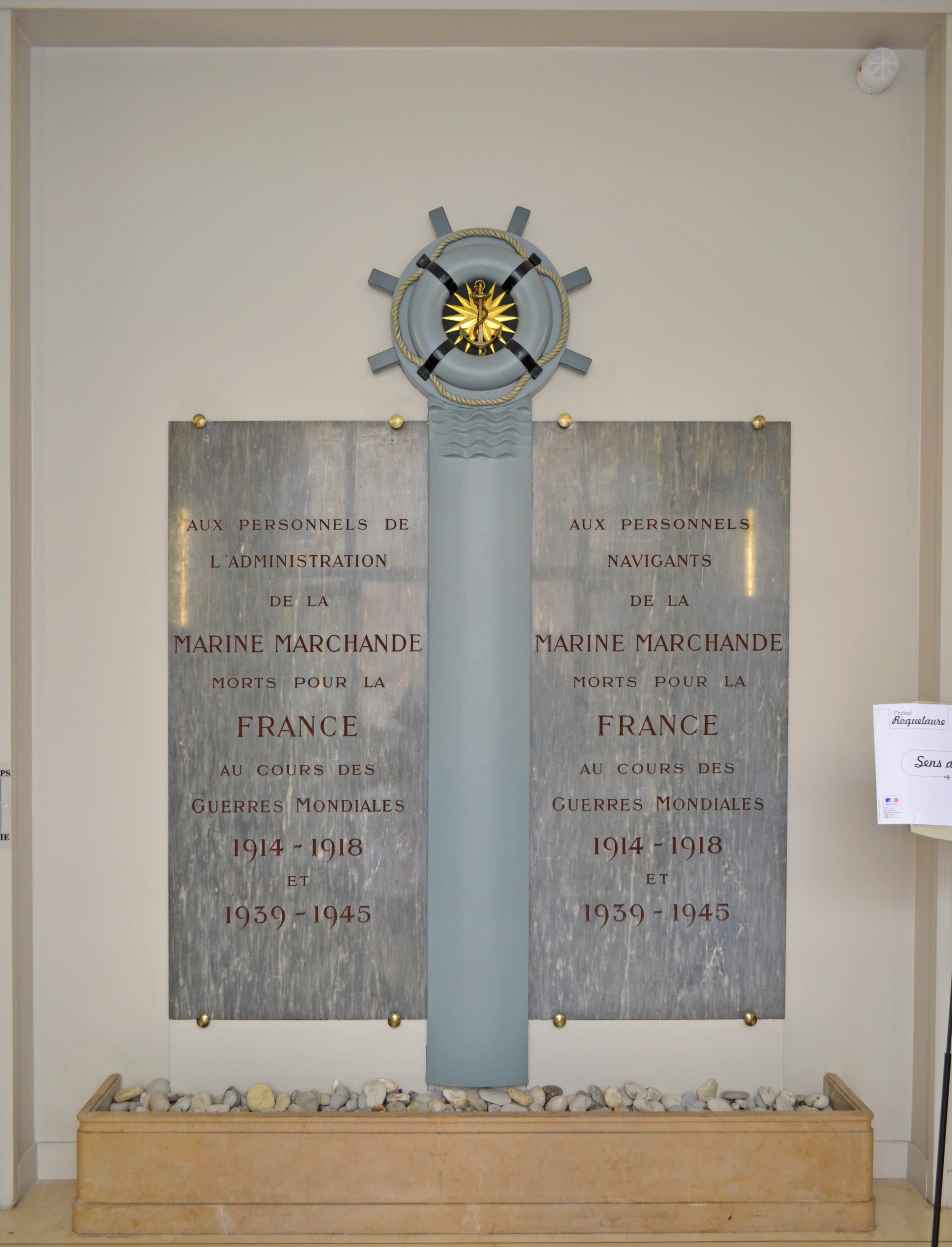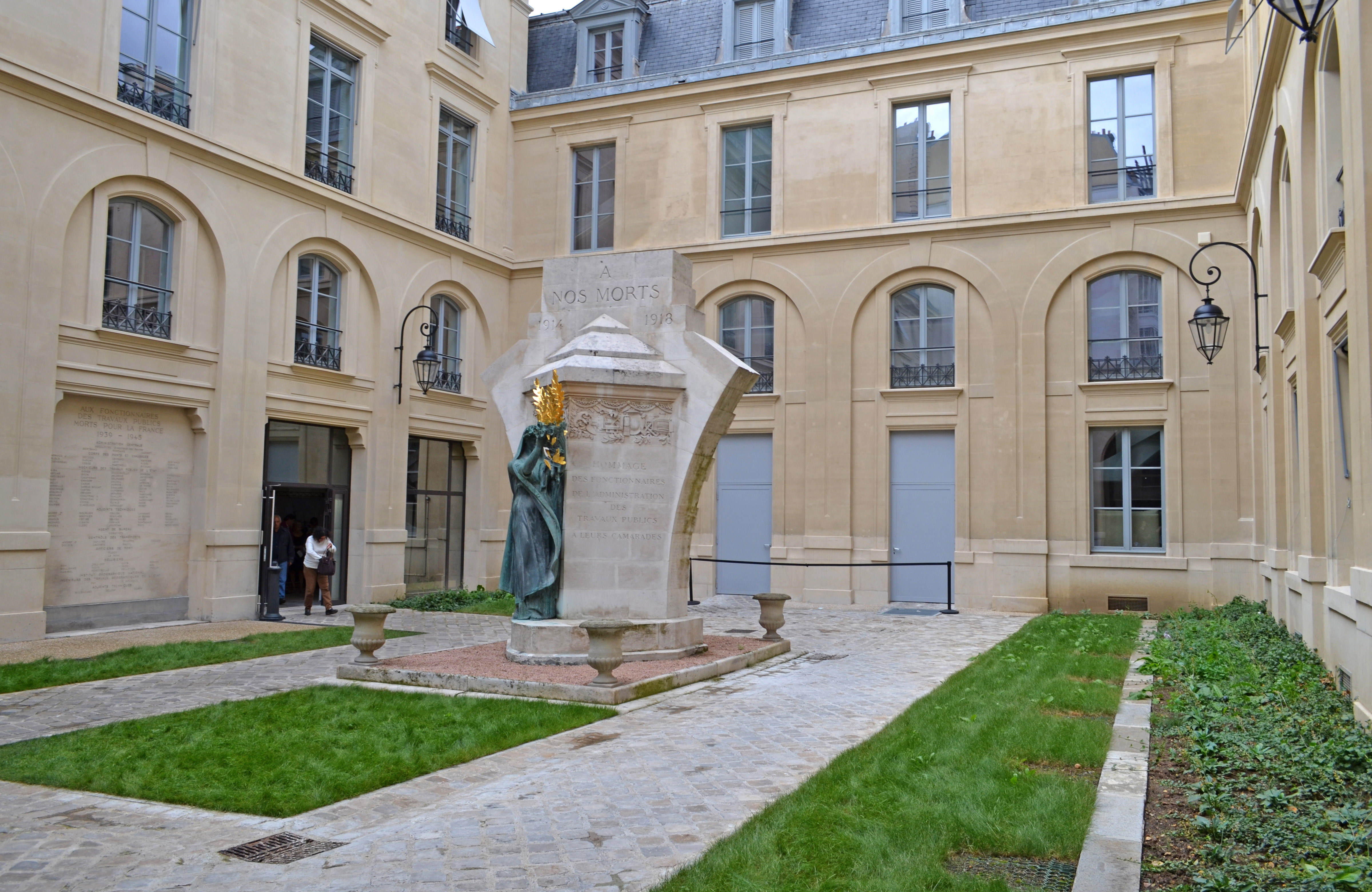 Monument 1 Épitaphe : A NOS MORTS 1914 1918 HOMMAGE DES TRAVAUX PUBLICS A LEURS CAMARADES Localisation : dans une cour intérieure du ministère des Travaux publics aujourd’hui ministère de l’Environnement, de l’Énergie et de la Mer, sis hôtel de Roquelaure, 246 boulevard Saint-Germain. Le monument est signé et daté sur le soubassement, face arrière : « 22 NOVEMBRE 1924 / A. BONNET – P. ANDRE – H. LEFEBVRE » c’est-à-dire une œuvre du sculpteur Hippolyte Lefebvre (1863-1935), prix de Rome en 1892, et des architectes A. Bonnet et P. André. Il fut inauguré par le ministre des Travaux publics, Victor Peytral, le 22 novembre 1924, date inscrite sur le soubassement du monument. Le monument prend la forme d’une pile de pont, deux fragments d’arches sur le côté, au-devant duquel on a installé une Allégorie de la Victoire, une figure monumentale en bronze qui tient dans ses mains des branches de laurier doré. Les noms de 457 défunts sont gravés sur la pile en pierre. Monument 2 Épitaphe : AUX PERSONNELS DE L’ADMINISTRATION DE LA MARINE MARCHANDE MORTS POUR LA FRANCE ET 1939 – 1945 Localisation : dans une cour intérieure du ministère des Travaux publics aujourd’hui ministère de l’Environnement, de l’Énergie et de la Mer, sise hôtel de Roquelaure, 246 boulevard Saint-Germain. Le siège de l’ancien ministère de la Marine marchande (1929-1958) était situé au numéro 3 de la place de Fontenoy, un édifice construit par André Ventre (1874-1951) et dont l'ornementation de la porte en ferronnerie a été réalisée par Raymond Subes (1891-1970). Ce monument aux morts fort simple est sans doute lié à ce lieu et à ces hommes. Il représente une barre à roue dont le support tient deux plaques métalliques comportant la même épitaphe rehaussée de rouge bordeaux. © Olivier Liardet