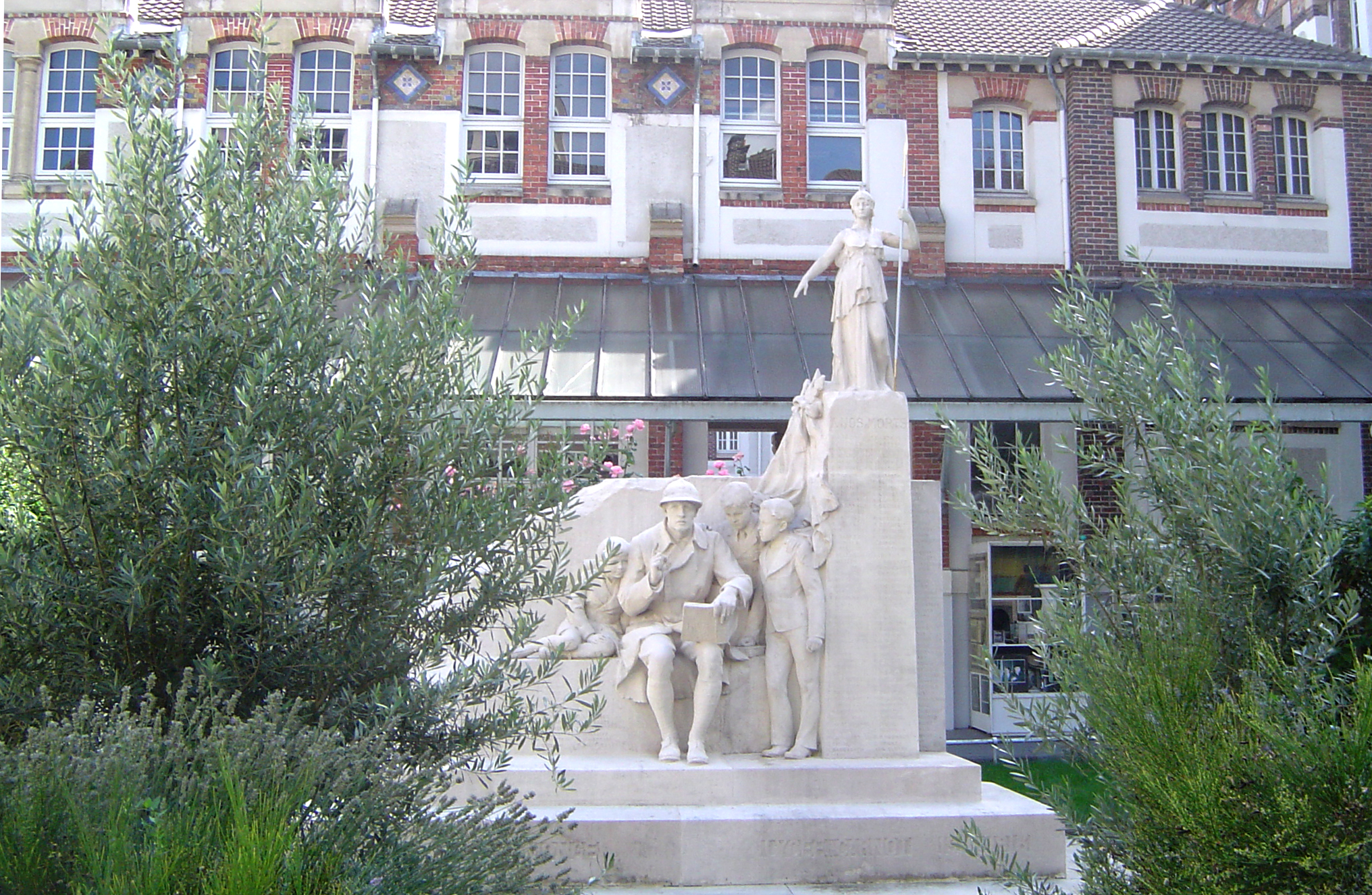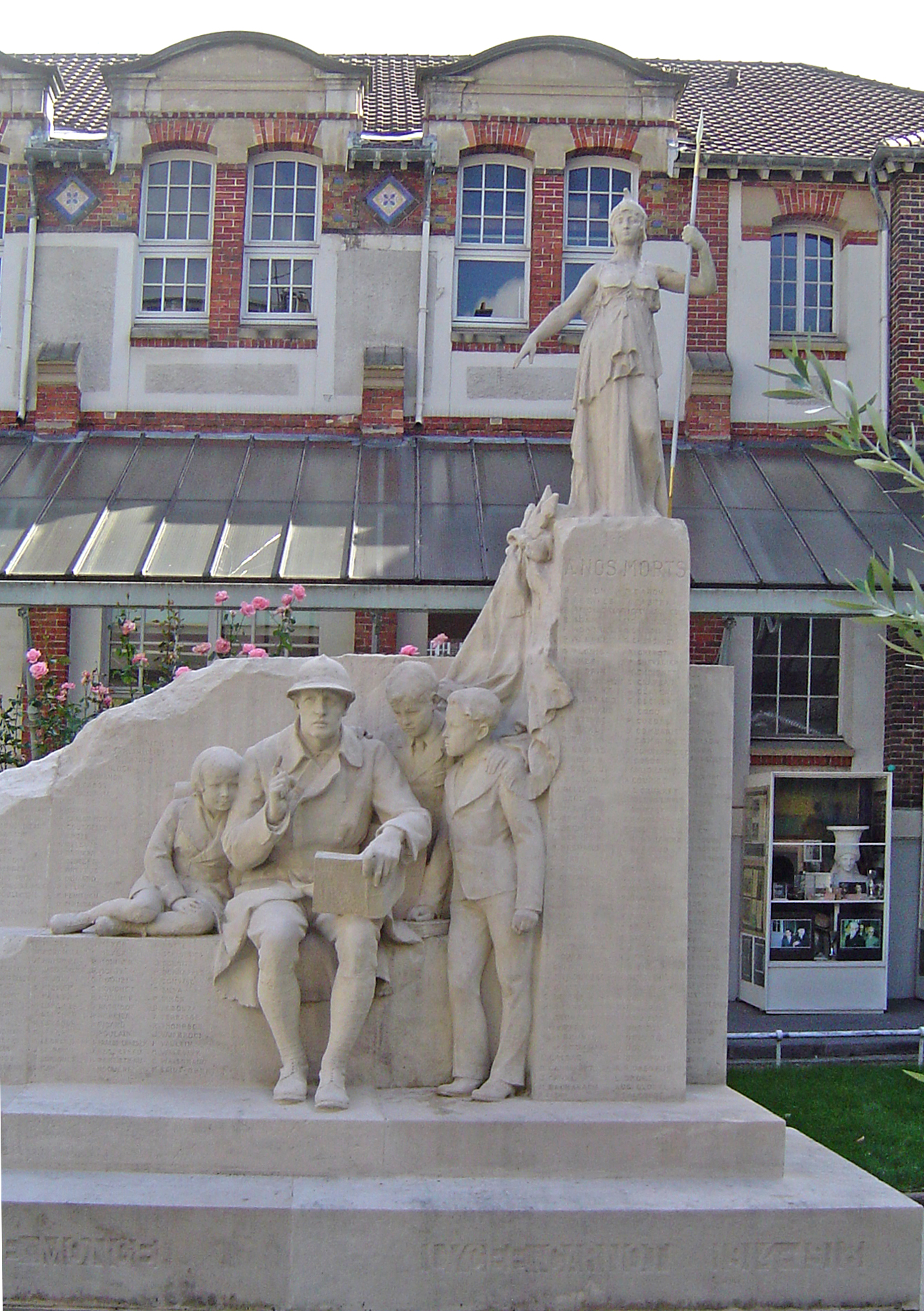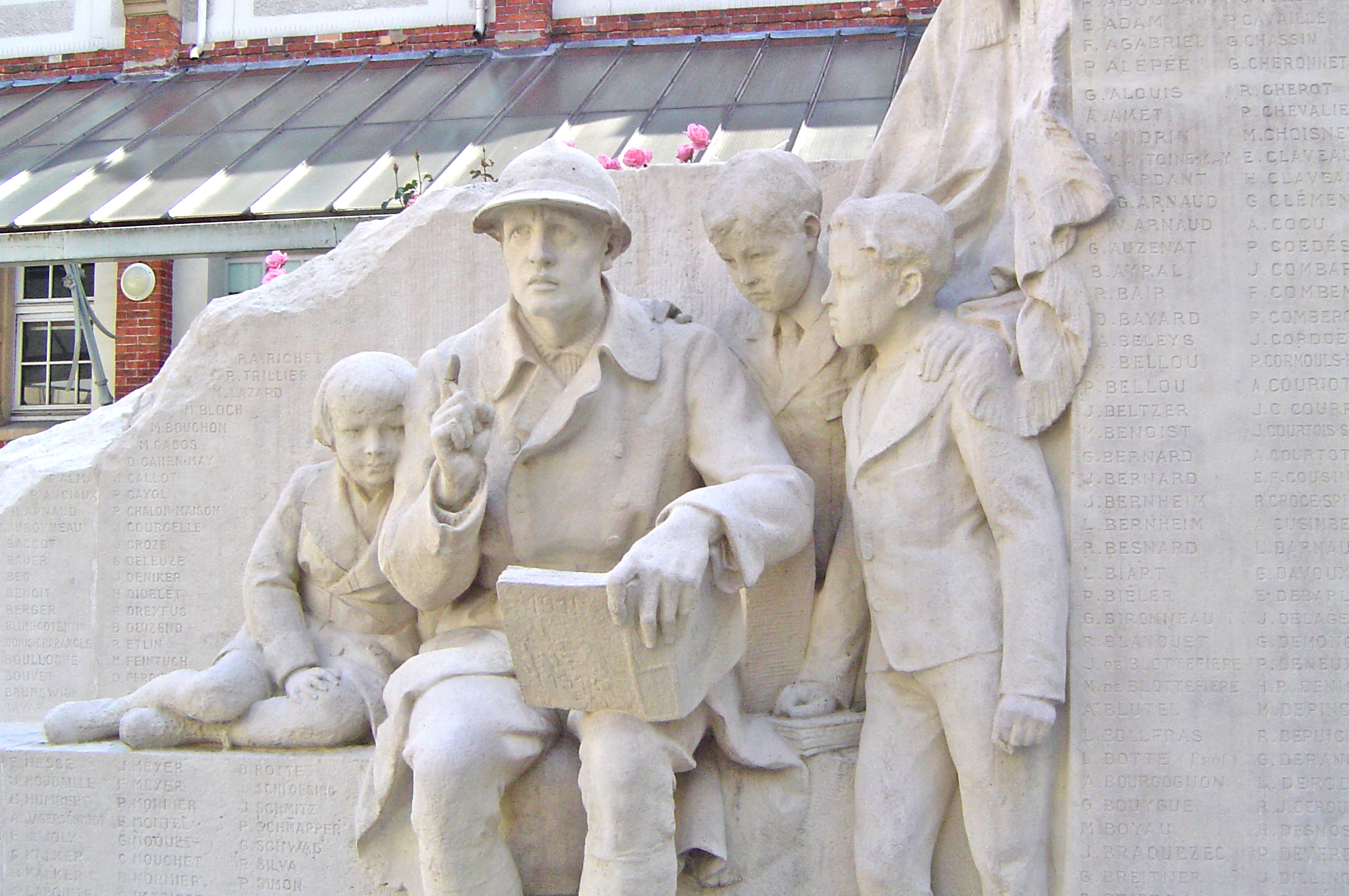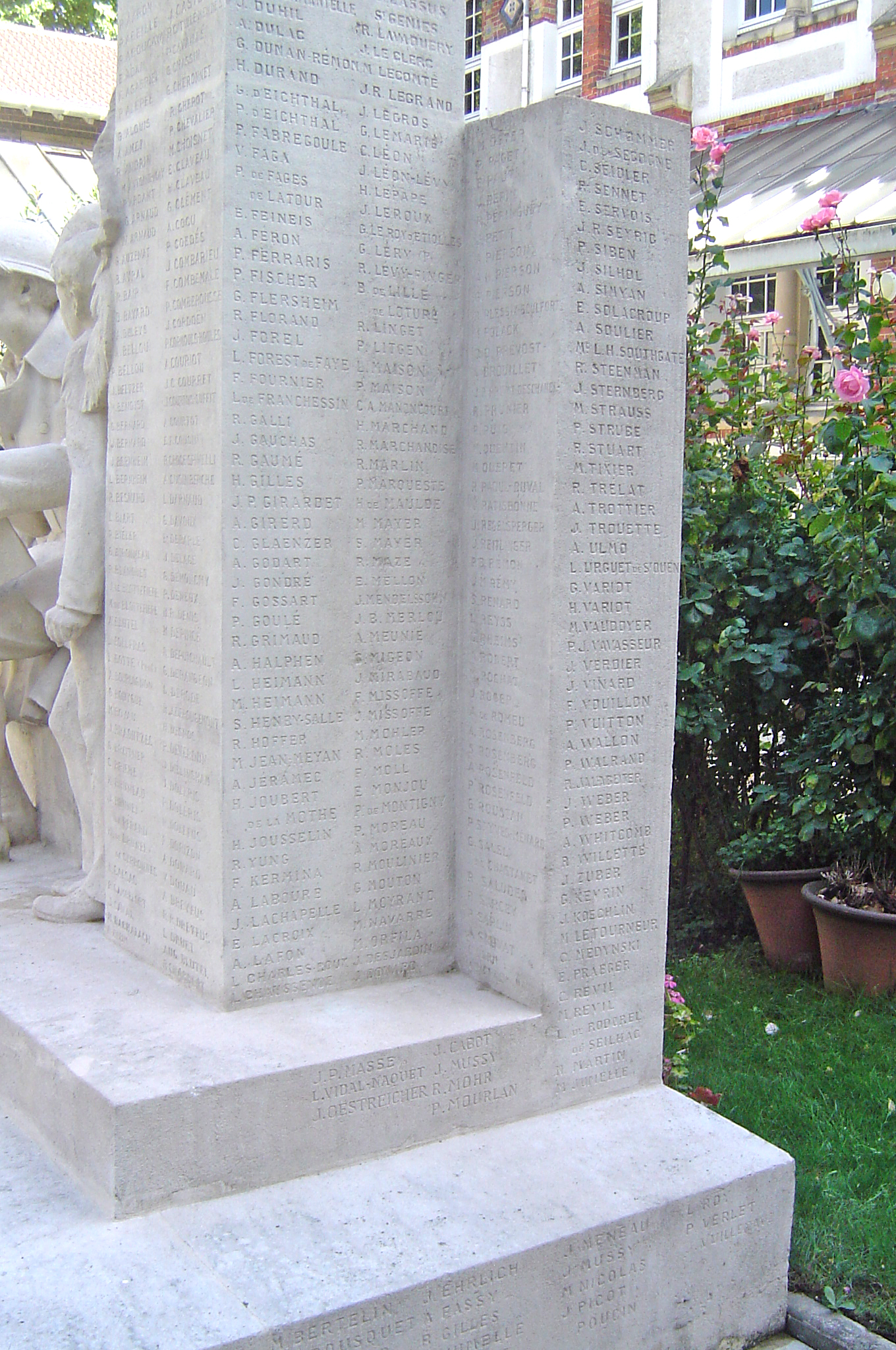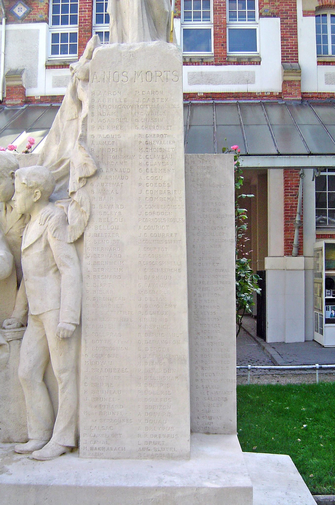 Le monument est érigé dans la cour d'honneur du lycée Carnot (qui a porté successivement les noms de Gaspard Monge puis de Lazare Carnot). En pierre et sculpté par François Cogné, il représente au pied de Pallas Athénée un poilu racontant la guerre à trois jeunes élèves, celui de gauche étant Alain Barjot (1912-2002) qui fut conseiller d'État et directeur général de la Sécurité sociale (1960-1966). Sur l’ensemble du monument sont gravés les 320 noms de victimes de la Première Guerre mondiale, les morts de la Seconde Guerre mondiale seront ajoutés par la suite. Épitaphe : Au pied de Pallas Athénée À NOS MORTS Au pied du monument ÉCOLE MONGE LYCÉE CARNOT 1914-1918 Historique : Un 'Concours pour l'érection d'un monument à la mémoire des fonctionnaires, anciens élèves et élèves du Lycée Carnot et de l'école Monge, morts pour la patrie' fut publié dans L'Architecte. Journal bimensuel de la Société centrale des architectes du 15 décembre 1919 (n° 24, p. 775-777). Le budget total était de 50.000 francs. Les délibérations eurent lieu du 1er au 10 février 1920. Les trois projets primés furent conservés par le lycée et exposés dans le parloir de l’établissement. Le commanditaire est le Comité commémoratif du Monument aux anciens élèves de Monge et de Carnot morts pour la Patrie, formé par les membres de l'Association Amicale des Anciens Élèves de l'École Monge, et par ceux de l'Association Amicale des Anciens élèves du Lycée Carnot. Le monument sera inauguré le 12 juin 1921. Une réplique originale (à échelle réduite) existe à Dombasle-sur-Meurthe (54). © F. Jiméno / DHMMA / Mairie de Paris