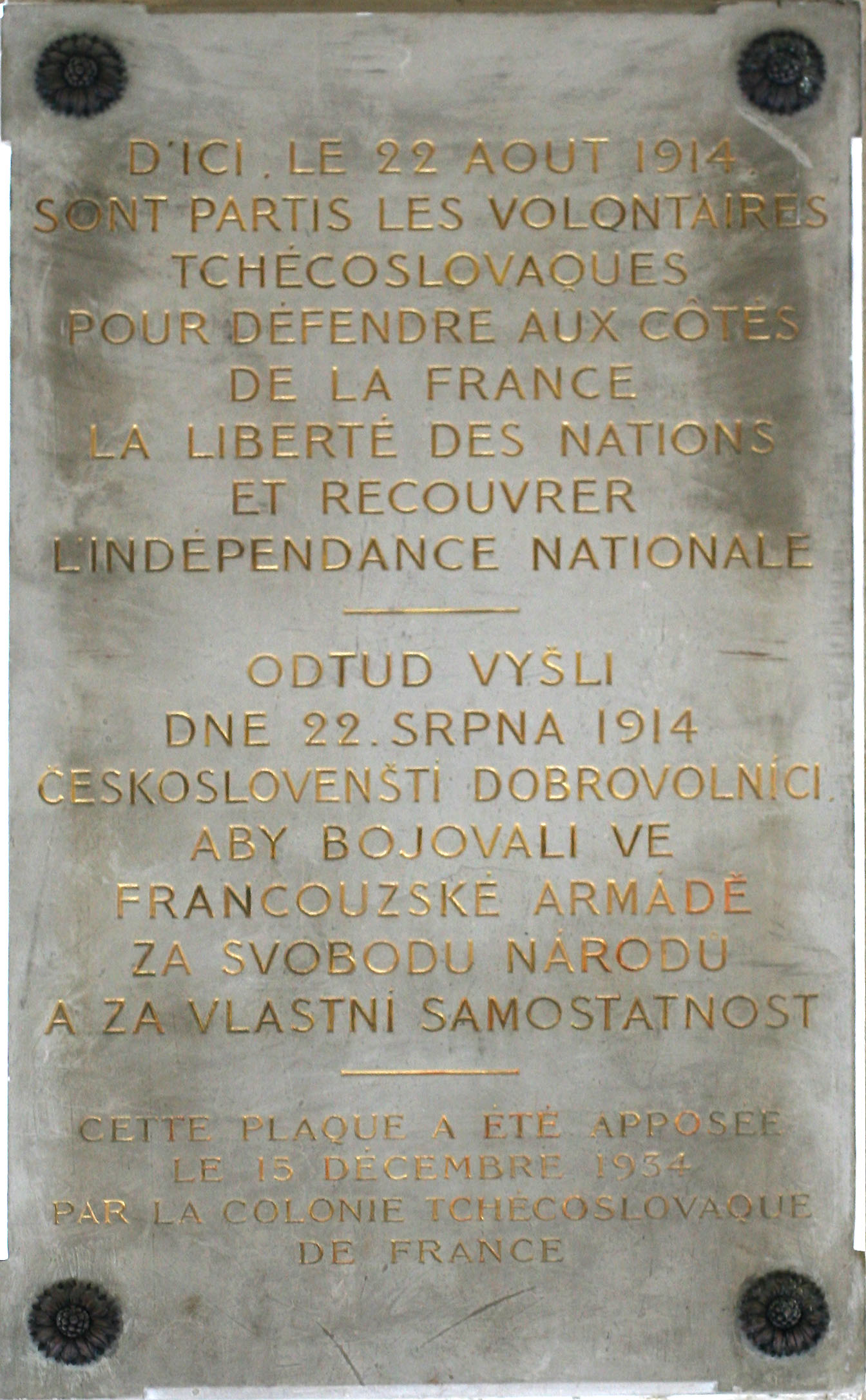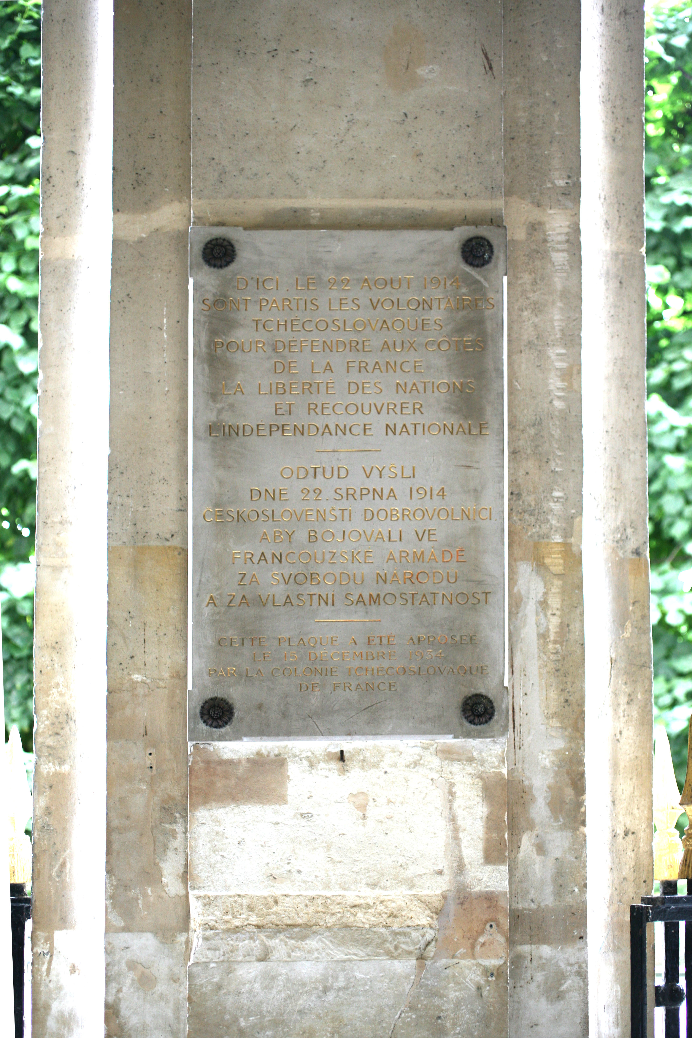 La plaque est située sous les arcades du Palais Royal, galerie de Valois. Une plaque en marbre, l'épitaphe est gravée et réchampies d'or, pour seul décoration, quatre cabochons métalliques. Épitaphe : D'ICI . LE 22 AOÛT 1914 SONT PARTIS LES VOLONTAIRES TCHÉCOSLOVAQUES POUR DÉFENDRE AUX CÔTÉS DE LA FRANCE LA LIBERTÉ DES NATIONS ET RECOUVRER L’INDÉPENDANCE NATIONALE [puis la traduction de ce texte en thèque] ODTUD VYŠLI DNE 22. SRPNA 1914 CESKOSLOVENŠTI DOBROVOLNICI ABY BOJOVALI VE FRANCOUZSKÉ ARMÁDÉ ZA SVOBODU NARODU A ZA VLASTNÍ SAMOSTATNOST CETTE PLAQUE A ÉTÉ APPOSÉE LE 15 DÉCEMBRE 1934 PAR LA COLONIE TCHÉCOSLOVAQUE DE FRANCE Historique : La plaque rend hommage à l'engagement dans la Légion étrangère de plusieurs centaines de volontaires tchèques après s'être rassemblés dans les jardins du Palais Royal pour offrir leur aide à la France. Bibliographie : Jean-Philippe Namont, ' La colonie tchécoslovaque en France pendant la Première Guerre mondiale', Guerres mondiales et conflits contemporains, Paris, PUF, n° 216, 2004, p. 41-57. © M. Aynié / DHMMA / Mairie de Paris