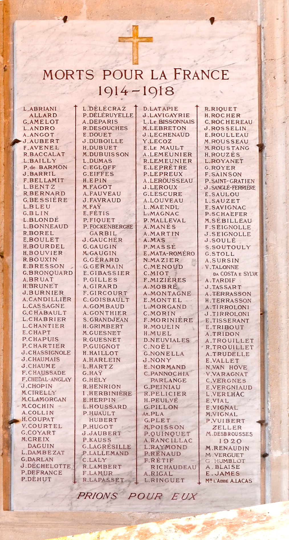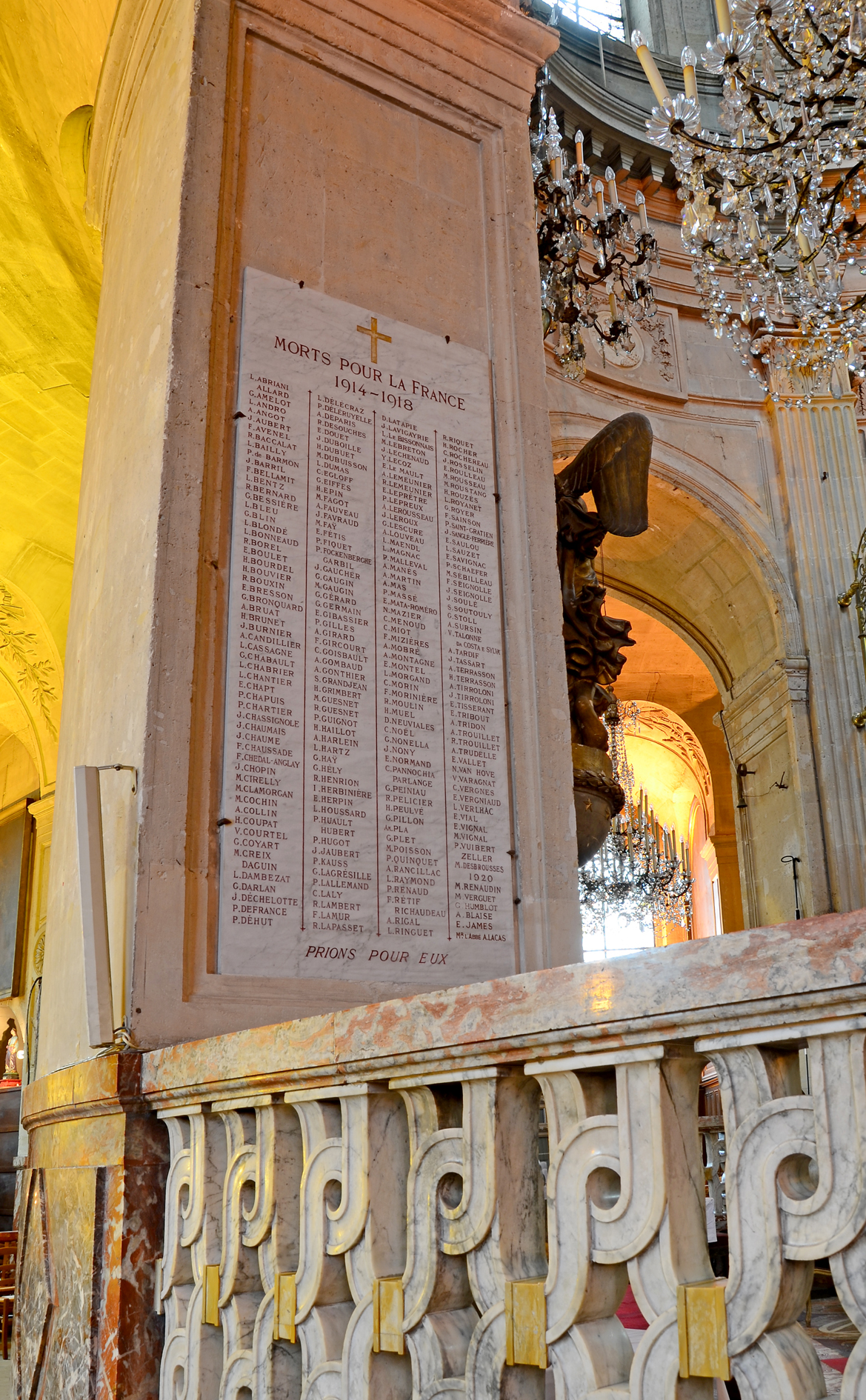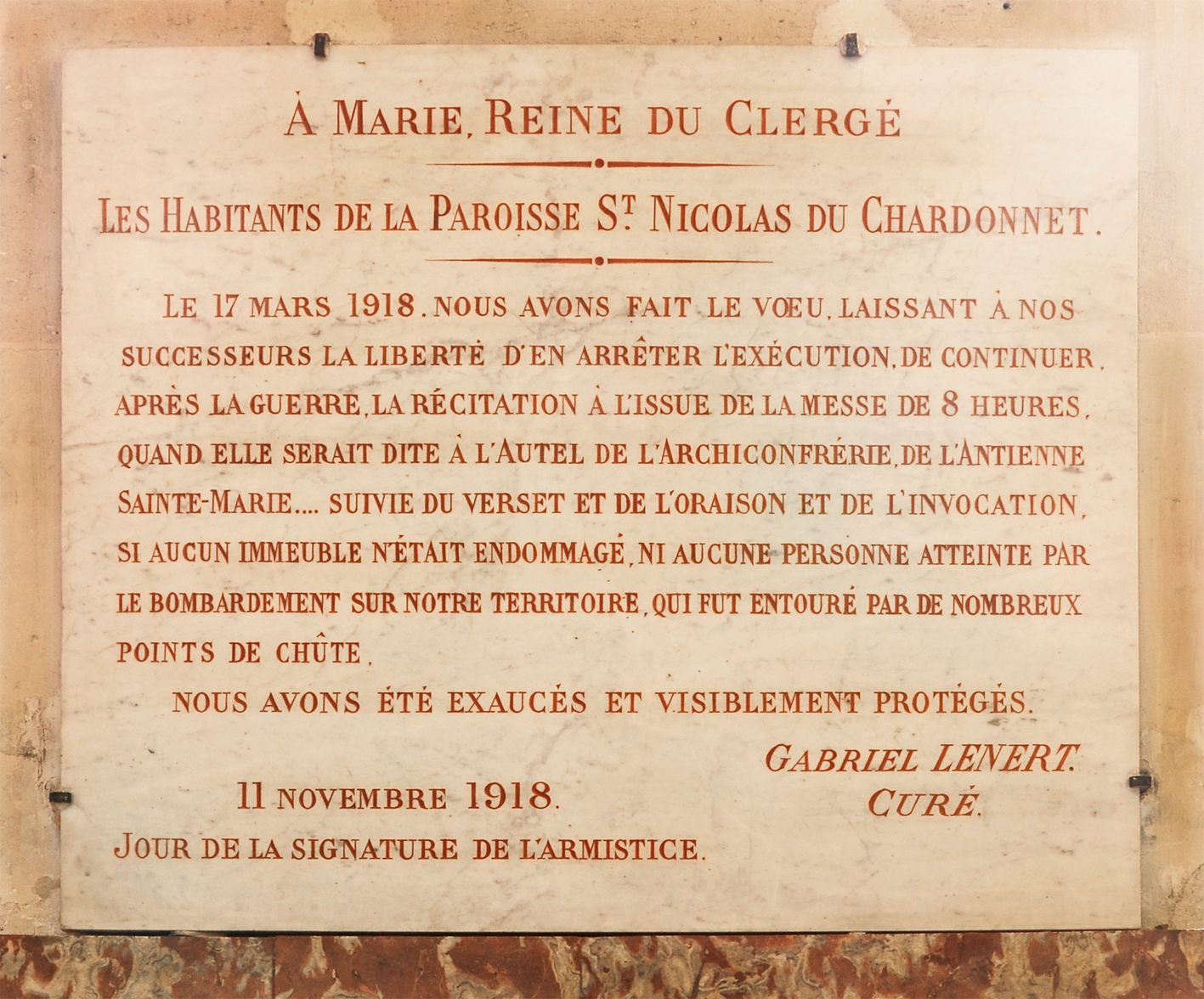 Plaque 1 : Épitaphe : À MARIE, REINE DU CLERGÉ LES HABITANTS DE LA PAROISSE ST. NICOLAS DU CHARDONNET. LE 17 MARS 1918. NOUS AVONS FAIT LE VŒU, LAISSANT À NOS SUCCESSEURS LA LIBERTÉ D’EN ARRÊTER L’EXÉCUTION, DE CONTINUER, APRÈS LA GUERRE, LA RÉCITATION À L’ISSUE DE LA MESSE DE 8 HEURES, QUAND ELLE SERAIT DITE À L’AUTEL DE L’ARCHICONFRÉRIE, DE L’ANTIENNE SAINTE-MARIE… SUIVIE DU VERSET ET DE L’ORAISON ET DE L’INVOCATION, SI AUCUN IMMEUBLE N’ÉTAIT ENDOMMAGÉ, NI AUCUNE PERSONNE ATTEINTE PAR LE BOMBARDEMENT SUR NOTRE TERRITOIRE, QUI FUT ENTOURÉ PAR DE NOMBREUX POINTS DE CHÛTE. NOUS AVONS ÉTÉ EXAUCÉS ET VISIBLEMENT PROTÉGÉS. GABRIEL LENERT. CURÉ. 11 NOVEMBRE 1918. JOUR DE LA SIGNATURE DE L’ARMISTICE. Localisation : Déambulatoire, contre le pilier situé entre la chapelle Saint-Clair et la chapelle Saint-Charles. Description : Plaque de marbre blanc légèrement veiné de noir, lettres gravées et réhaussées de rouge bordeaux. Dimensions : h. 101 x l. 120 x p. 2 cm. Plaques 2 : Épitaphe : MORTS POUR LA FRANCE 1914 - 1918 PRIONS POUR EUX Localisation : Déambulatoire, face à la plaque précédente, contre le pilier situé dans le choeur liturgique. Description : Plaque de marbre blanc légèrement veiné de noir, lettres gravées et réhaussées de rouge bordeaux, croix latine gravée et dorée. 226 défunts sont mentionnés. © F. Jimeno / DHMMA / Mairie de Paris.