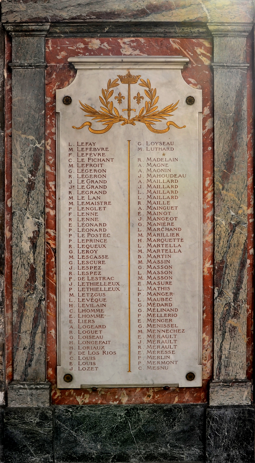 Localisation : Bas-côté droit, 4e chapelle, aujourd’hui consacrée à Sainte-Jeanne d’Arc, en 1919, à Saint-Maurice et à la bienheureuse Jeanne d’Arc Épitaphe : SOUVENONS-NOUS DEVANT DIEU DES PAROISSIENS DE St. SULPICE MORTS POUR LA FRANCE La décision d’aménager une chapelle du souvenir est annoncée dans le bulletin paroissial du 25 octobre 1919 : « Une plaque en marbre portant les noms de nos morts sera placée en cette même chapelle. M. le Curé ne peut inscrire que les noms des morts – de la paroisse – et sur la demande de leurs parents les plus proches. Les parents qui désirent cette inscription sont donc priés de remettre leur demande sans délai à la Sacristie [sic.] : marquer nettement le nom à inscrire – aussi le prénom usuel, signer lisiblement – nom et adresse. M. le Curé a la confiance que les paroissiens de S.-Sulpice couvriront largement les frais de ce monument, de sorte que riches et pauvres puissent être également inscrits. Dans l’inscription on suivra simplement l’ordre alphabétique. » Monsieur le curé réitéra sa demande dans le bulletin paroissial du 25 novembre 1919. Un témoignage intéressant qui illustre bien la méthode employée par la plupart des paroisses parisiennes pour aménager dans leurs églises qui une chapelle du souvenir, qui une plaque ou une stèle, assez rapidement d’ailleurs, la plupart sont datables entre 1920-1921. L’ensemble de la chapelle est orné de 7 plaques en marbre blanc, les noms gravés des défunts réchampis de rouge, les décors et l’épitaphe réchampis d’or. Les plaques sont posées sur des parements de marbre rouges encadrés de pilastres de marbre noir veiné de blanc. Sur le mur de gauche, dans l’axe, se situe l’épitaphe et les seuls décors, des branches de laurier et de chêne nouées par un ruban encadrent les dates 1914 et 1918. Les trois autres plaques sont décorées d'un glaive reposant sur des branches de lauriers nouées par un phylactère, il supporte une couronne, de chaque côté deux fleurs de lys. La chapelle mentionne les noms de 716 personnes. © Frédéric Jimeno / CHVP / Maire de Paris.