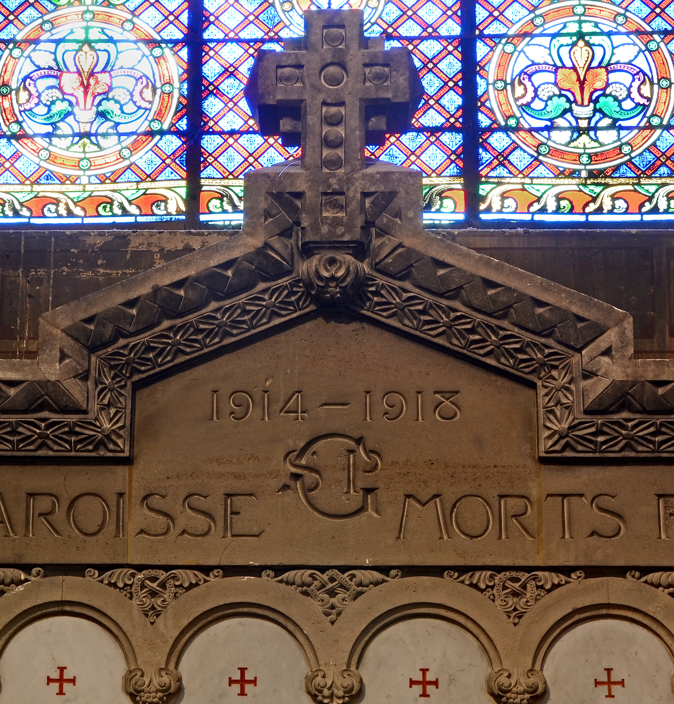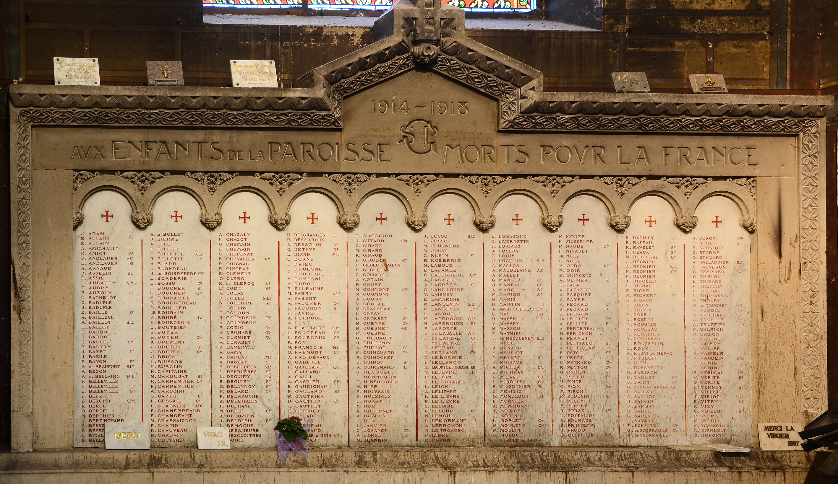 Grande retable en pierre décoré par une arcature encadrée d’une corniche décorée de fleurs stylisées, l’épitaphe se trouve au niveau de l’entablement, juste au-dessus de lui, un fronton, une croix. Les 10 plaques sont en marbre blanc, les noms des défunts réchampis de rouge. Le monument rend hommage à 424 paroissiens. Épitaphe : 1914 – 1918 AUX ENFANTS DE LA PAROISSE SGP MORTS POUR LA FRANCE Localisation : Bas-côté droit, première travée. © F. Jimeno / CHVP / Mairie de Paris