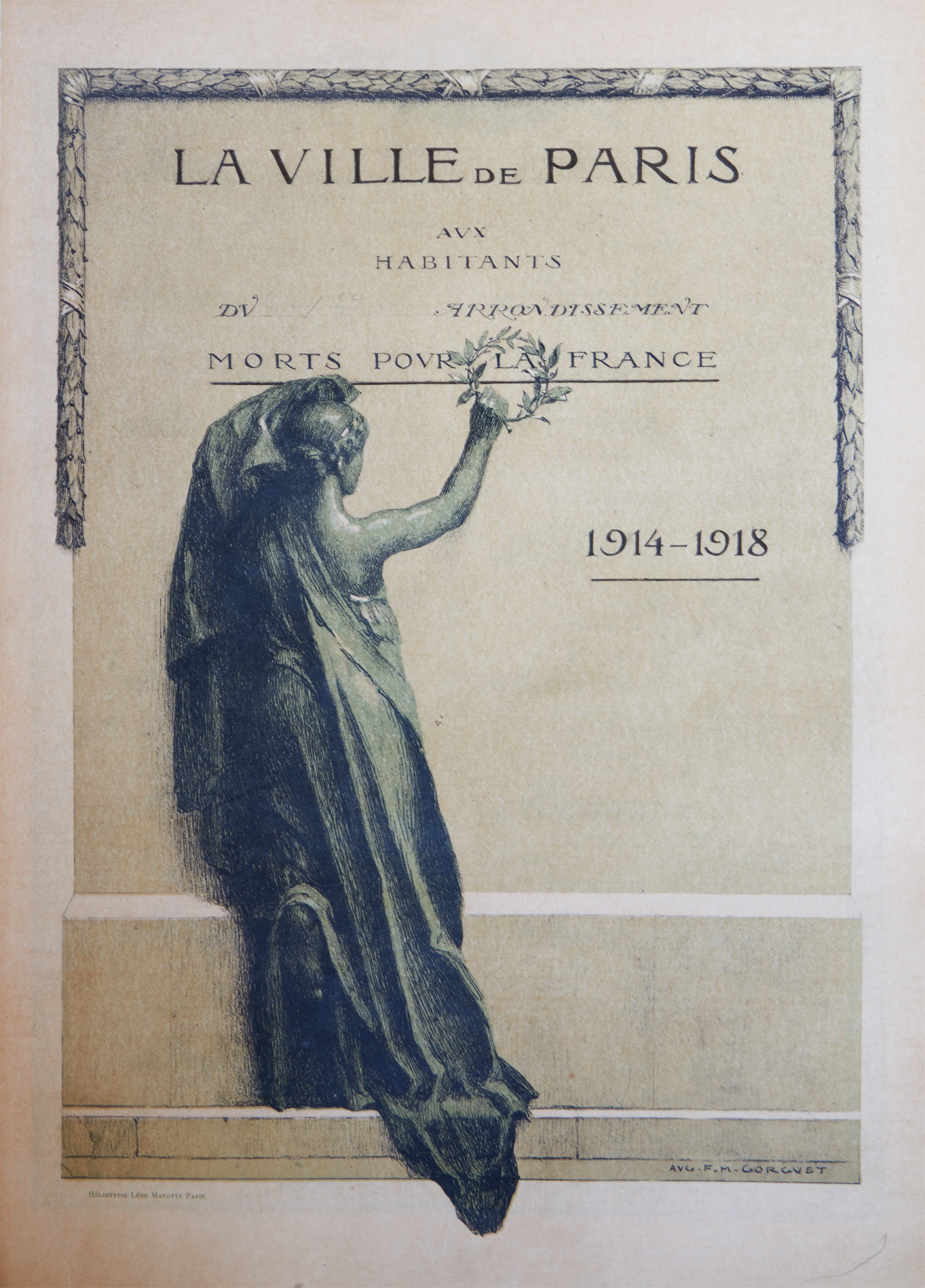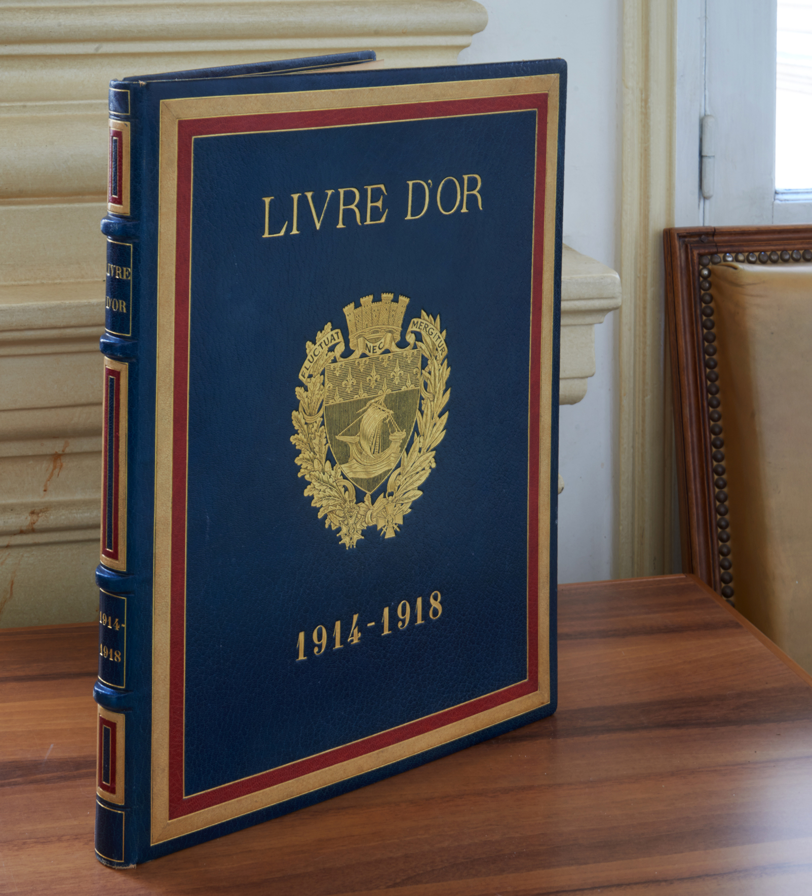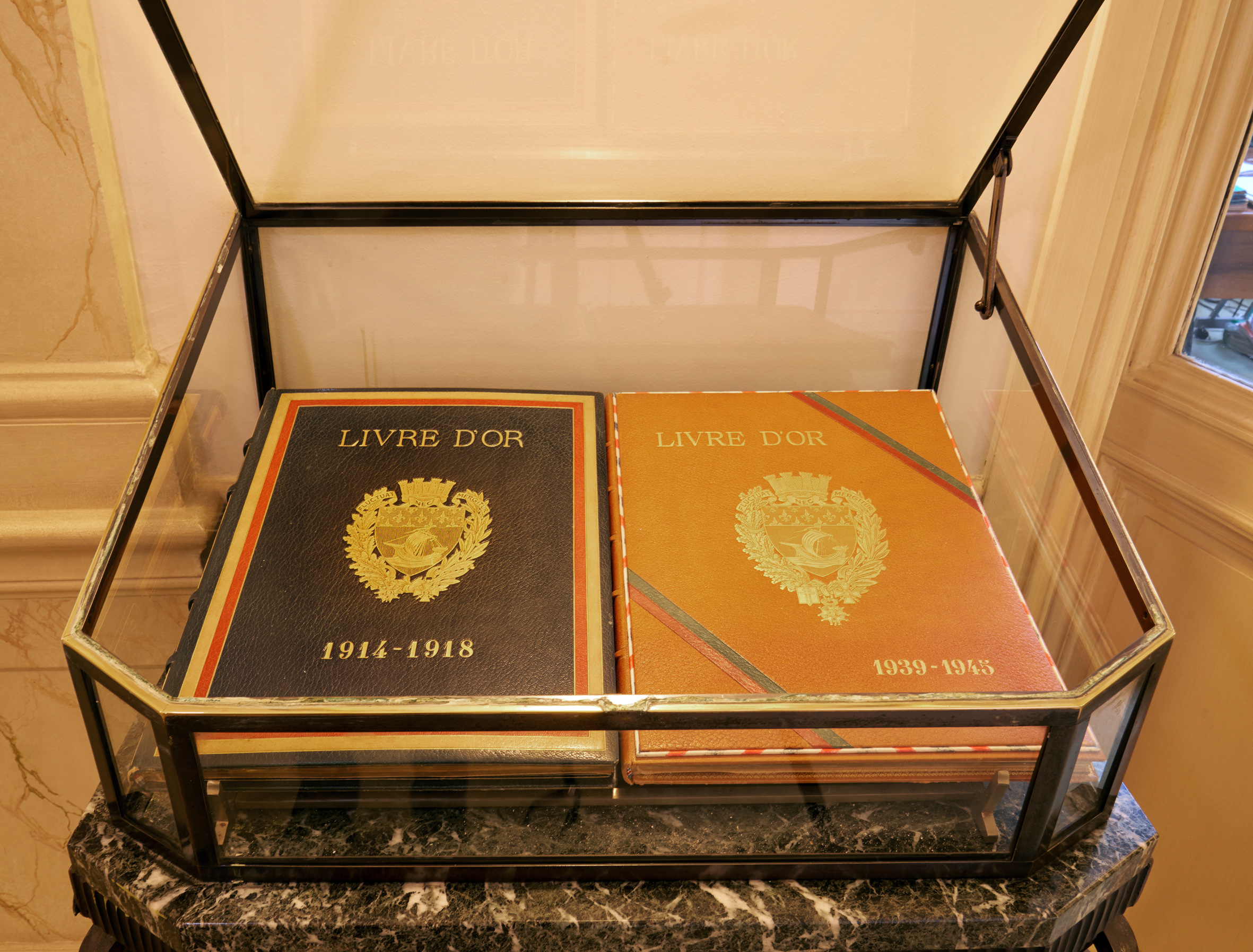 Le livre d'or est placé dans sa vitrine historique dans le couloir du premier étage de la mairie. Il est associé au livre d'or de la Seconde Guerre mondiale. Le registre : La couverture est en cuir aux couleurs du drapeau français, rehaussée d’or et illustrée du blason de la capitale. Celui-ci est composé de la nef, entourée de deux branches de chêne (symbolisant la puissance) et de laurier (de la victoire) auxquelles sont accrochées la Croix de la Légion d’honneur (décret du 9 octobre 1900) et la Croix de Guerre (décret du 28 juillet 1919). Les pages intérieures : Le frontispice type des livres d’or, sur lequel était ajouté à la main le nom de l’arrondissement, représente une figure féminine symbolisant le deuil et la victoire brandissant la couronne honorifique de laurier. La technique utilisée est l'héliotypie réalisée par F.M. Gorguet. Vient ensuite la liste par ordre alphabétique des soldats morts pour la France : son nom est suivi de son prénom, de son adresse parisienne, de son régiment et du lieu de sa mort quand il est connu. La vitrine, conçue spécialement, est identique à la plupart de celles réalisées dans les autres mairies d'arrondissement : plateau de marbre vert veiné blanc sur un pied en ferronnerie ouvragée Accessibilité : Les livres d’or sont accessibles et consultables par demande effectuée dans chaque mairie d’arrondissement. Veuillez contacter chaque mairie pour connaître les modalités de consultation qui leur sont propres. Photographies © C. Pignol / COARC / Mairie de Paris