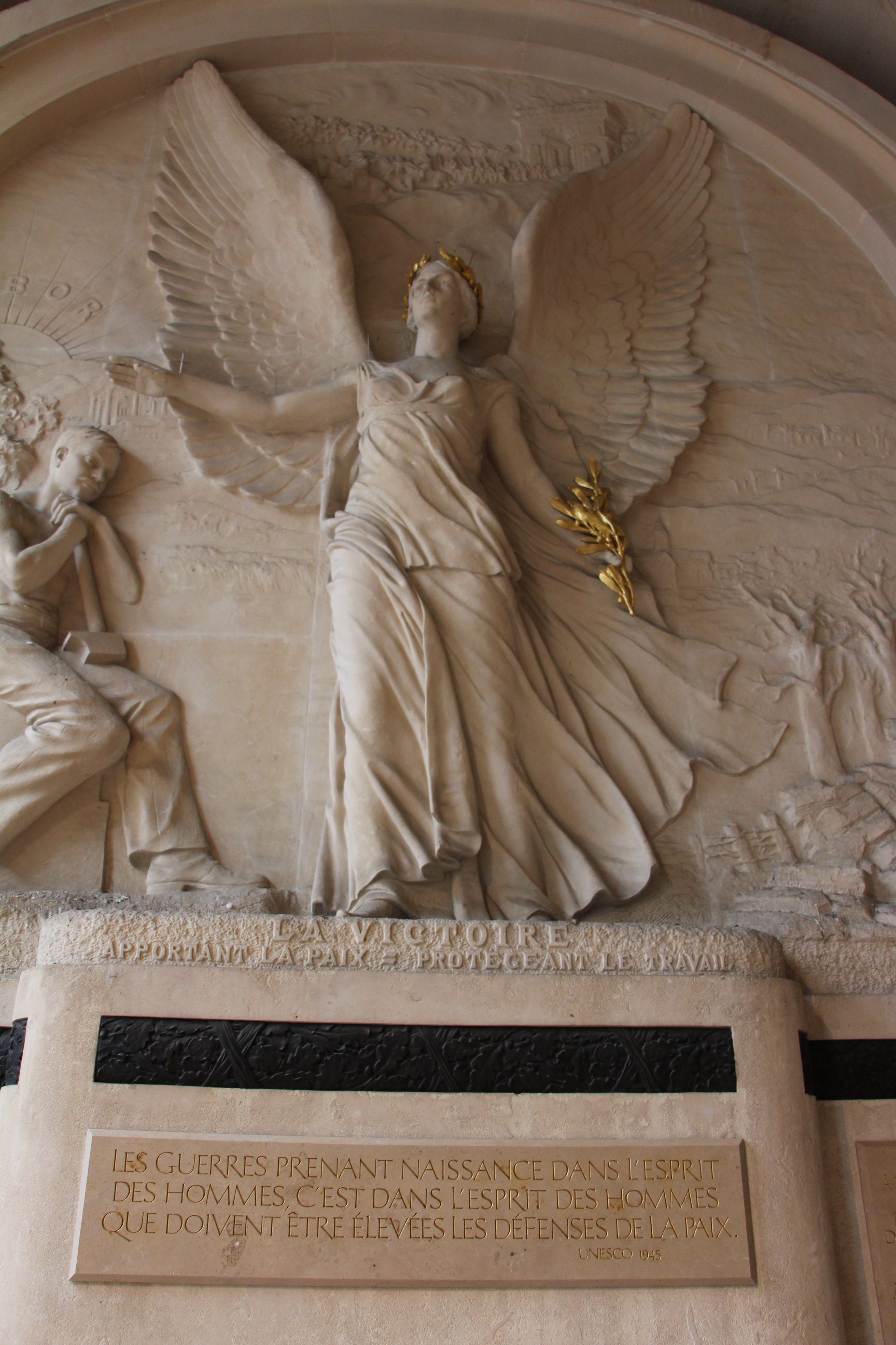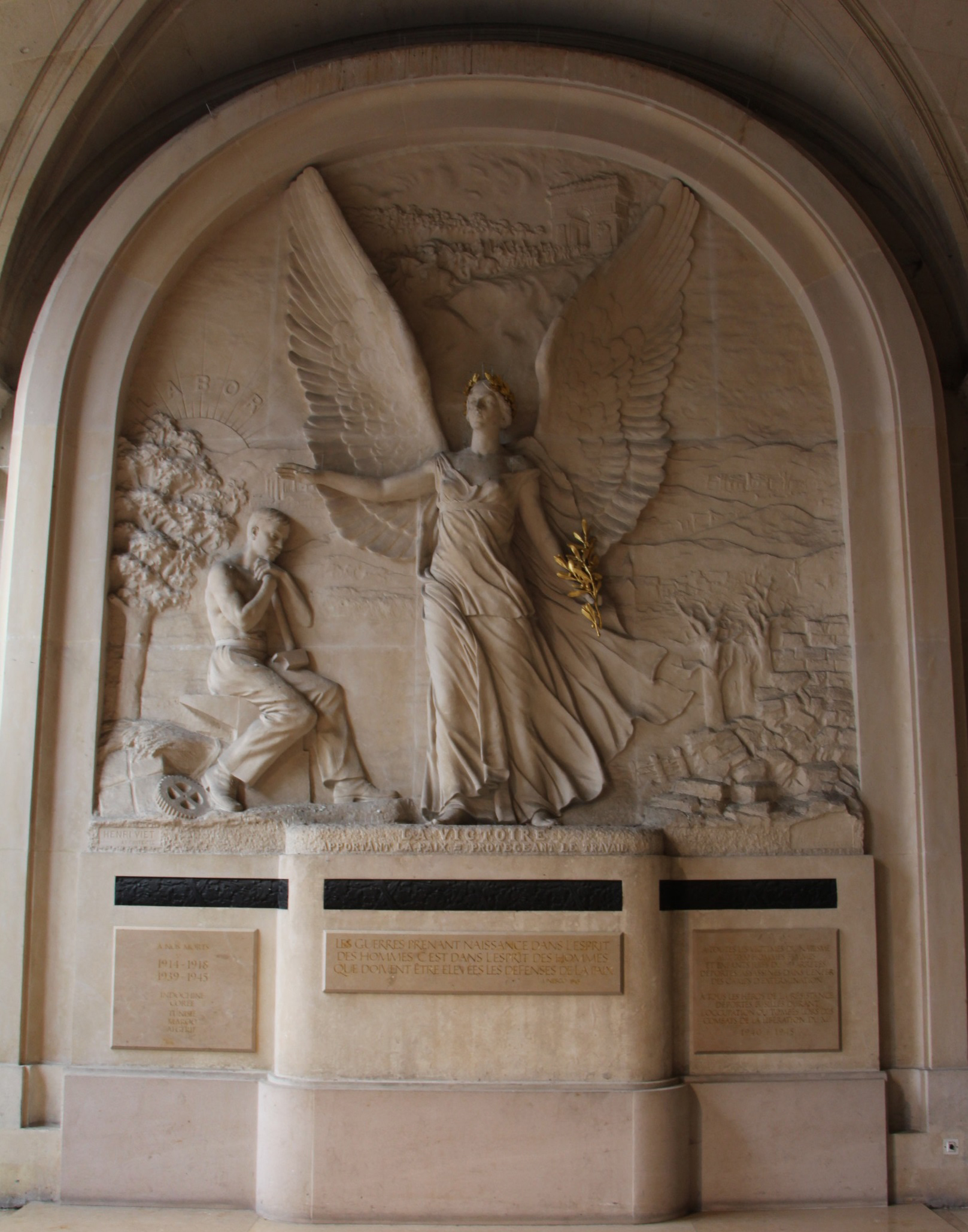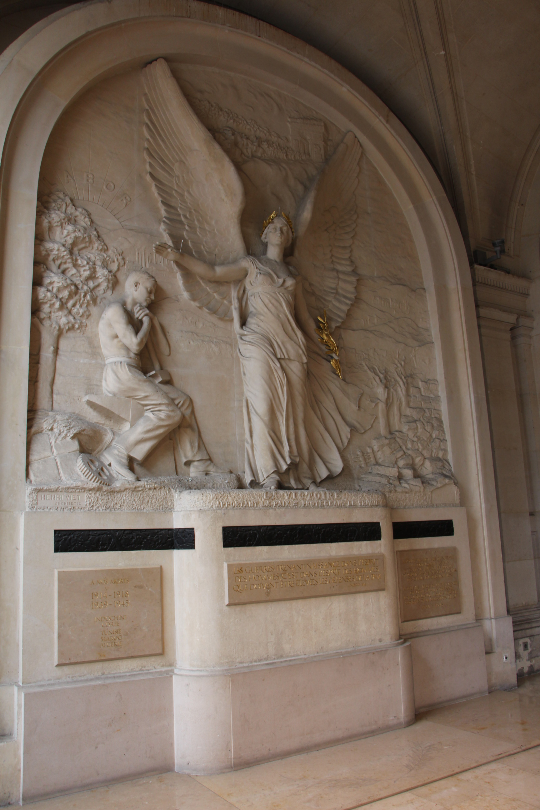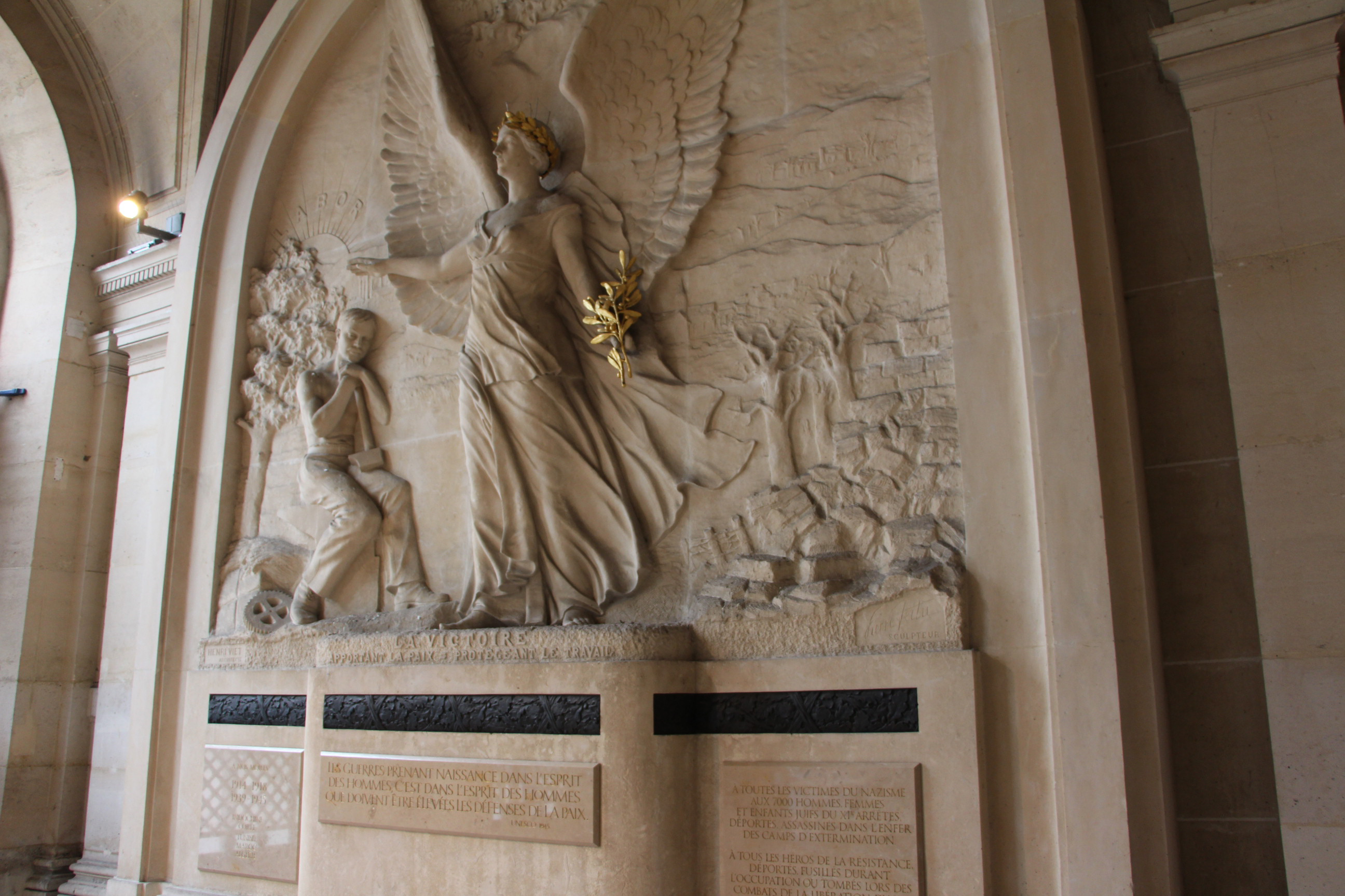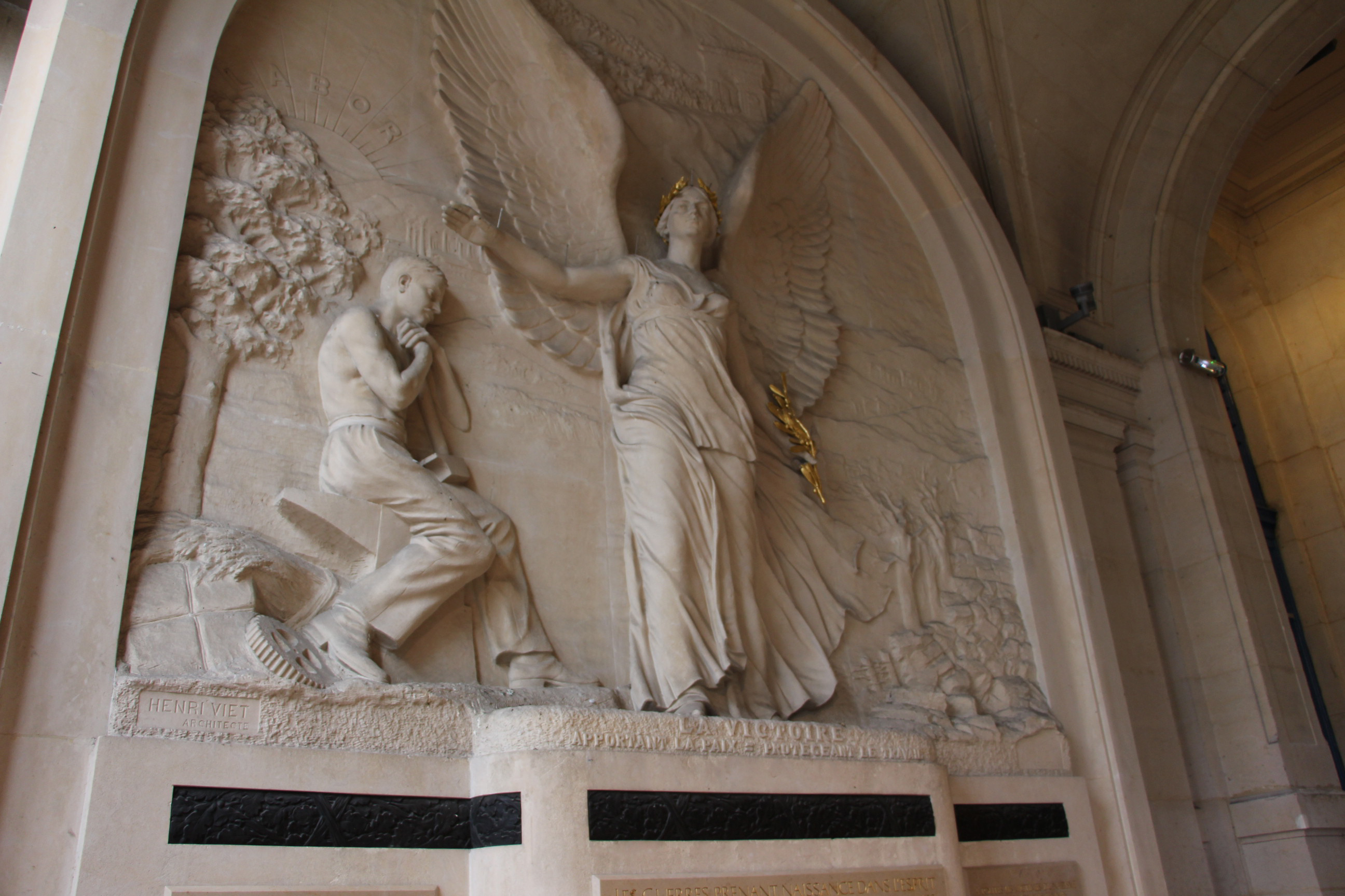 Le monument est constitué d’un haut-relief en pierre représentant une Victoire ailée s’approchant d’un ouvrier. La couronne de la Victoire ainsi que la palme dorée qu'elle tient dans ses mains sont dorées. A droite, on observe un champ de ruines, un village, au-dessus de la Victoire, l'armée française défile sous l'Arc de Triomphe, à gauche, un ouvrier, ou plutôt un maréchal-ferrant est assis sur une enclume, un marteau dans les mains, un engrenage à ses pieds, il attend sous un arbre, pensif que la paix revienne afin de se remettre au travail. Au fond, le soleil se lève, sur les rayons il est écrit : 'LABOR'. Le monument est clairement signé, en bas à gauche 'HENRI VIET ARCHITECTE' et en bas à droite, 'PIERRE FEITU SCULPTEUR'. Sur le socle figure trois bas-relief métalliques représentant des feuilles maintenues par des rubans, puis trois plaques comportant des épitaphes toutes postérieures au monument lui-même. Le monument comporte une première épitaphe dans le haut-relief lui-même, juste en dessous de la Victoire. A ce sujet, comme le précise Henri Viet, architecte du monument et maire de l’arrondissement : « Nous aurions voulu que les noms de ces libérateurs de notre territoire, mentionnés au Livre d’or déposé dans chaque mairie de Paris, fussent également, ainsi que cela a été fait dans beaucoup de communes, inscrits sur le monument qui éternise leur mémoire, mais trop considérable était leur nombre (plus de 12 000 dans notre grande famille du XIe) et c’est surtout dans notre cœur que devra rester gravé le souvenir de ceux qui firent partie de cette phalange sacrée. » Epitaphes : Épitaphe 1 : LA VICTOIRE APPORTANT LA PAIX = PROTEGEANT LE TRAVAIL Épitaphe 2 : À nos morts 1914-1918 1939-1945 Indochine Corée Tunisie Maroc Algérie Épitaphe 3 : LES GUERRES PRENANT NAISSANCE DANS L'ESPRIT DES HOMMES C'EST DANS L'ESPRIT DES HOMMES QUE DOIVENT ÊTRE ÉLEVÉES LES DÉFENSES DE LA PAIX UNESCO 1945 Épitaphe 4 : À TOUTES LES VICTIMES DU NAZISME AUX 7000 HOMMES, FEMMES ET ENFANTS JUIFS DU XIe ARRÊTÉS, DÉPORTÉS, ASSASSINÉS DANS L'ENFER DES CAMPS D'EXTERMINATION. À TOUS LES HÉROS DE LA RÉSISTANCE, DÉPORTÉS, FUSILLÉS DURANT L'OCCUPATION, OU TOMBÉS LORS DES COMBATS DE LA LIBÉRATION DU XIe 1940-1945. Inauguration : La maquette du monument fut exposée au rez-de-chaussée de la mairie du 11e arrondissement en 1926 (Le Petit Parisien, 21 janvier 1926, p. 3). Le monument lui-même fut inauguré le 1er novembre 1928 en présence d’Henri Paté, vice-président de la Chambre des députés et de nombreuses autres personnalités. La musique du 46e Régiment d’infanterie et Madeleine Roche, sociétaire de la Comédie française, ont prêté leur concours à la cérémonie qui est transcrite dans le BMO du 28 novembre 1928 (p. 4509-4512). © Vincent Nierat / Mairie du 11e arrondissement