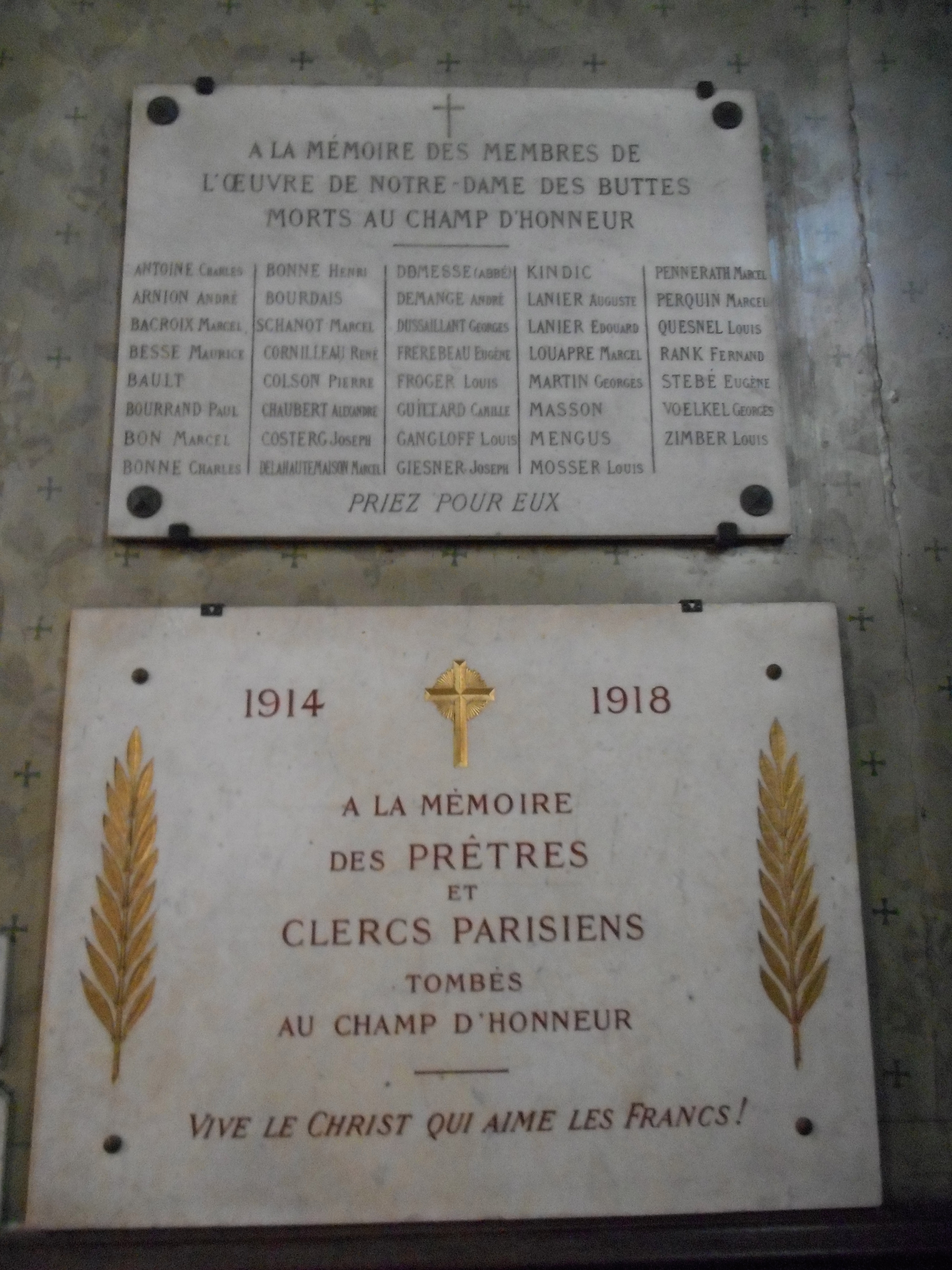 Le monument est situé dans une chapelle consacrée à Saint-François d'Assise, sur le bas-côté gauche (2e travée) et se compose de trois plaques : La première plaque, sur le mur de gauche, est en marbre blanc (h. 80 x l. 110 cm), et décorée de deux palmes et d'une croix-auréolée gravées et réchampies d'or. Épitaphe : 1914 1918 A LA MEMOIRE DES PRETRES ET CLERCS PARISIENS TOMBES AU CHAMPS D'HONNEUR VIVE LE CHRIST QUI AIME LES FRANCS ! La deuxième plaque, apposée juste au-dessus de la première, de marbre blanc (h. 75 x l. 100 cm), est décorée d'une croix gravée. 39 noms y sont inscrits. Épitaphe : A LA MEMOIRE DES MEMBRES DE L'OEUVRE DE NOTRE-DAME DES BUTTES MORTS AU CHAMP D'HONNEUR PRIEZ POUR EUX La troisième plaque, sur le mur de droite, est en marbre blanc (h. 155 x l. 170 cm), et décorée de deux palmes réchampies d'or reliées par une croix. 191 noms sont inscrits. Épitaphe : AUX SOLDATS DE LA PAROISSE MORTS POUR LA PATRIE 1914 1918 [liste des soldats] NOUS UNISSONS DANS LE MÊME SOUVENIR LES 1394 AUTRES FRÈRES D'ARMES ET LES PAROISSIENS VICTIMES DES BOMBARDEMENTS HEUREUX CEUX QUI SONT MORTS DANS UNE JUSTE GUERRE COUCHÉS DESSUS LE SOL À LA FACE DE DIEU CH. PÉGUY © D. Grenèche / DHMMA / Mairie de Paris