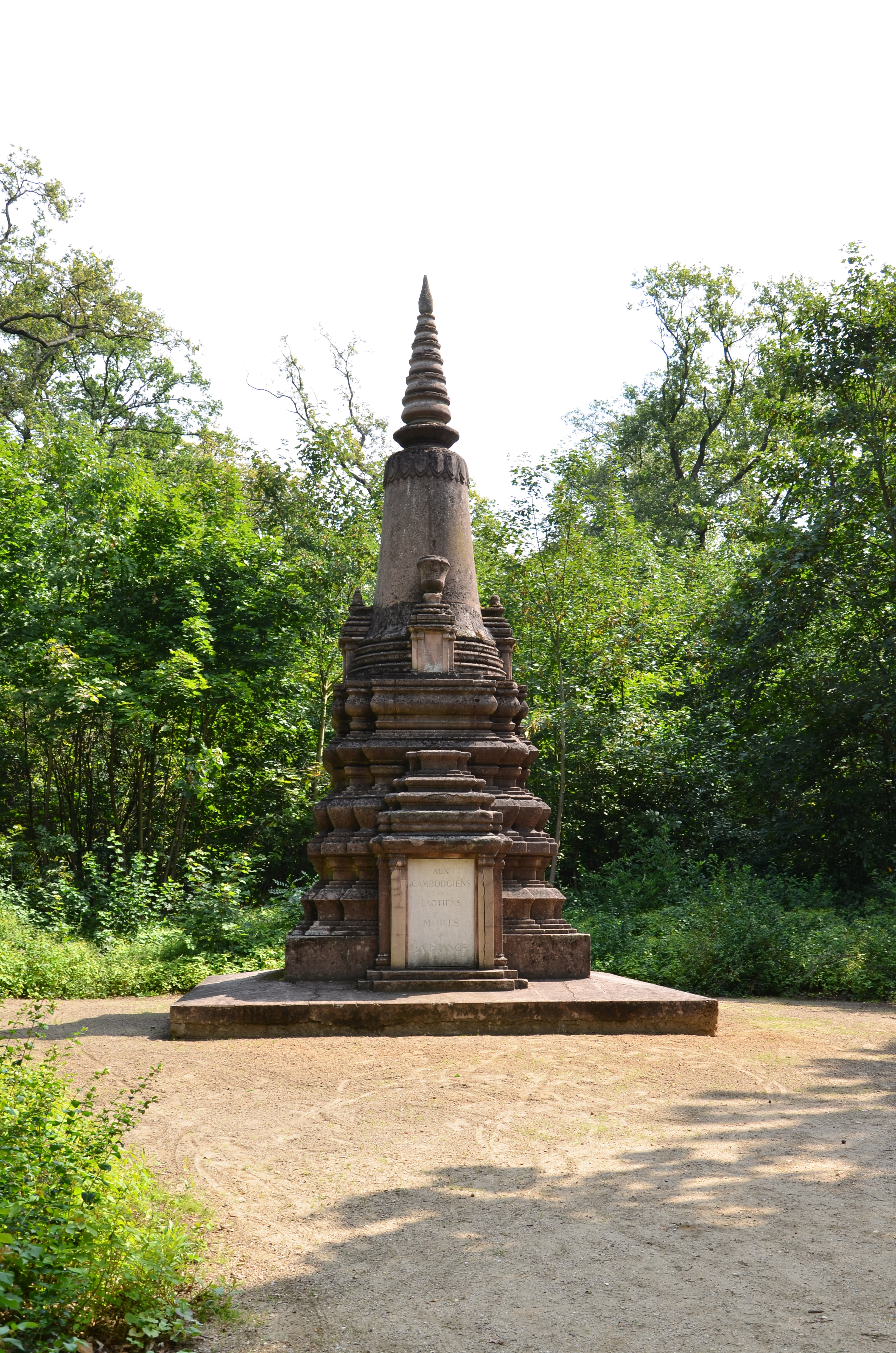 L’Écho Annamite du 19 janvier 1927 écrit au sujet de ce monument « Dans quelques mois, un nouveau monument sera inauguré dans le parc du Jardin colonial : un phnom, à la silhouette élancée, œuvre du sculpteur Auberlet qui s’est inspirée des plus beaux monuments khmer de ce genre. Il rappellera le souvenir des Cambodgiens et des Laotiens morts pour la France. » Émile Auberlet est un sculpteur et surtout staffeur qui participa notamment à l’exposition colonial internationale de 1931 où il participa à la reconstitution dans ses proportions exactes du massif central du temple d’Angkor Vat et sa chaussée d’accès en plein bois de Vincennes. Il faut comprendre par « staffeur » un mouleur de décors, dans le cas présent, le phnom (c’est-à-dire le temple) est une construction en ciment armé dont les décors ont été moulés sur des originaux a priori khmer. L’épitaphe est gravée sur une plaque en pierre insérée dans le monument. Épitaphe : AUX CAMBODGIENS ET LAOTIENS MORTS POUR LA FRANCE © Claire Pignol / COARC / Mairie de Paris Détail : © Stockholm / Commons.Wikimédia