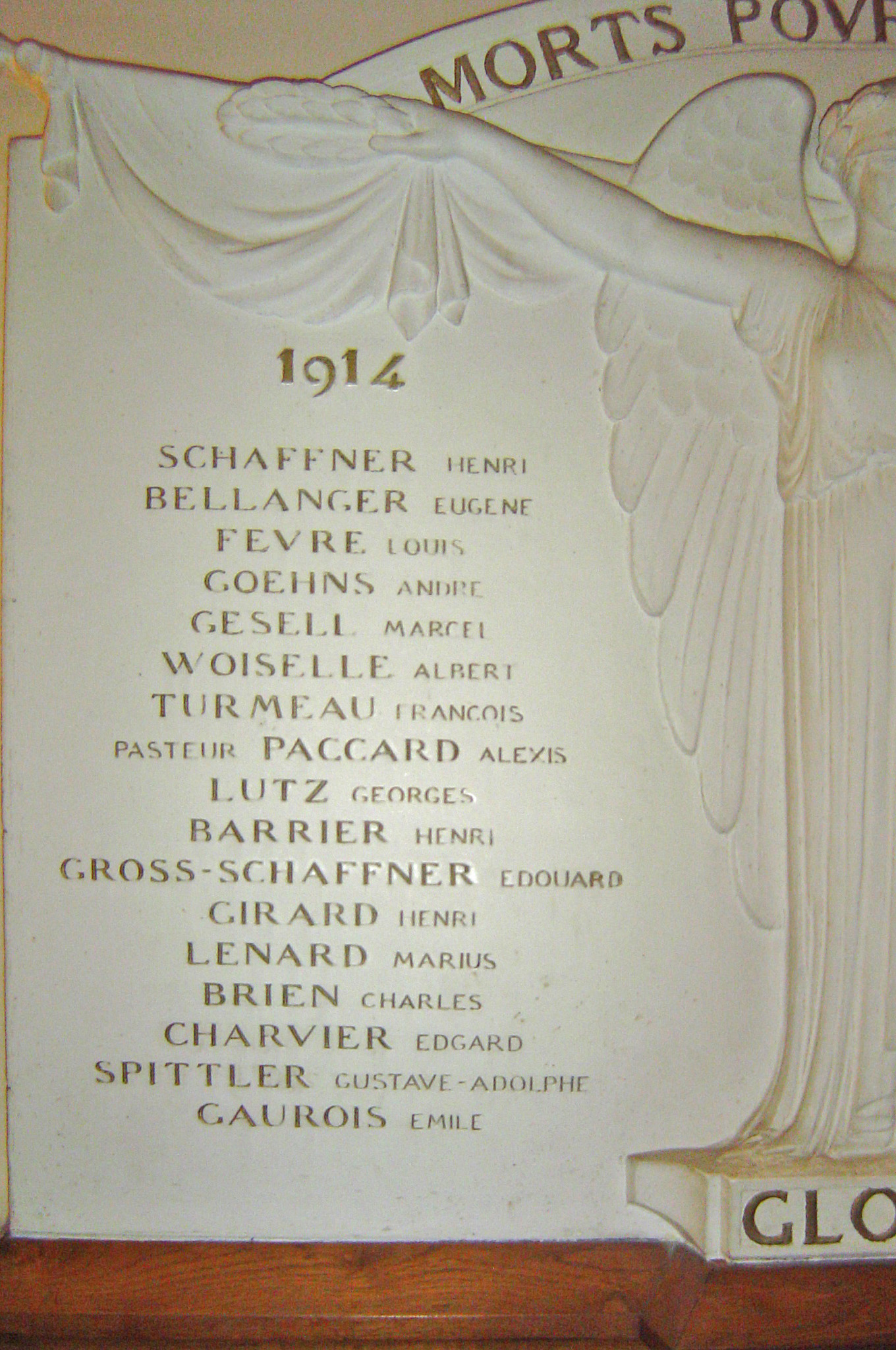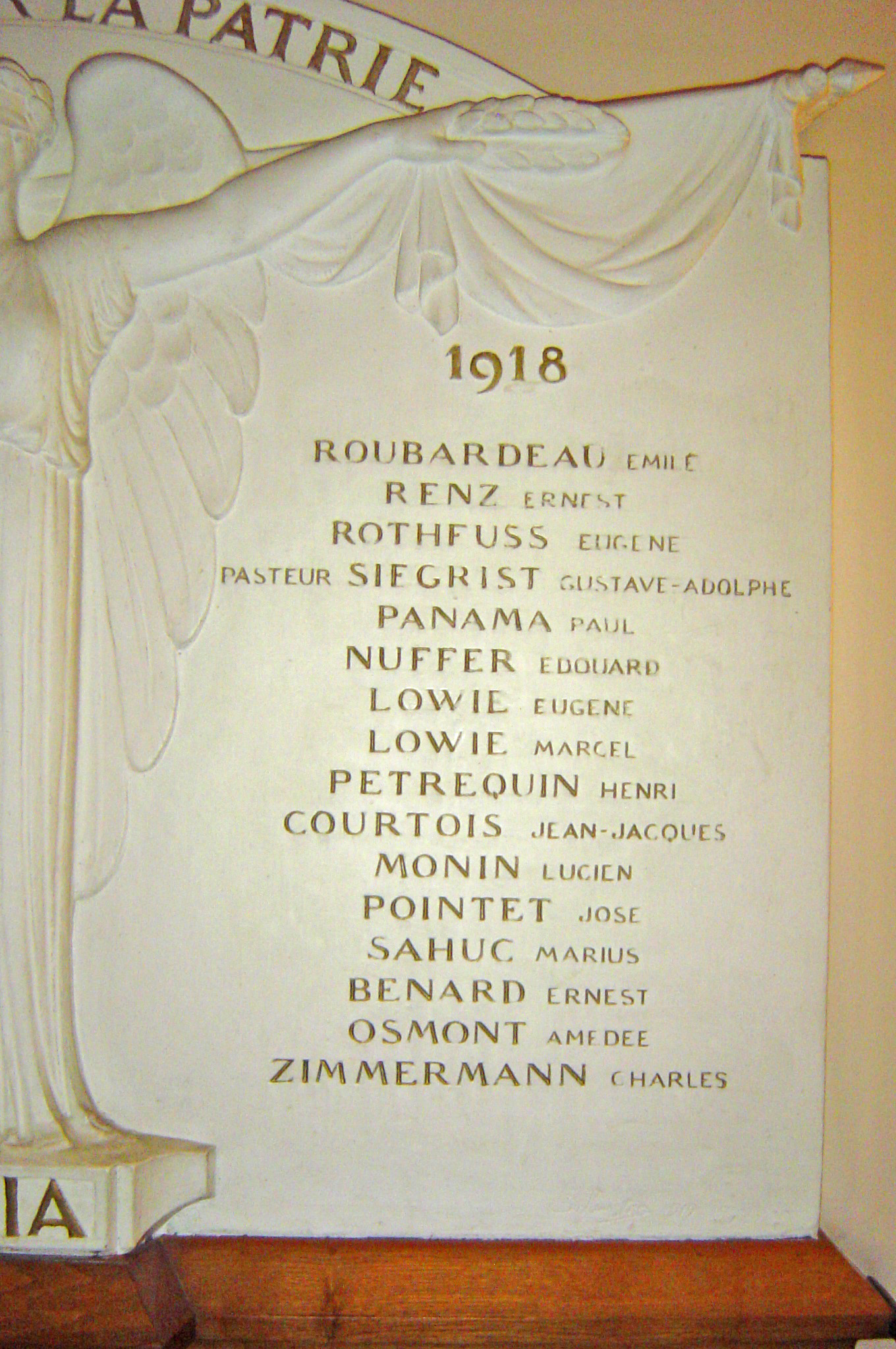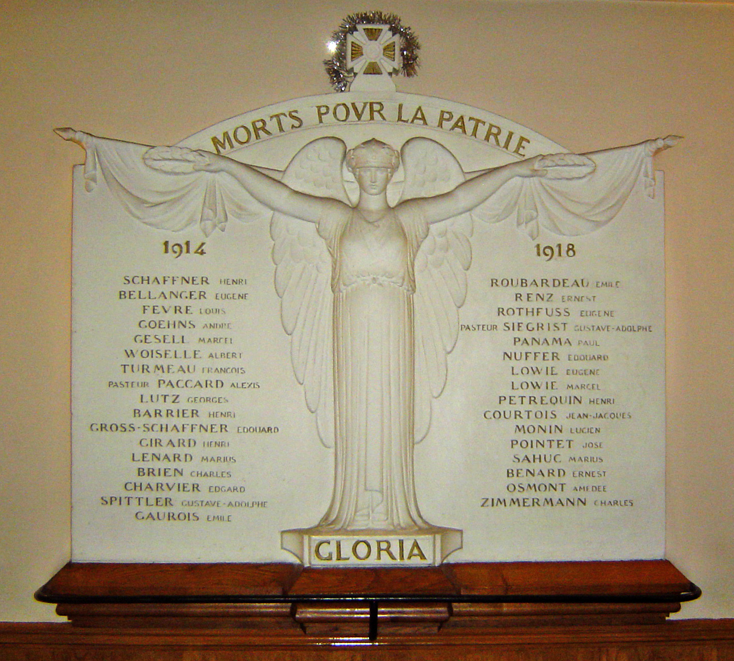 Ce monument, placé au pied de la nef, au centre du mur et sous la tribune, est composé au centre d'une Allégorie de la Victoire, ailée et casquée, tenant deux couronnes de lauriers, et derrière elles, deux drapeaux. De chaque côté sont listés des morts : à gauche 17 noms, à droite 16. Dimensions : h. 142 x l. 89 x p. 6 cm. Sculpture en plâtre signée et datée 'Silvestre 1919'. Commanditaire : communauté luthérienne de l'Ascension. Épitaphe : En haut : MORTS POUR LA PATRIE En bas : GLORIA © F. Jimeno / DHMMA / Mairie de Paris