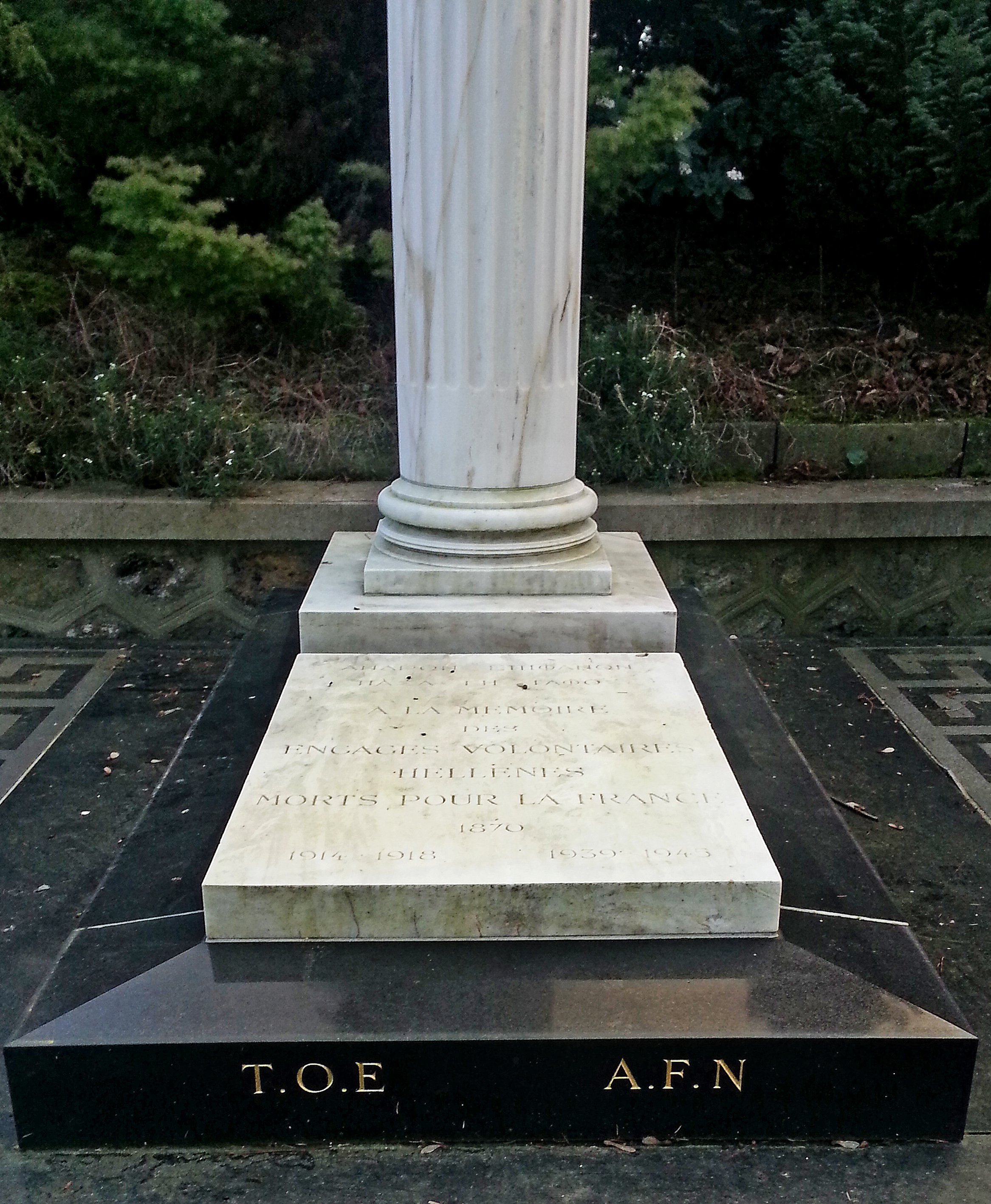 Le monument se présente sous la forme d’une colonne de marbre surmontée d’une Victoire ailée. Épitaphe : À LA MÉMOIRE COLONNE OFFERTE PAR ME PAPAGEORGIO Historique : Ce monument a été érigé en 1953 par l’association des anciens combattants engagés volontaires hellènes dans l’armée française sur un terrain offert par la Ville de Paris. © DHMMA / Mairie de Paris