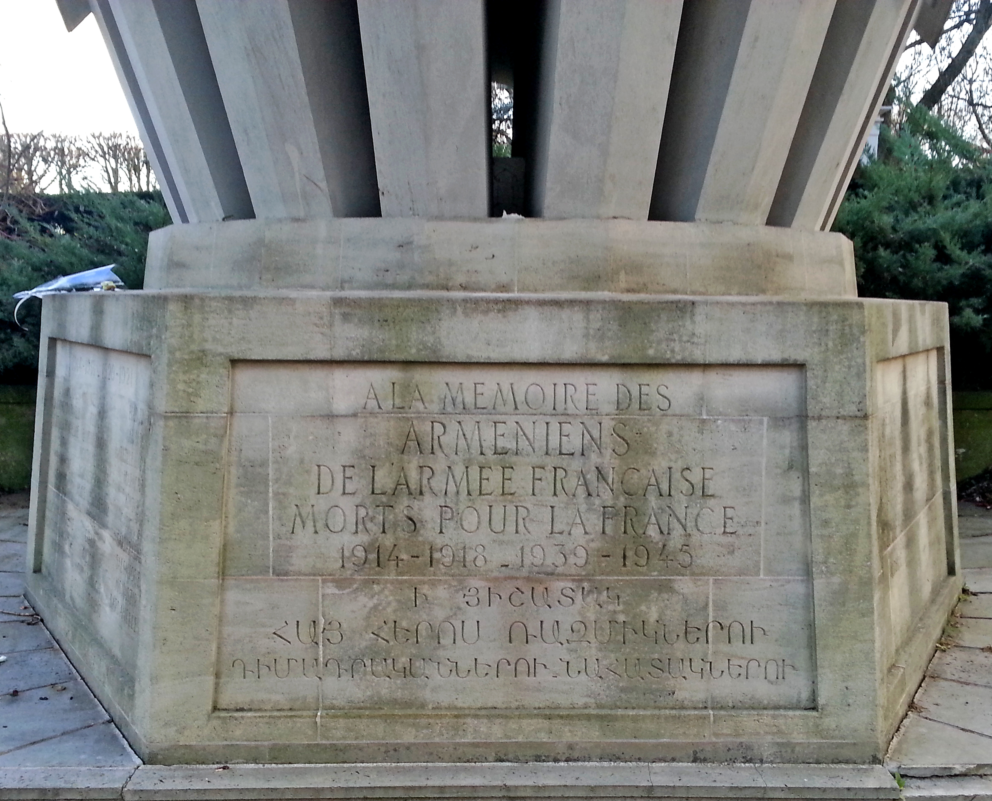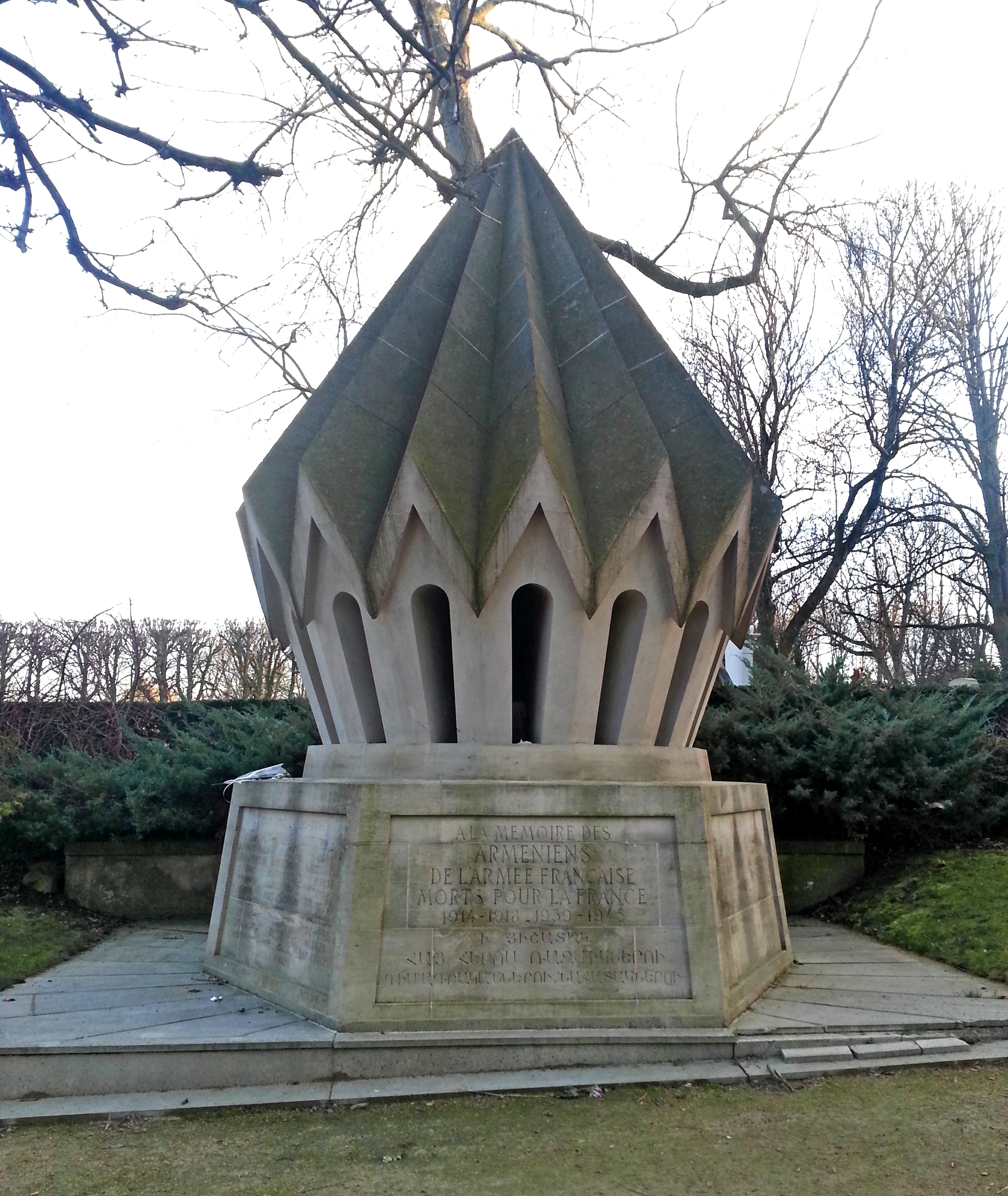Le monument aux morts représente un clocher octogonal à la manière des chapelles arméniennes. Œuvre collective imaginée par Edouard Utudjian, H. Koutan, Jean-François Djermagian et pour la sculpture, Bernard André. Il commémore les divisions de volontaires arméniens venus combattre pendant la Grande Guerre et les résistants de la Seconde Guerre mondiale, notamment Missak Manouchian, fusillé le 21 février 1944 au Mont Valérien. Épitaphe : Inscription de face A la mémoire des Arméniens de l’Armée française morts pour la France 1914-1918 1939-1945 Suivie de sa traduction en Arménien Sur le côté gauche figurent les batailles de la Première Guerre mondiale avec à gauche de la liste les batailles du front occidental, et à droite les batailles des fronts méditerranéen, levantin et caucasien. Inscription côté gauche Chemins des Dames Verdun Hadjin Craonne Craonnelle Flirey Adana Fort de la Pompelle Bois d’Hangard Bataille d’Ararat Artois Montagne le Pavis Marache Champagne Bommiers Chaudin Aintab Somme Plateaux de Laffaux Caucase Nancy Syrie Sardarabad Belloven-Santerre Liban Salonique Montdjebal Moussa Cilicie Monastir Auberive Moussa Dach Dardanelles Bataille d’Orient Sur le côté droit figurent les batailles de la Seconde Guerre mondiale. 1939-1945 SEDAN TUNISIE ARDENNES-OISE TRIPOLI LA SEINE BIR HAKEIM CEVENNES ERYTHREE PICAUSSEE PORT SAID NIMES SALONIQUE TOULOUSE ITALIE ALGERIE EL ALAMEIN Inauguration : la cérémonie d’inauguration qui eut lieu le 15 avril 1978, fut présidée par Alain Poher alors président du Sénat en présence de nombreuses personnalités consulaires, militaires, et maires de plusieurs communes. Le monument fut béni par Mgr Sérovpé Manoukian, le prélat des Arméniens de Paris. © DHMMA / Mairie de Paris.