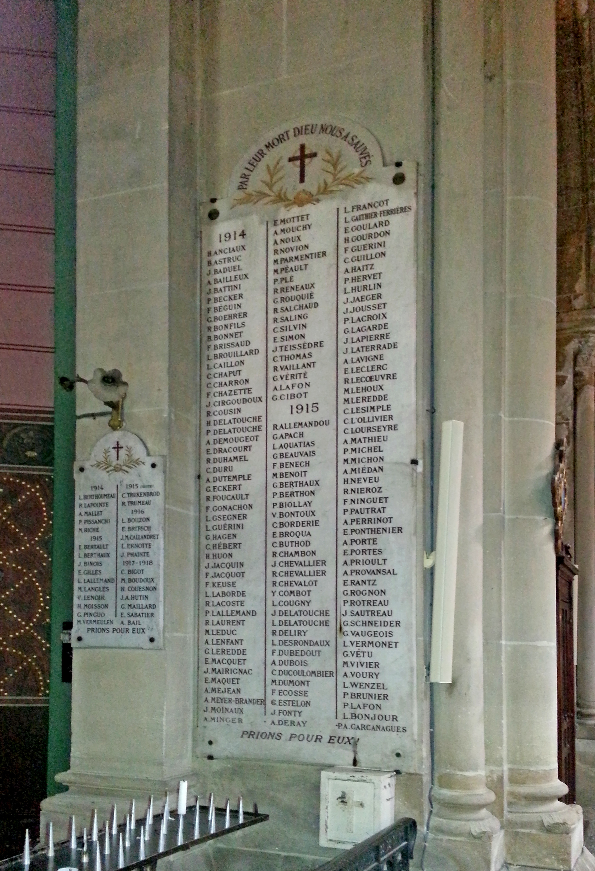 La présence de nombreux artisans, orfèvres et bronziers en particulier, dans le quartier Popincourt au XIXe siècle, explique la réalisation dans l'église d'une chapelle dédiée à Saint Éloi, leur saint patron dont une représentation figure sur le vitrail de la chapelle. Le mobilier de la chapelle est formé, à gauche, par une statue de Sainte Jeanne d'Arc offerte par les Vosgiens de Paris, mise en place le 13 mai 1984, à droite, par une pietà en plâtre. De chaque côté de l’autel, une peinture murale où figure une croix dans un médaillon formé par une couronne de laurier, de chaque côté, deux palmes qui tiennent par un phylactère où sont inscrits les dates 1914 et 1918. La chapelle est close par une grille en fer forgé. De chaque côté deux plaques en marbre blanc surmontées d'inscriptions au-dessus des noms des paroissiens morts pour la France classés par année de décès. Une plaque complémentaire a été ajoutée à gauche concernant la Seconde Guerre mondiale. À gauche, une petite affiche encadrée recense les clercs et prêtres du diocèse de Paris morts pour la France. Epitaphes : Plaque 1, en haut GLOIRE IMMORTELLE À NOS HÉROS Plaque 2, en haut PAR LEUR MORT DIEU NOUS A SAUVES En bas des deux plaques, sous lies listes des victimes : PRIONS POUR EUX © DHMMA / Mairie de Paris.
