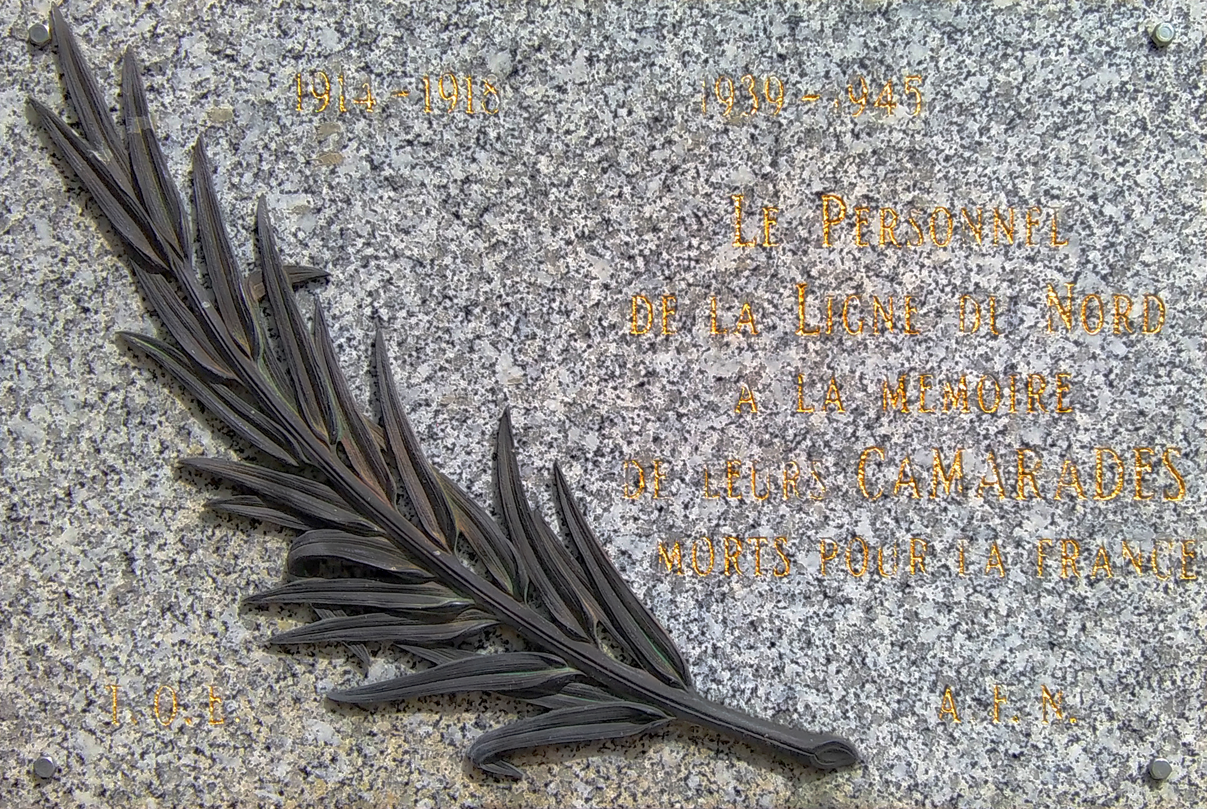 La plaque est en granit, les inscriptions sont gravées et réchampies d’or, une palme en métal vient décorée l’ensemble. Épitaphe : 1914 – 1918 1939 – 1945 Le Personnel de la Ligne du Nord a la mémoire de leurs CAMARADES morts pour la France I. O. E. A. E. N. Historique : La plaque est située dans l’ancien centre de tri postal de Paris-Évangile construit entre 1980 et 1981 (la demande de permis de construire date de 1977). Il fait partie de la famille des tris postaux rattachés au réseau ferroviaire, mis en place avant l'automatisation du tri : afin d'assurer les délais d'acheminement, les PTT réalisaient une partie du tri (manuellement) dans les trains. Ce type de bâtiment s'inscrivait dans le processus de tri manuel, en prolongement du tri réalisé dans le train. La dimension du bâtiment répondait à la maille du réseau ferrée et au volume de courrier quotidien transporté par les trains. L'automatisation du tri a rendu ce type de bâtiment inadapté, le tri étant progressivement décomposé selon un maillage plus localisé. Le bâtiment comprend 2 tours désignées A et C, la plaque est située à côté de la porte d'entrée de la tour C. Le centre de tri a été acheté par la Ville de Paris en 2007. © F. Jimeno / CHVP - Ville de Paris