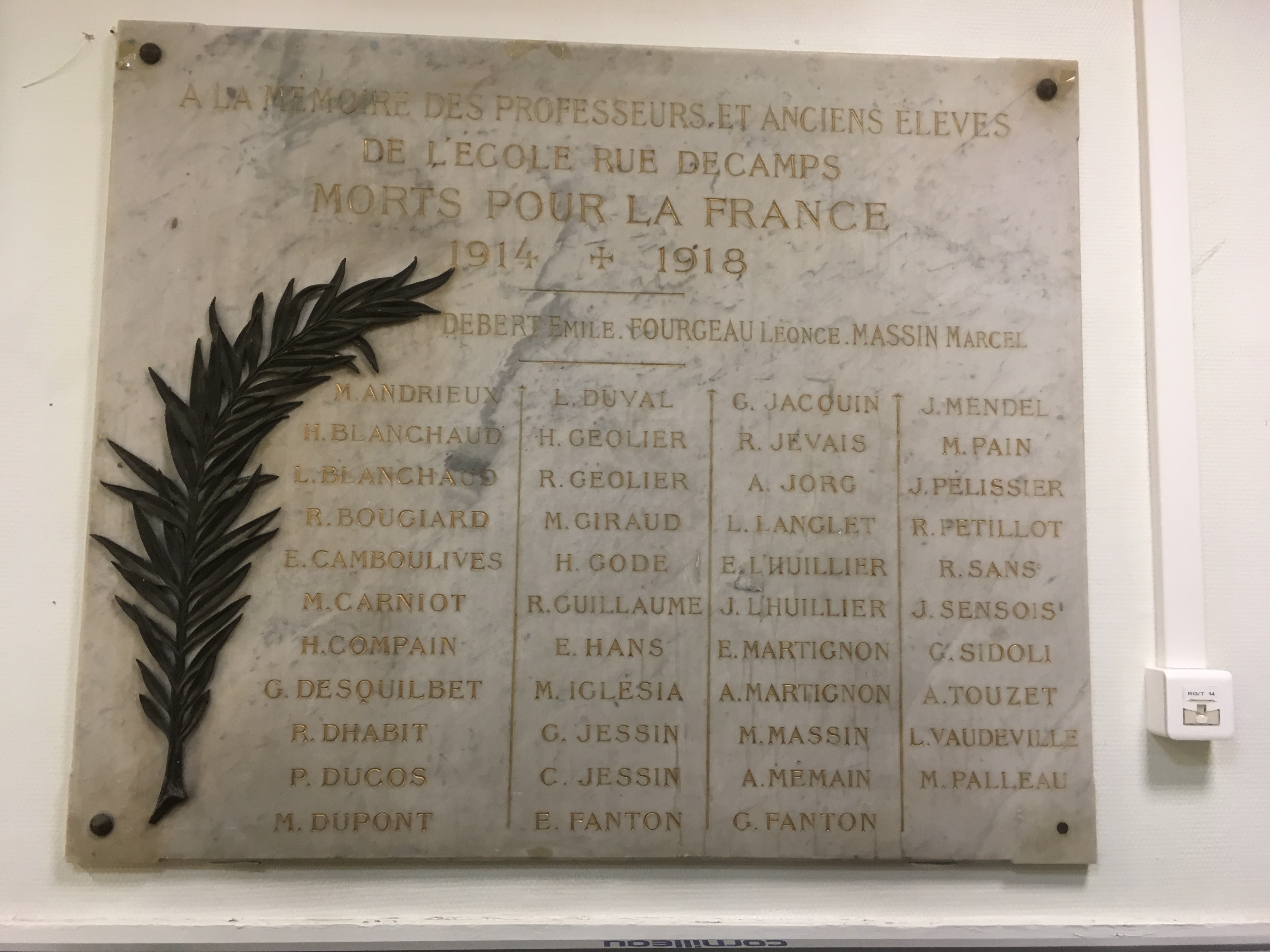 ' L'Association amicale Édouard-Petit, de la rue Decamps, a célébré cette année le vingt-cinquième anniversaire de sa fondation. Par ses soins, une plaque commémorative a été posée dans le préau de l'école en l'honneur des anciens élèves morts pour la patrie. Deux cérmonies imposantes pour les frais desquelles la 4e commission propose d'allouer une somme de 300 francs une fois donnée.' L'Association amicale Édouard-Petit qui est toujours en activité, est une association sportive d'escrime. La plaque, en marbre veiné de noir, est décorée d'une palme et de quatre cabochons métalliques. Épitaphe : À LA MÉMOIRE DES PROFESSEURS, ET ANCIENS ÉLÈVES DE L'ÉCOLE RUE DECAMPS MORTS POUR LA FRANCE 1914 + 1918 Bibliographie : Bulletin municipal officiel du mercredi 27 décembre 1922, p. 5482. © Sylvie André