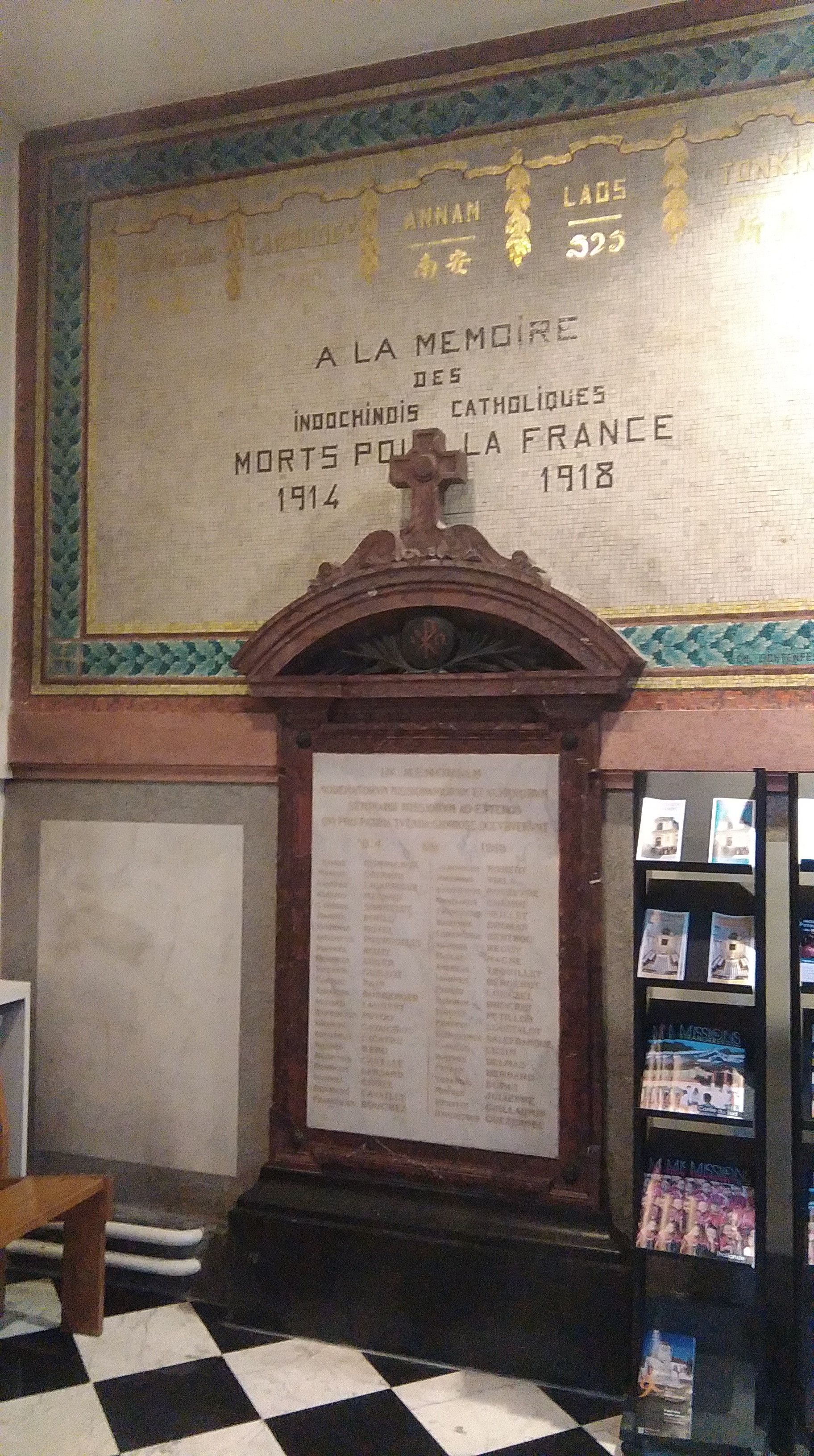 Le monument est situé sous la tribune découverte à l’entrée du vaisseau, contre le mur du bas-côté gauche. Il se compose d’une stèle surmontée d’un mur décoré d’une mosaïque. La stèle se compose d’une plaque de marbre blanc veiné de noir sur laquelle sont inscrits 46 noms, en lettres gravées et réchampies de rouge bordeaux. Elle est encadrée par un cadre mouluré de marbre rouge foncé posé sur un socle de pierre noire. L’ensemble est couronné par un fronton cintré décoré de palmes et d’un médaillon, et surmonté d’une croix. La mosaïque, située juste au-dessus, est signée : « CH. LICHTENFELDER ARCH.TE ». La composition est encadrée par une guirlande végétale en camaïeu de bleus. Sur la partie supérieure, des tesselles dorées dessinent les noms des provinces indochinoises, chaque nom étant séparé par une guirlande. Au centre, des tesselles rouges forment l’épitaphe elle-même. L’architecte Charles Lichtenfelder (1857-1938) fit une partie de sa carrière en Indochine. On lui doit plusieurs monuments aux morts situés dans le jardin agronomique du bois de Vincennes, notamment le portique Temple du Souvenir indochinois (1921) et le monument Aux Indochinois chrétiens morts pour la France (1921) qui est traditionnellement attribué. Épitaphes : Sur la mosaïque : COCHINCHINE CAMBODGE ANNAM LAOS TONKIN A LA MEMOIRE DES INDOCHINOIS CATHOLIQUES MORTS POUR LA FRANCE 1914 1918 Sur la stèle : In memoriam moderatum missionariorum et alumnorum seminari missionum ad exteros qui patria tuenda giorose occubuerunt © F. Jimeno / DHMMA / Mairie de Paris