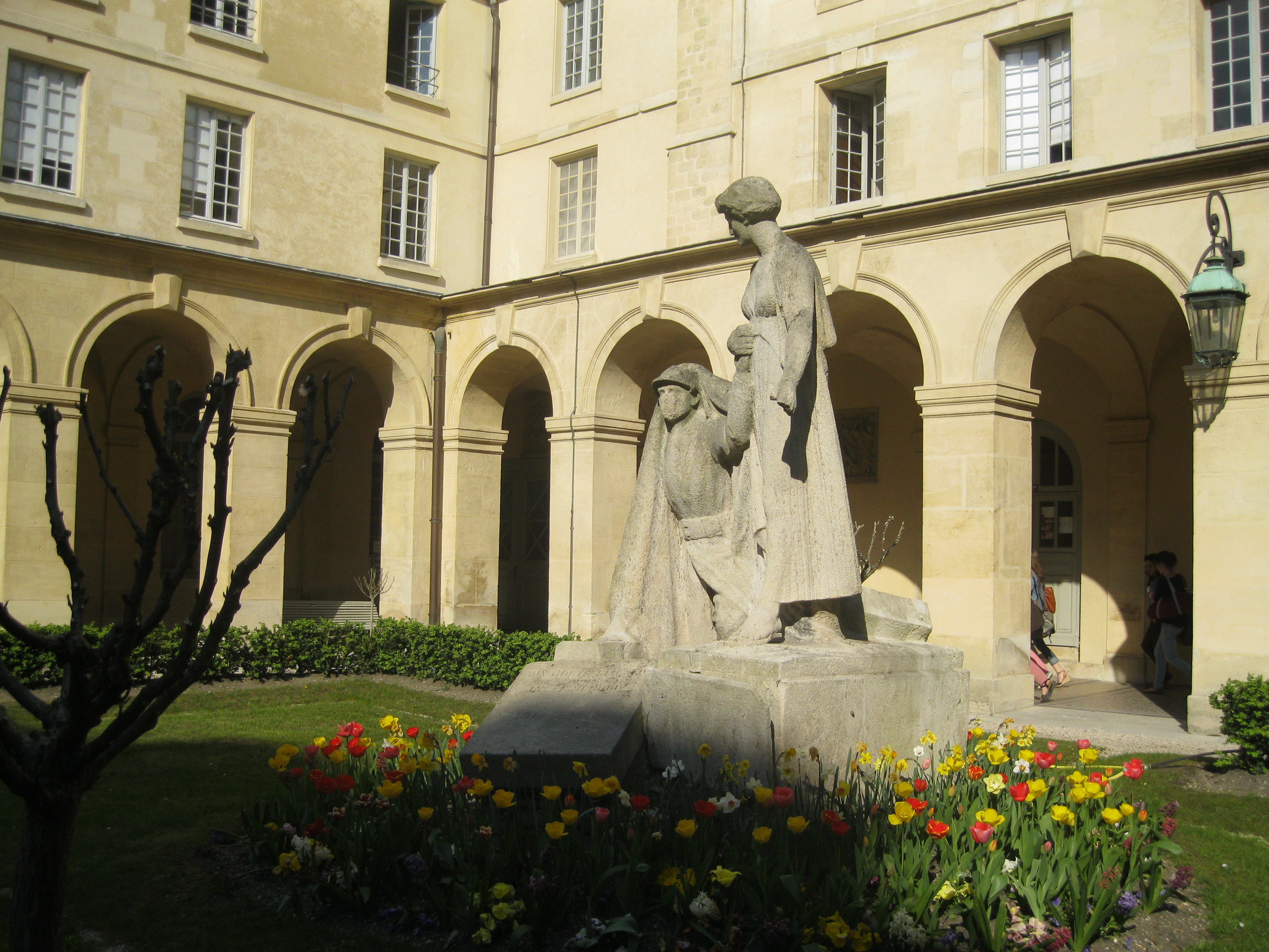 LE MONUMENT PRINCIPAL Un groupe sculpté est situé dans l’ancien cloître de l’abbaye Sainte-Geneviève, aujourd’hui cour du lycée Henri IV. Il fut commandé par L'Association amicale des anciens élèves du lycée à l’un de leurs camarades, le sculpteur Georges Saupique, qui obtint la commande grâce à l’intervention de son ancien professeur de lettres. Le monument, sculpté dans un bloc de calcaire, représente une figure allégorique de la France faisant sortir de sa tombe un « poilu » qui s’éveille et sourit à la Victoire. Le monument fut inauguré en présence du Président de la République, Alexandre Millerand, le 5 juin 1921. Épitaphe : Aux morts glorieux Lycée Henri IV 1914 - 1918 UNE PLAQUE Dans le parloir du lycée, une plaque en marbre liste les noms des 437 anciens élèves du lycée morts durant le conflit. Les noms sont gravés et réchampis de rouge bordeaux, l’épitaphe est dorée. Épitaphe : L'association amicale des anciens élèves AUX MORTS GLORIEUX DU LYCÉE HENRI IV 1914 - 1918 Crédit photographique : https://commons.wikimedia.org/w/index.php?curid=54796241 Bibliographie : L’Écho de Paris, 6 juin 1921, p. 2.