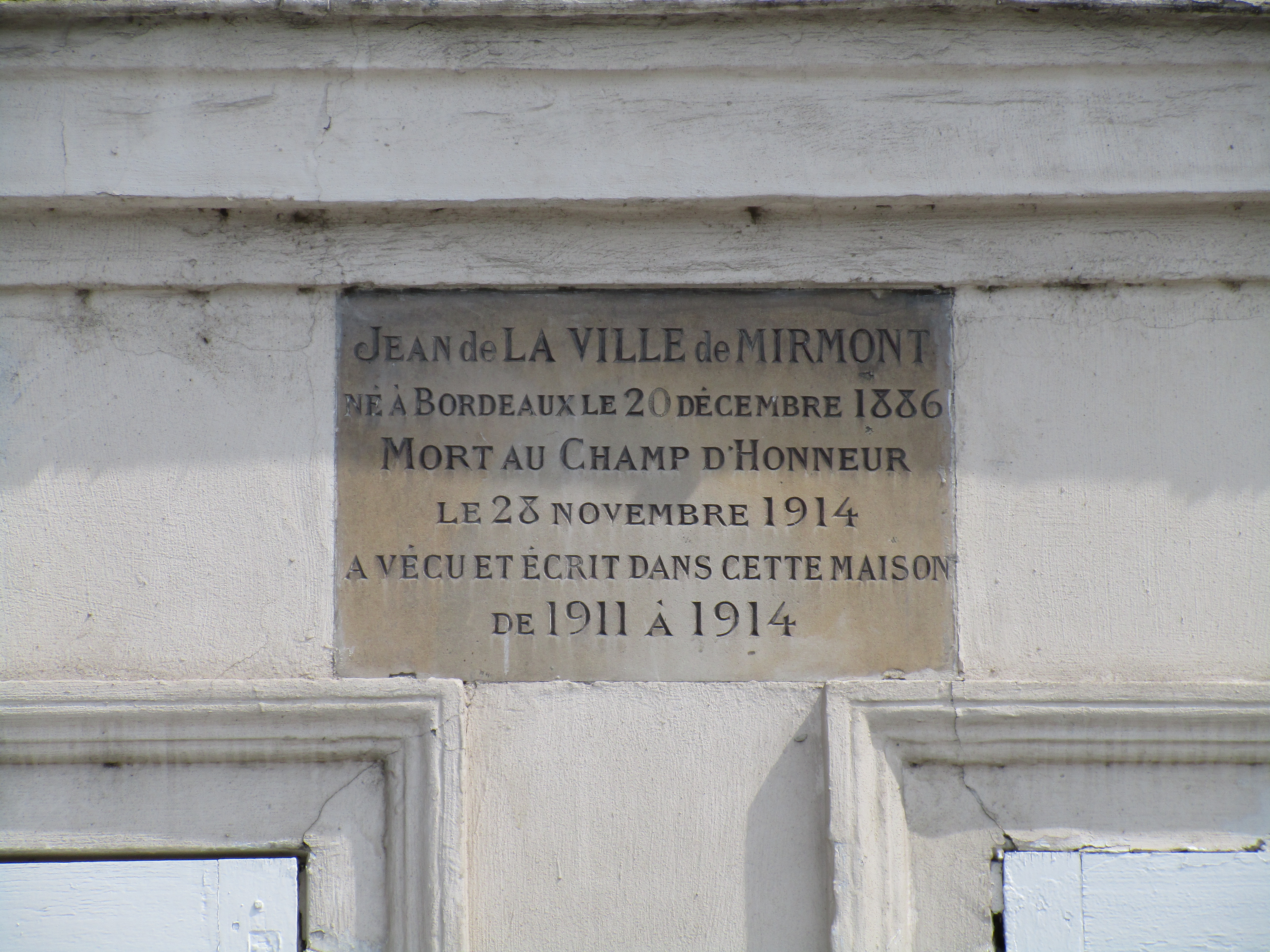 Le poète et homme de lettres Jean de La Ville de Mirmont (1886-1914) mourut enseveli par un obus en novembre 1914, sur le Chemin des Dames. Il venait de publier Les Dimanches de Jean Dézert, un roman inspiré en partie par sa carrière de fonctionnaire. Par la suite, L'Horizon chimérique, recueil de poèmes posthume, dont le célèbre « Vaisseaux, nous vous aurons aimés en pure perte », mis en musique par Gabriel Fauré, fit sa renommée. La Société des gens de lettres fut à l’initiative de cet hommage public et se fut son président, Georges Lecomte, qui présida la cérémonie d’inauguration. La plaque, en marbre, fort simple, est posée sur la façade de l’immeuble où il habita. Épitaphe : Jean de LA VILLE de MIRMONT Né à Bordeaux le 20 décembre 1886 Mort au Champ d’Honneur Le 28 novembre 1914 A vécu et écrit dans cette maison De 1911 à 1914 Bibliographie : Le Petit Parisien, 25 mai 1925, p. 2. Crédit photographique : F. Jiméno / DHMMA / Ville de Paris.