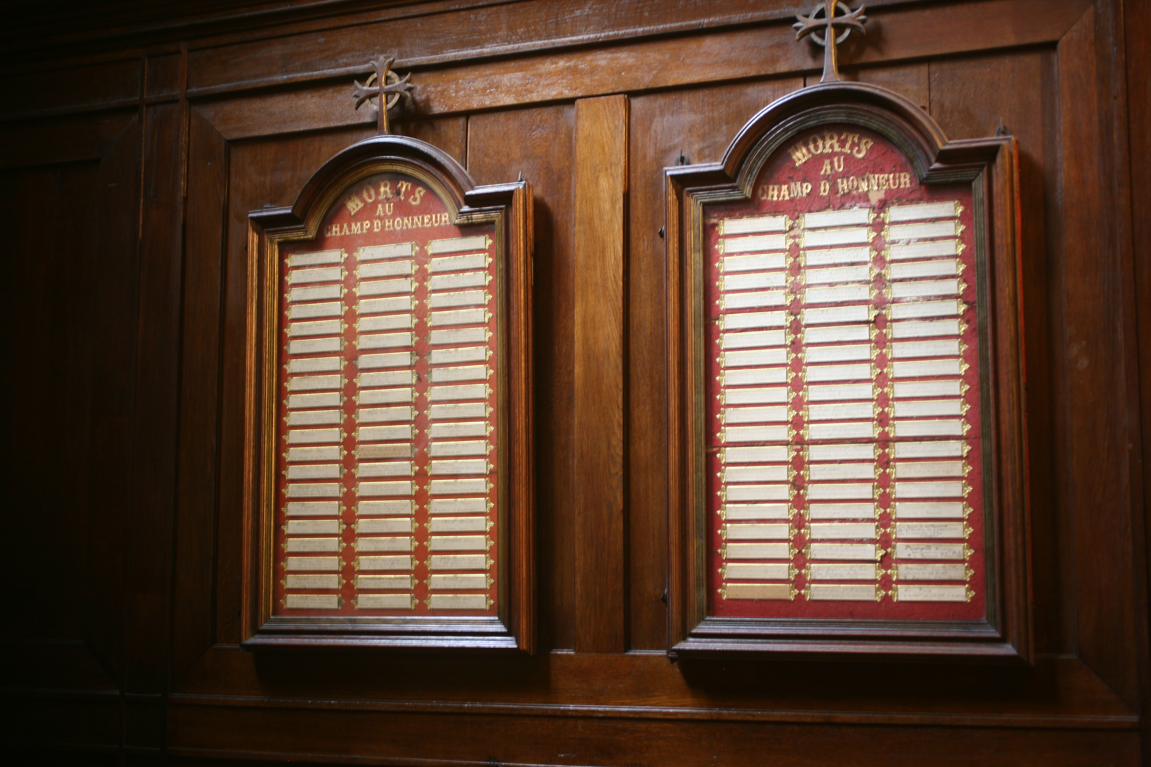 La troisième chapelle latérale du bas-côté droit est consacrée aux agonisants. Elle est présidée par un groupe en plâtre de Notre-Dame de Pitié (h. 140 x l. 200 cm) fabriqué par la maison d’objets religieux Raffl ; il fut offert par un paroissien en 1876. Sur les murs latéraux, décorés de lambris bas, quatre tableaux dans lesquels sont disposés de petits cartouches en papier et en carton doré. Sur chaque cartouche, le nom d’un défunt écrit à la main. Les tableaux honorent la mémoire de 242 paroissiens. Épitaphe : MORTS AU CHAMP D’HONNEUR Crédit photographique : © F. Jimeno / DHMMA / Mairie de Paris