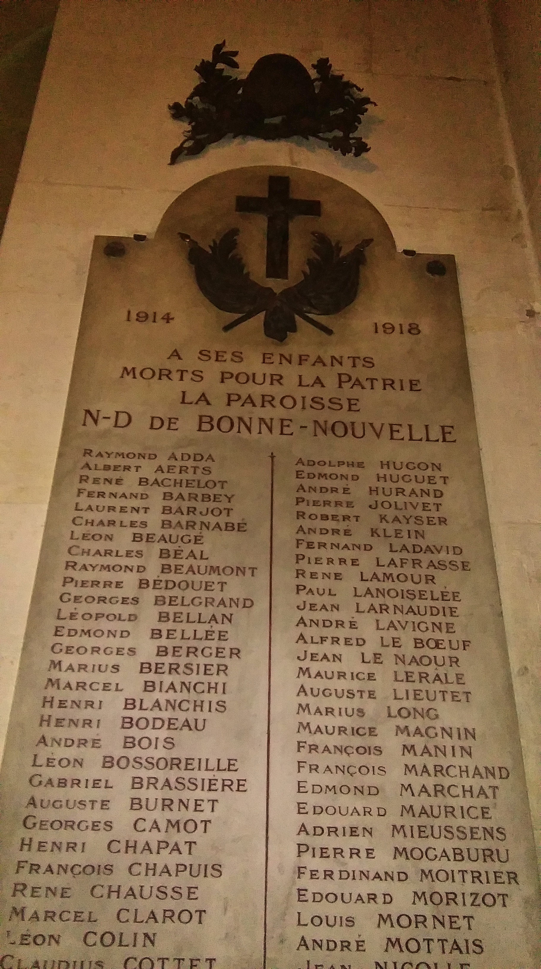 Plaque disposée en vis-à-vis de la porte d’entrée de l’église. Elle comporte un total de 126 noms gravés et réchampis de rouge bordeaux. Pour seuls décors, une croix encadrée par des drapeaux et des palmes. Au-dessus de la plaque, un casque encadré de palmes. Épitaphe : 1914 1918 A SES ENFANTS MORTS POUR LA PATRIE LA PAROISSE N-D de BONNE-NOUVELLE Crédit photographique : © F. Jimeno / DHMMA / Mairie de Paris