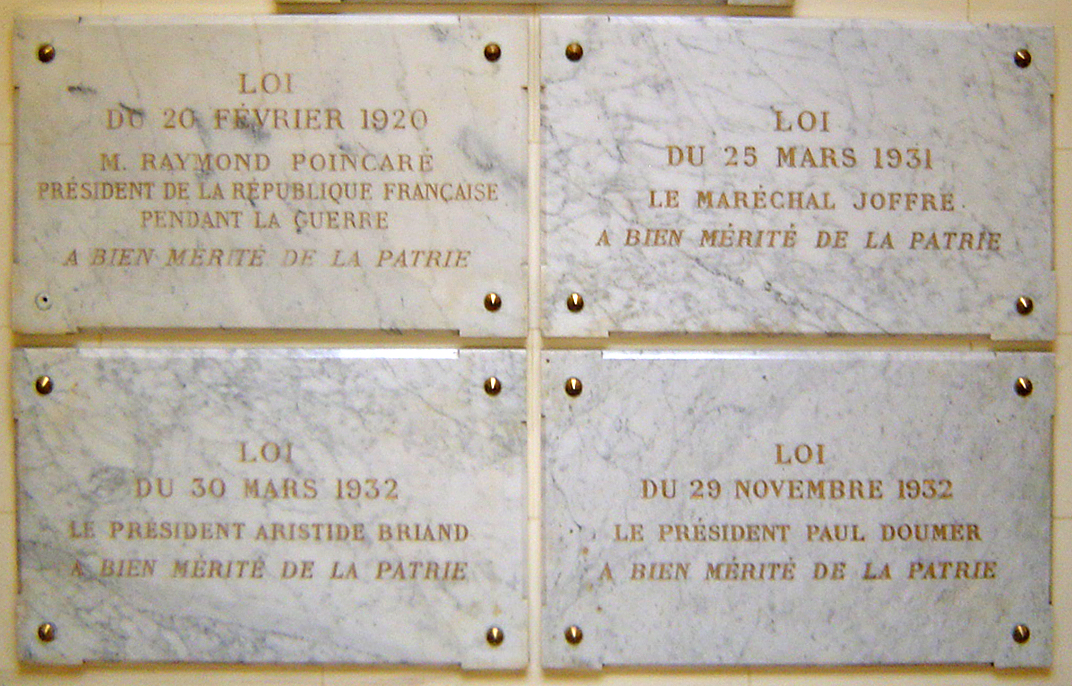 4° 'Loi du 20 février 1920. M. Raymond Poincaré, président de la République française pendant la guerre. A bien mérité de la patrie'.