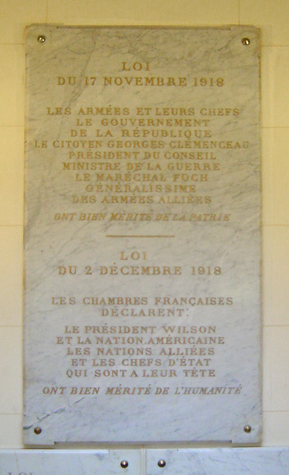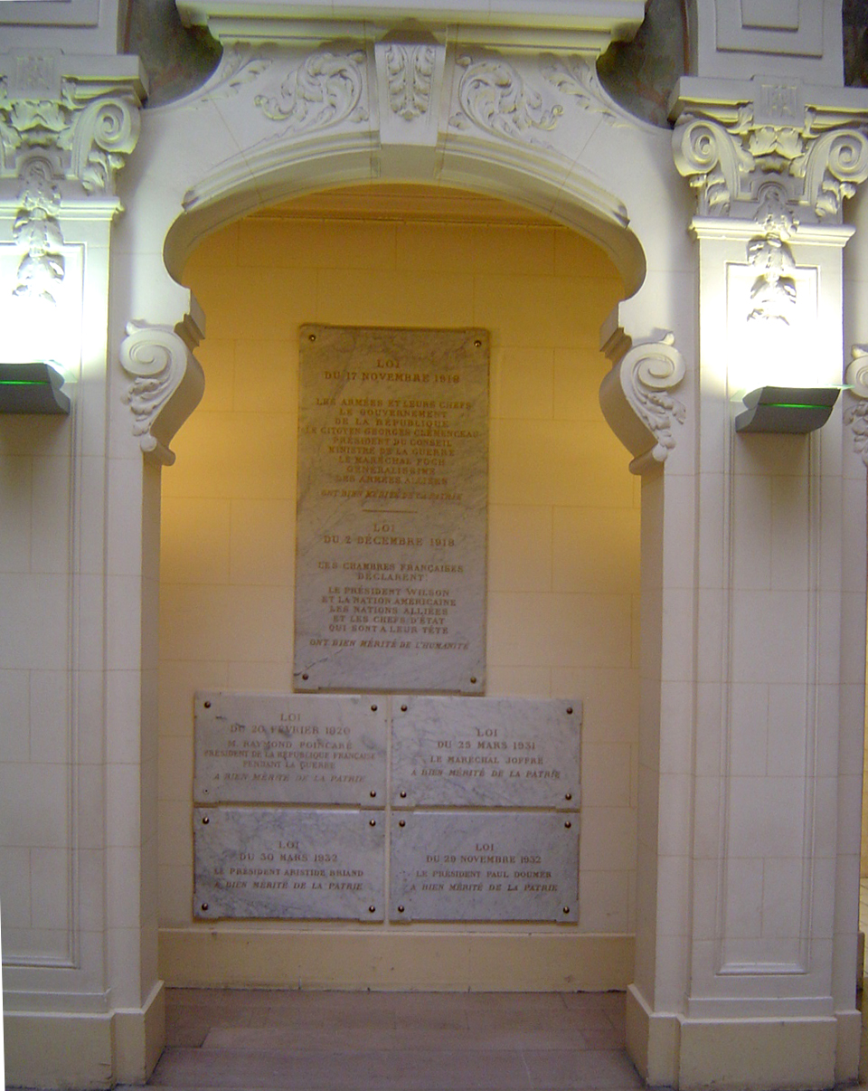 3° 'Loi du 17 novembre 1918. Les armées et leurs chefs, le gouvernement de la République, le citoyen Georges Clemenceau, président du Conseil, ministre de la Guerre, le maréchal Foch, généralissime des armées alliées ont bien mérité de la patrie. Loi du 2 décembre 1918. Les chambres françaises déclarent le président Wilson et la nation américaine, les nations alliées, et les chefs d'état qui sont à leur tête ont bien mérité de l'humanité'.