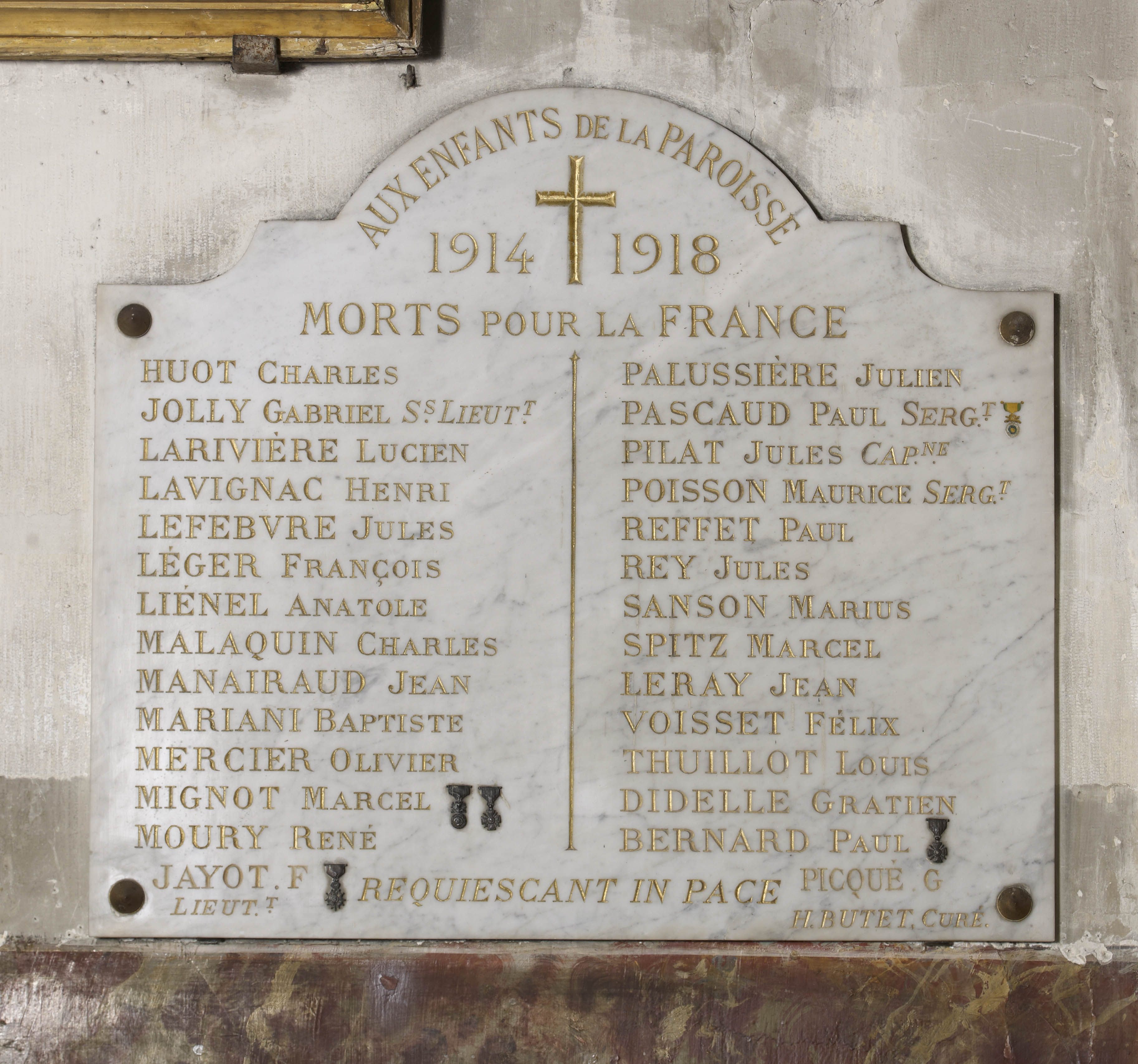 Situées contre le mur du bas-côté est, les deux plaques de marbre gris veiné disposent chacune d'une liste de noms sur deux colonnes, en lettres gravées et réchampies d'or, respectivement de 28 et 29 victimes. Pour seul décor, une croix et parfois quelques médailles militaires. Dimensions : h. 78 x l. 88 x p. 2 cm. Epitaphes : AUX ENFANTS DE LA PAROISSE 1914 [croix latine] 1918 MORTS POUR LA FRANCE Sous la liste de noms : REQUIESCANT IN PACE © DHMMA / Mairie de Paris