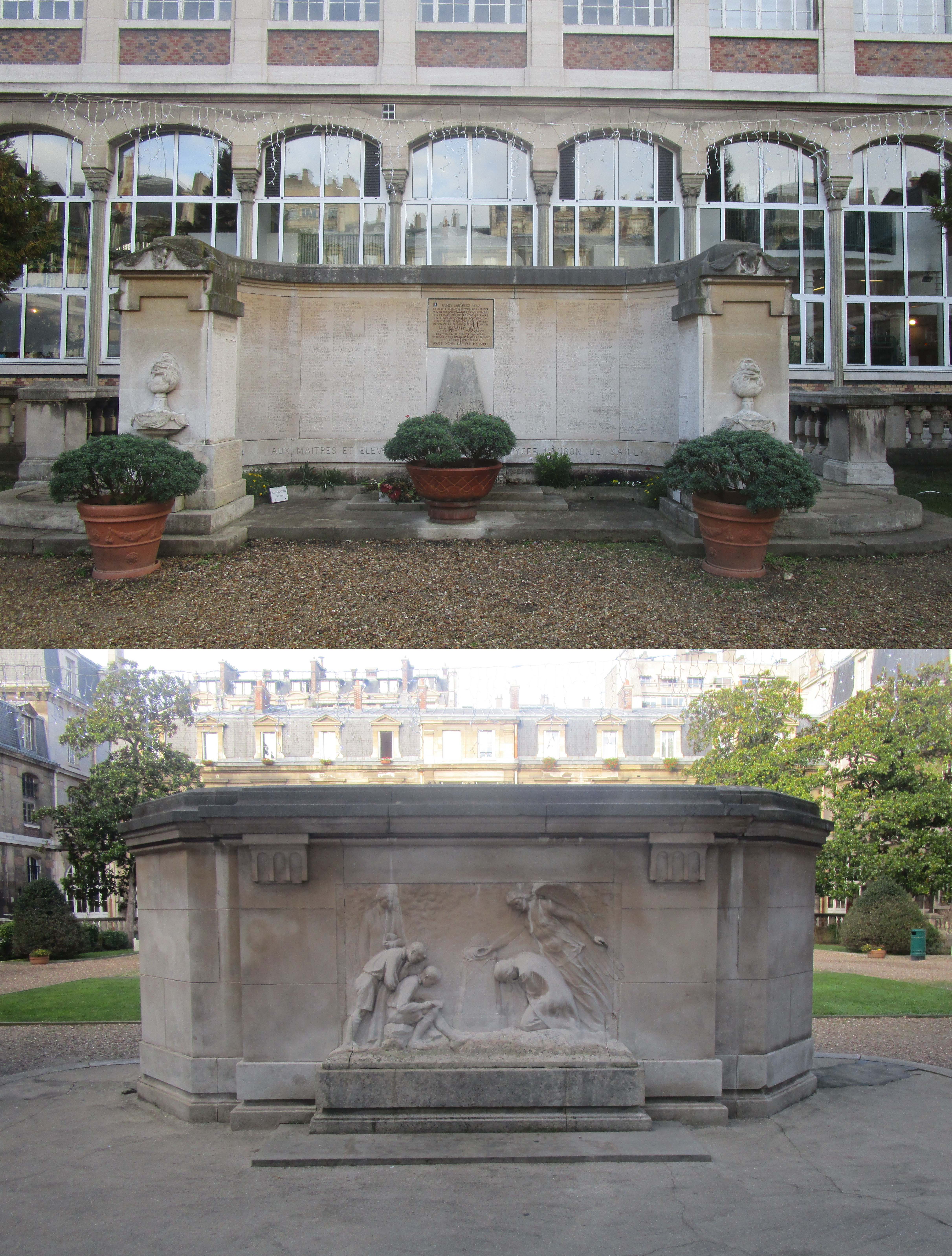 DESCRIPTION Le monument du Lycée Janson-de-Sailly est de grande taille et conçu en arc de cercle. Le monument est ainsi la première chose que l’on voit en entrant dans la cour de l’établissement. Les noms des morts y sont gravés par ordre alphabétique avec leur prénom. On en compte 690. Le long du monument, en bas, est inscrit « Maîtres et Élèves du Lycée Janson-de- Sailly ». La phrase continue sur une sculpture au centre « Morts pour la France ». Cette sculpture représente un casque de soldat et une grande palme. De part et d’autre du monument, on peut lire sur des piliers « 1914 » et « 1918 ». Le monument est aussi important pour son envers qui représente une scène propre au monde scolaire. On peut voir en effet cinq personnages en bas-relief, même si trois d’entre eux, au premier plan, ressortent davantage du mur. La scène est divisée en deux et au milieu se trouve ce que l’on comprend être la tombe d’un poilu avec son casque posée sur une stèle. À droite de la tombe, une femme, agenouillée, le visage dans les mains, un long voile sur les épaules et la tête couverte, semble pleurer. Dans cette position, son visage est caché. Au-dessus d’elle se tient une autre femme, une allégorie, ailée, uniquement vêtue d’un tissu transparent. Elle regarde cette femme qui pleure et lui désigne de la main droite l’autre partie de la scène. À gauche de la tombe du soldat, on distingue trois personnages, au premier plan, deux jeunes gens. Le premier est assis, sur une pierre du champ de bataille, en train de lire un livre. Il est habillé en écolier et est concentré sur son ouvrage. Au-dessus de son épaule et appuyé sur lui, se tient un autre garçon qui semble lui aussi lire le livre. Les deux garçons sont attentifs, ils ne se regardent pas ni ne se parlent. Au dernier plan, un peu en retrait, se tient un maître. Il porte les vêtements d’un professeur : costume et cravate. Il tient dans sa main et tout contre son corps un livre. Le sculpteur A. Biaggi décrit ainsi cette scène avant sa réalisation : « Dans la Zone rouge, sur le lieu d’une action principale, une Femme, penchée sur le sol sacré, pleure les Héros noblement tombés, cependant que la Gloire relève son courage en lui montrant un groupe de Jeunes Gens s’instruisant à la lecture de l’Histoire dont la leçon doit guider leur avenir ». L’envers du monument aux morts n’était pas terminé pour l’inauguration, faute de financements. Il est achevé en 1927. Notice rédigé par Emma Papadacci