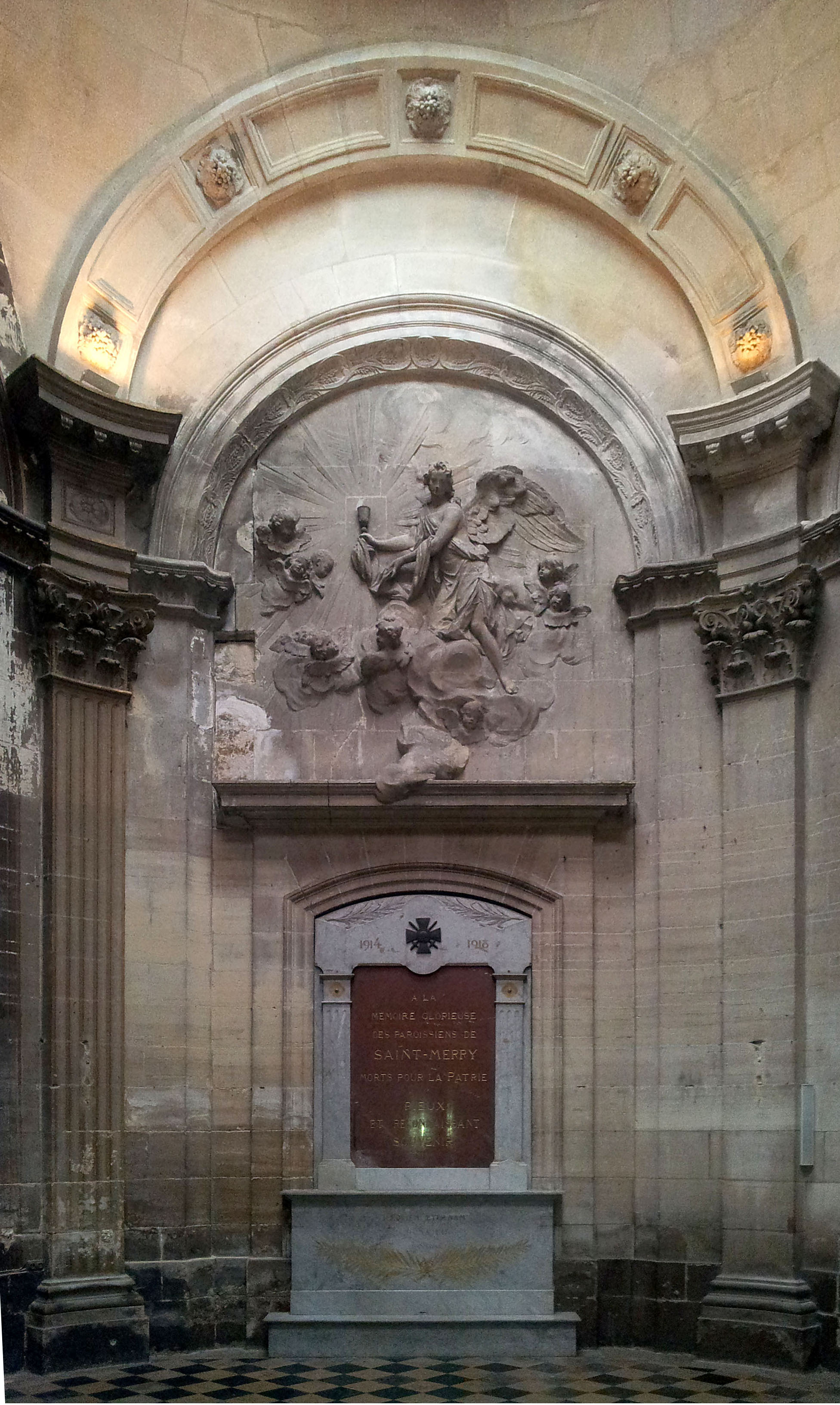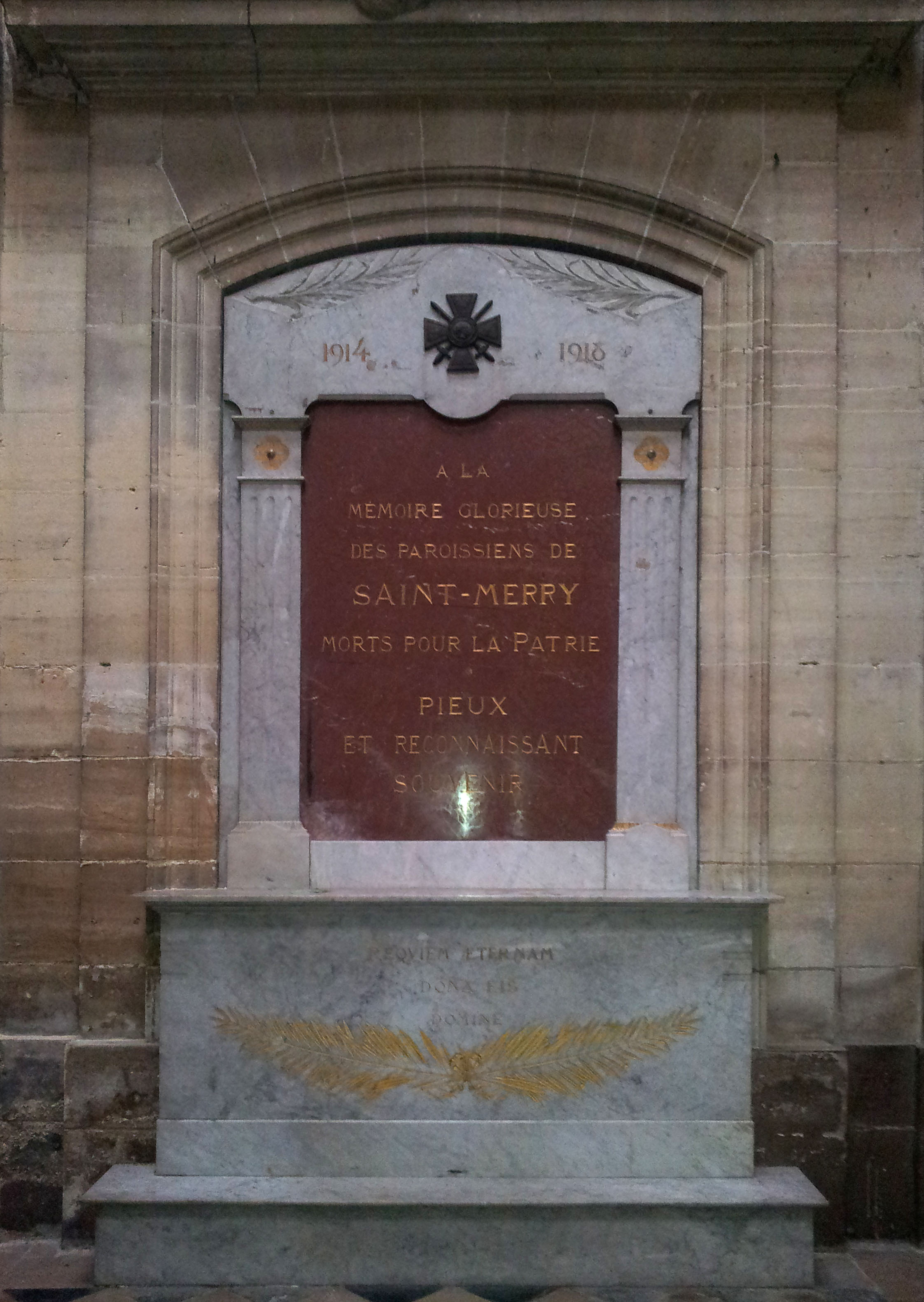 Situé dans la chapelle de la Communion - sous la relief réalisé vers 1745 par l'architecte Germain Boffrand (1667-1754) -, et à l'emplacement d'une porte menant au clocher, l'autel est décoré de deux palmes gravées et dorées et d'une inscription : 'REQUIEM AETERNAM - DONA EIS - DOMINE'. Il est surmonté d'une plaque rouge recevant l'épitaphe, elle-même encadrée par deux piliers et un fronton ayant pour décor une croix (métallique) et deux palmes gravées. Commanditaire : communauté paroissiale. Épitaphe : A LA MÉMOIRE GLORIEUSE DES PAROISSIENS DE SAINT-MERRY MORTS POUR LA PATRIE PIEUX ET RECONNAISSANT SOUVENIR © DHMMA / Mairie de Paris