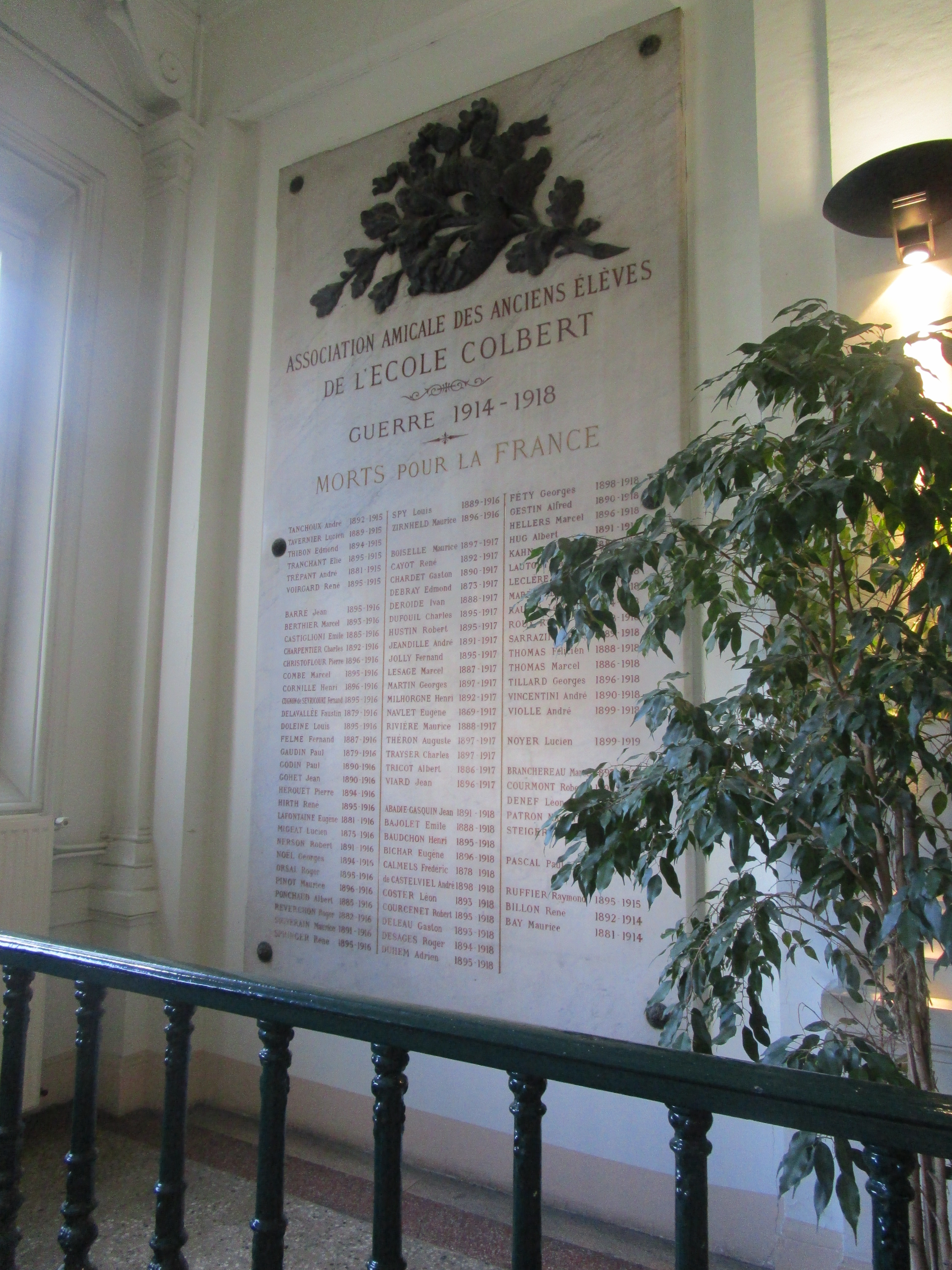 INAUGURATION Inauguration le dimanche 18 avril 1920. À l’École Colbert, trois intervenants prononcent un discours. Le premier discours est celui du président de l’Association des anciens élèves, M. Moiroux, le deuxième est celui d’un professeur de lettres de l’école, M. Jolivet et le dernier est celui d’un conseiller municipal, M. Beaud qui préside la cérémonie. DESCRIPTION À l’École Colbert, l’établissement ayant fait le choix de composer le monument de trois plaques séparées, les deux plaques principales encadrent le buste de Colbert, qui a donné son nom à l’école ; la liste des anciens élèves morts pour la France a été divisée en deux. Cela crée donc deux plaques de grande taille. Elles ont toutes les deux été réalisées exactement de la même façon et forment une symétrie parfaite. Les noms ont été classés chronologiquement en fonction de l’année de mort et à l’intérieur de cet ordre, par ordre alphabétique. On compte 183 morts. Un grand nombre d’informations figurent sur ces plaques : nom, prénom complet, année de naissance et année de mort. La première plaque contient les noms des morts de 1914 et de 1915. La deuxième plaque continue la liste des morts de 1915, puis ceux de 1916, 1917 et 1918. Ensuite, sont inscrits sept noms de morts recensés entre 1919 et 1921, probablement parce qu’ils sont morts des suites de leurs blessures. Enfin, trois noms ont été rajoutés à la fin : ce sont des morts, l’un de 1914 et les deux autres de 1915. La troisième plaque est, elle, consacrée aux trois professeurs de l’établissement morts à la guerre. Elle est de petite taille et on peut y lire : « École Colbert. Guerre 1914- 1918. Morts au Champ d’honneur. Personnel ». En dessous, trois noms sont inscrits, par ordre alphabétique cette fois mais toujours en spécifiant le prénom, la date de naissance et la date de mort. Le côté gauche s’orne d’un rameau de chêne sculpté. Notice rédigé par Emma Papadacci