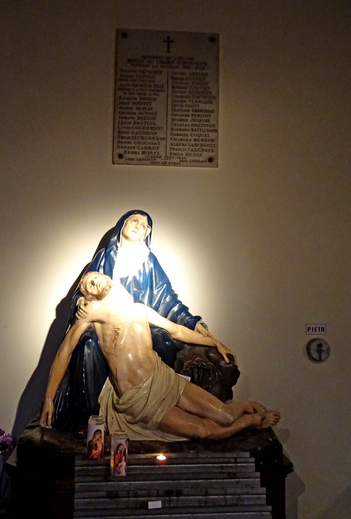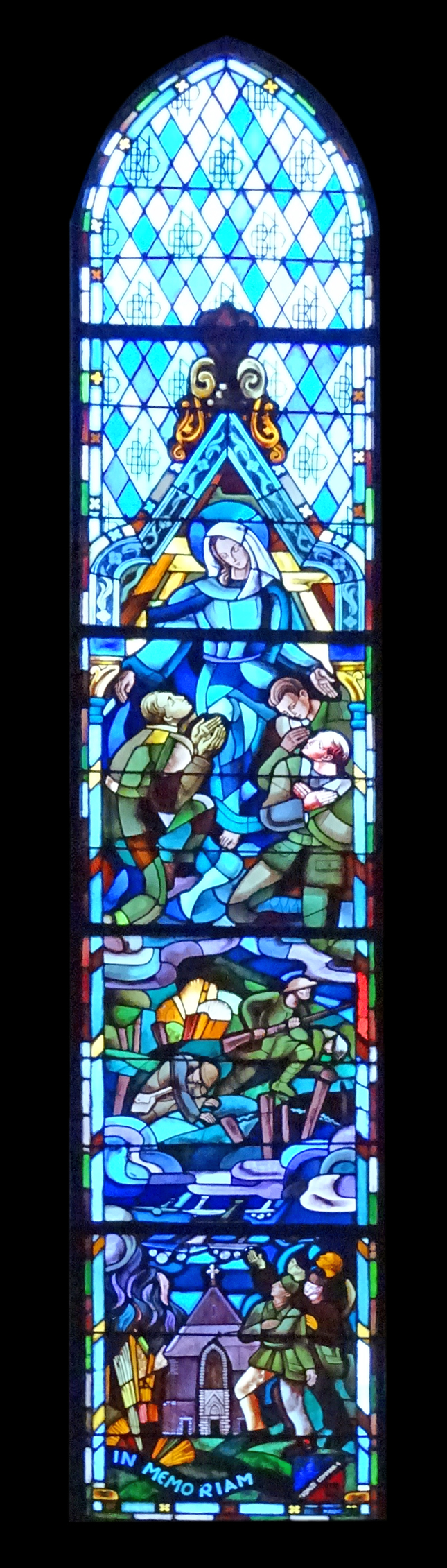 Deux hommages différents ont été réalisés dans l'église : une plaque associée à une Pieta et un vitrail. La plaque : Au-dessus d'une Pieta (plâtre peint) du sculpteur et fabriquant de statues Ignaz Raff (1828-1895) a été installée une plaque en marbre en mémoire des 'Membres de l'Œuvre morts au Champ d'Honneur pendant la Guerre 1914-1918' formant ainsi une petite chapelle du souvenir. La plaque en marbre ornée d'une croix comprend 33 noms de victimes de la Première Guerre mondiale, par la suite, trois noms de soldats de la Seconde Guerre mondiale furent ajoutés. Le vitrail : Au niveau de la cinquième travée du bas-côté droit se situe un vitrail représentant la Vierge accueillant les soldats anglais morts pendant le conflit. Elle porte pour inscription : IN MEMORIAM. Elle est signée en bas à droite 'MAUMEJEAN' du nom des maîtres verriers Joseph Mauméjean (1869-1952), Henri Mauméjean (1871-1932) et Carl Mauméjean (1888-1957) qui, originaires du Sud-Ouest de la France, ouvrirent un atelier à Paris en 1921. © Jimeno / DHMMA / Mairie de Paris