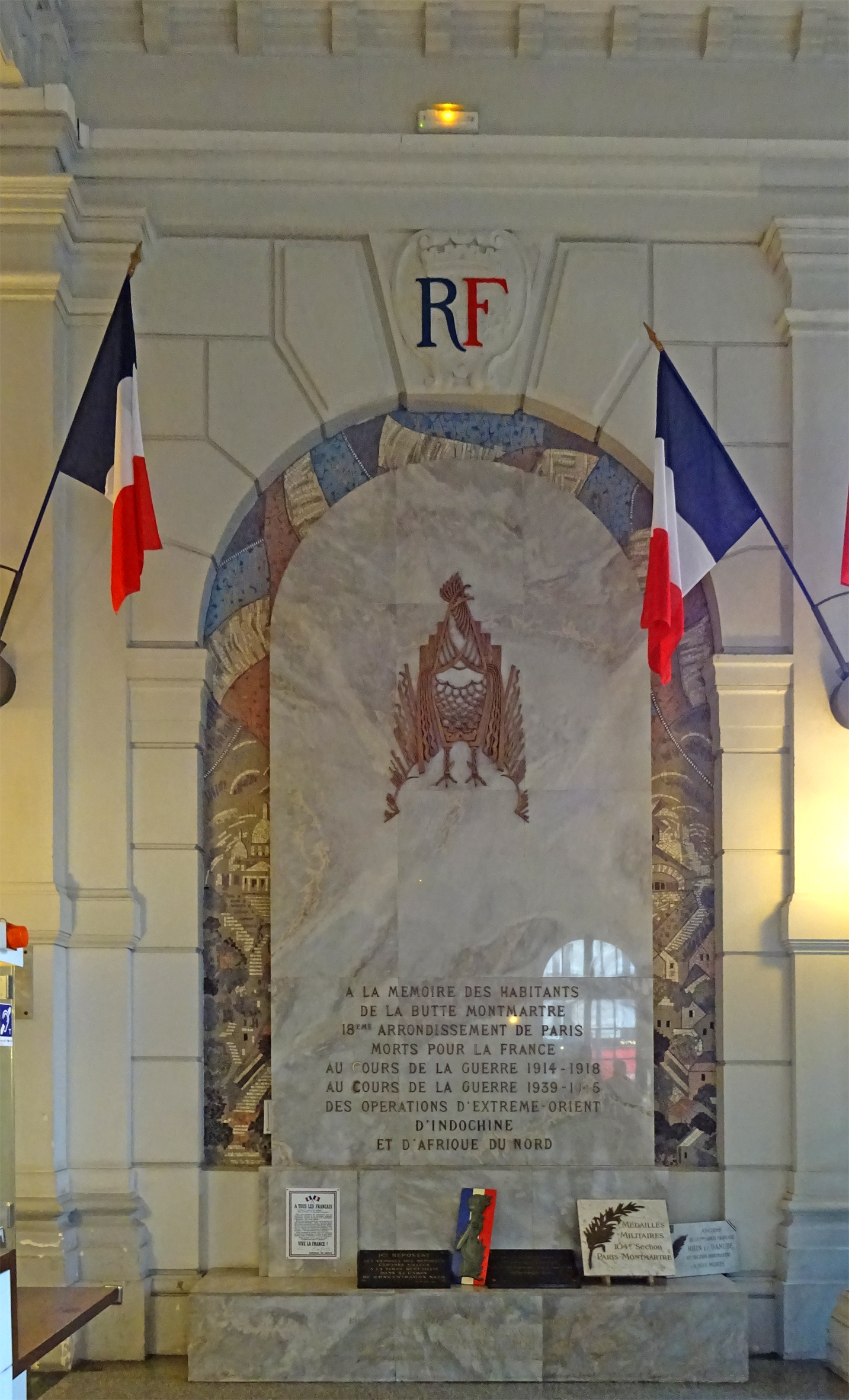 Épitaphe : A LA MEMOIRE DES HABITANTS DE LA BUTTE MONTMARTRE 18EME ARRONDISSEMENT DE PARIS MORTS POUR LA FRANCE AU COURS DE LA GUERRE 1914 - 1918 AU COURS DE LA GUERRE 1939 - 1945 DES OPERATIONS D'EXTREME - ORIENT D'INDOCHINE ET D'AFRIQUE DU NORD Sur le socle, on peut lire l'icription suivante : 'LA STELE DU SOUVENIR ERIGEE PAR SOUSCRIPTION PIBLIQUE A ETE INAUGUREE LE XXV JUIN MCMXVII PAR MONSIEUR RAYMOND POINCARE PRESIDENT DU CONSEIL - MINISTRE DES FINANCES. Localisation : Mairie du 18e arrondissement, hall d'entrée, mur de droite. Description : stèle de grande dimension, en marbre blanc veiné, au niveau supérieur un coq gaulois et deux palmes stylisés en bronze, au niveau inférieur l’épitaphe. La stèle est entourée d’un bandeau en mosaïque, on peut voir, à gauche une vue du Sacré Cœur, et dans la partie supérieure, des drapeaux tricolores stylisés. Selon un article publié par Le Petit Parisien du 26 juin 1927, 16 093 habitants du 18e arrondissement périrent durant le conflit. Il précise que le concepteur du monument est l'architecte Gaston Lauzanne. Grâce à une photographie publiée en couverture de ce journal, on constate quelques modifications postérieure de celui-ci. À l'origine, le parrement en marbre était plus étroit, notamment dans la partie supérieure, le bandeau de mosaïque était donc plus large, les drapeaux tricoles plus nombreux. Par contre, le coq gaulois et les deux palmes sont d'origine. L'épitaphe a elle aussi été complétée. © F. Jiméno / DHMMA / Mairie de Paris