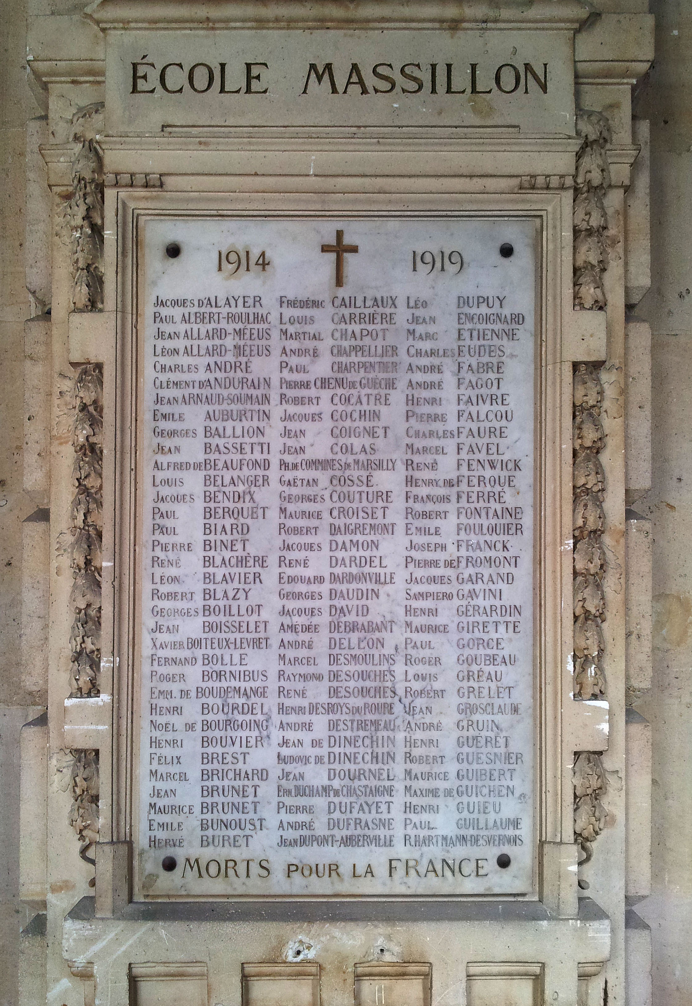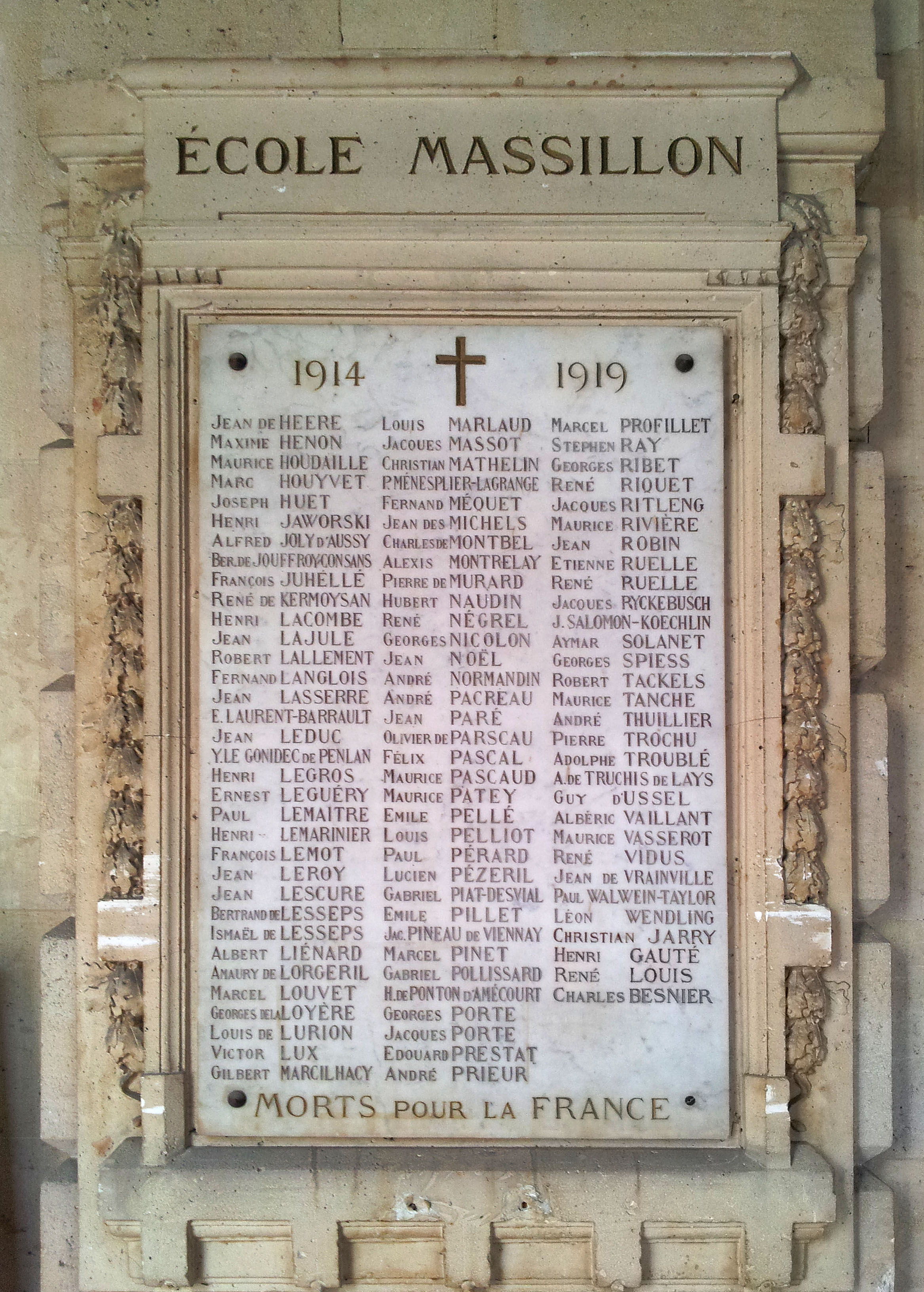 Deux plaques en marbre enchâssées dans l'architecture, elles comportent 97 noms gravés et rechampis de rouge, pour seul décor une croix latine. Épitaphe : ECOLE MASSILLON MORTS POUR LA FRANCE Inauguration : « L’inauguration solennelle des marbres destinés à perpétuer dans l’Ecole et à honorer la mémoire de deux cents enfants de la maison morts pour la France pendant la guerre », a eu lieu le 7 juin 1921 (Le Gaulois, 8 juin 1921, p. 2). La cérémonie comprenait notamment une « messe militaire dans le vestibule de l’Ecole ». Un monument sans doute financé par l’école elle-même, par une souscription, et par l’Association amicale des anciens élèves de l’école Massillon. © DHMMA / Mairie de Paris.