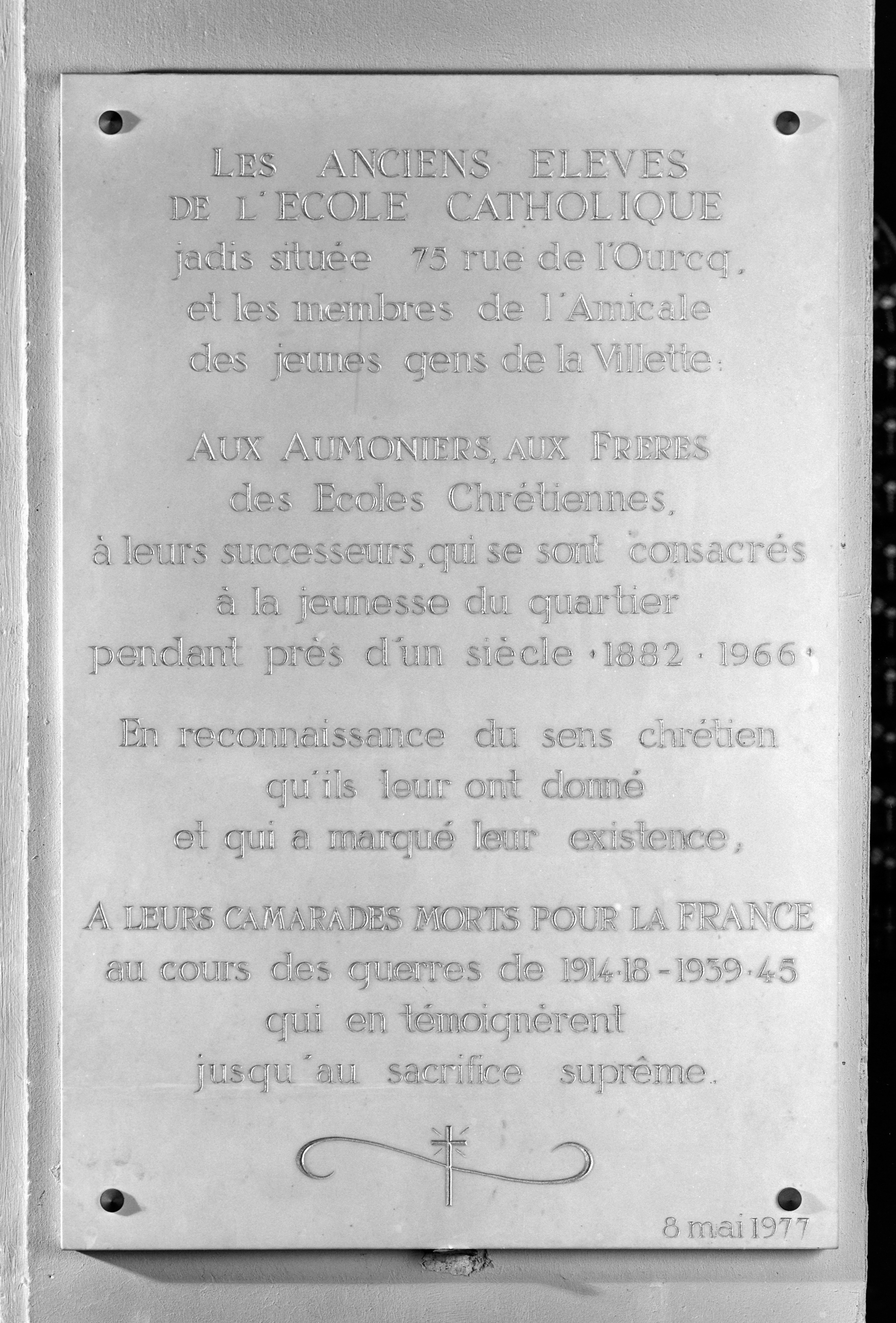 Plaque 1 : La plaque de marbre blanc (h. 90 x l. 55 cm) sur trouve sur le bas-côté gauche, dans la chapelle d'axe, sur le mur de gauche. Les inscriptions sont gravées et réchampies d'or. Epitaphe : LES ANCIENS ELEVES DE L'ECOLE CATHOLIQUE AUX AUMONIERS, AUX FRERES A LEURS CAMARADES MORTS POUR LA FRANCE au cours des guerres de 1914-18 - 1939-45 qui en témoignèrent jusqu'au sacrifice suprême Plaque 2 : Dans l'église se trouve également une autre plaque, le monument de la paroisse en tant que tel, sur le bas-côté droit, posée sur le médaillon d'un arc formeret au-dessus d'un vitrail où 104 noms de soldats sont inscrits. Ce monument est actuellement dissimulé par une structure légère. Epitaphe : AUX ENFANTS DE LA VILLETTE MORTS POUR LA FRANCE 1914-1918 Photo 1 : © E. Michot / COARC / Mairie de Paris Photo 2 : © D. Grenèche / DHMMA / Mairie de Paris