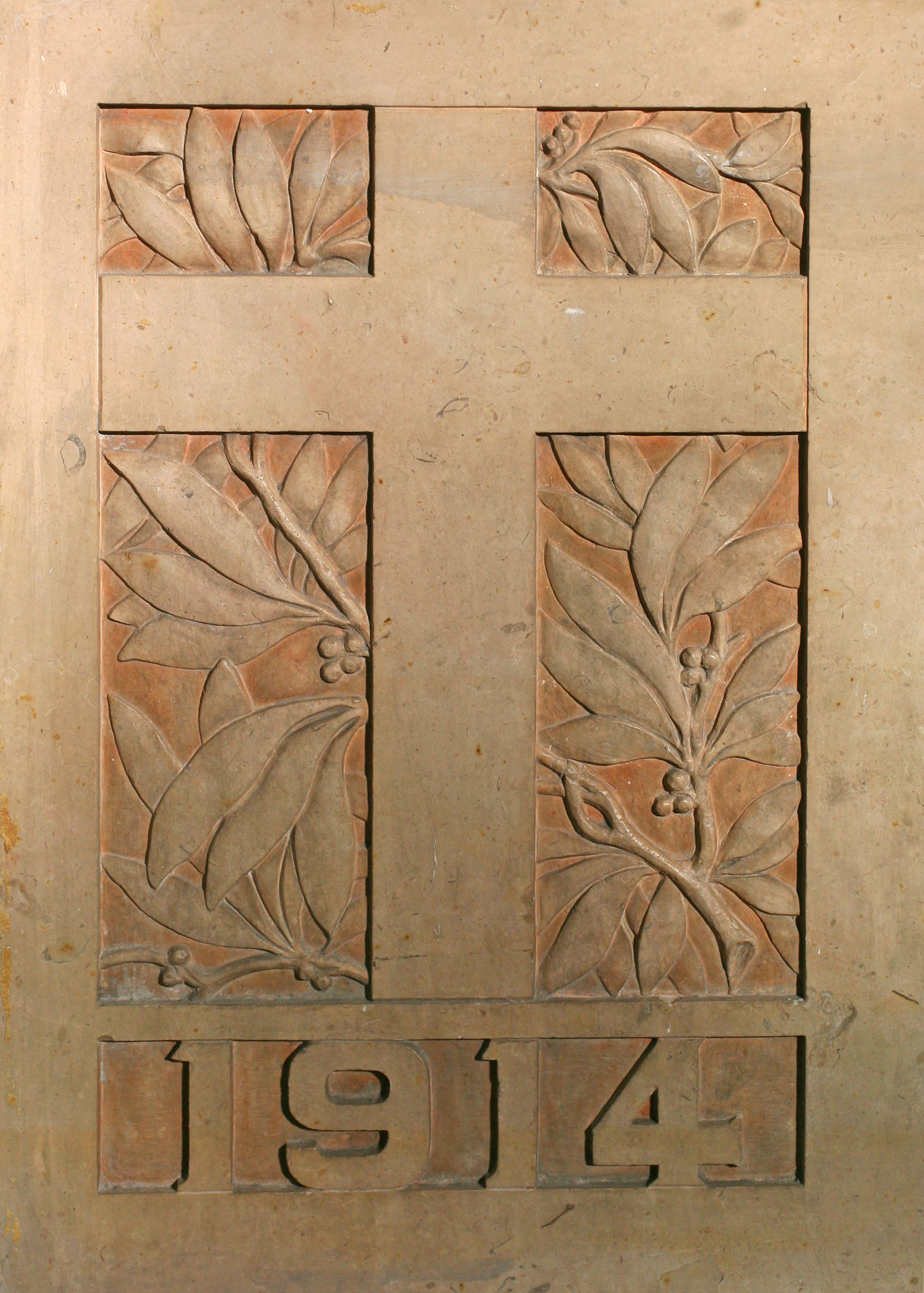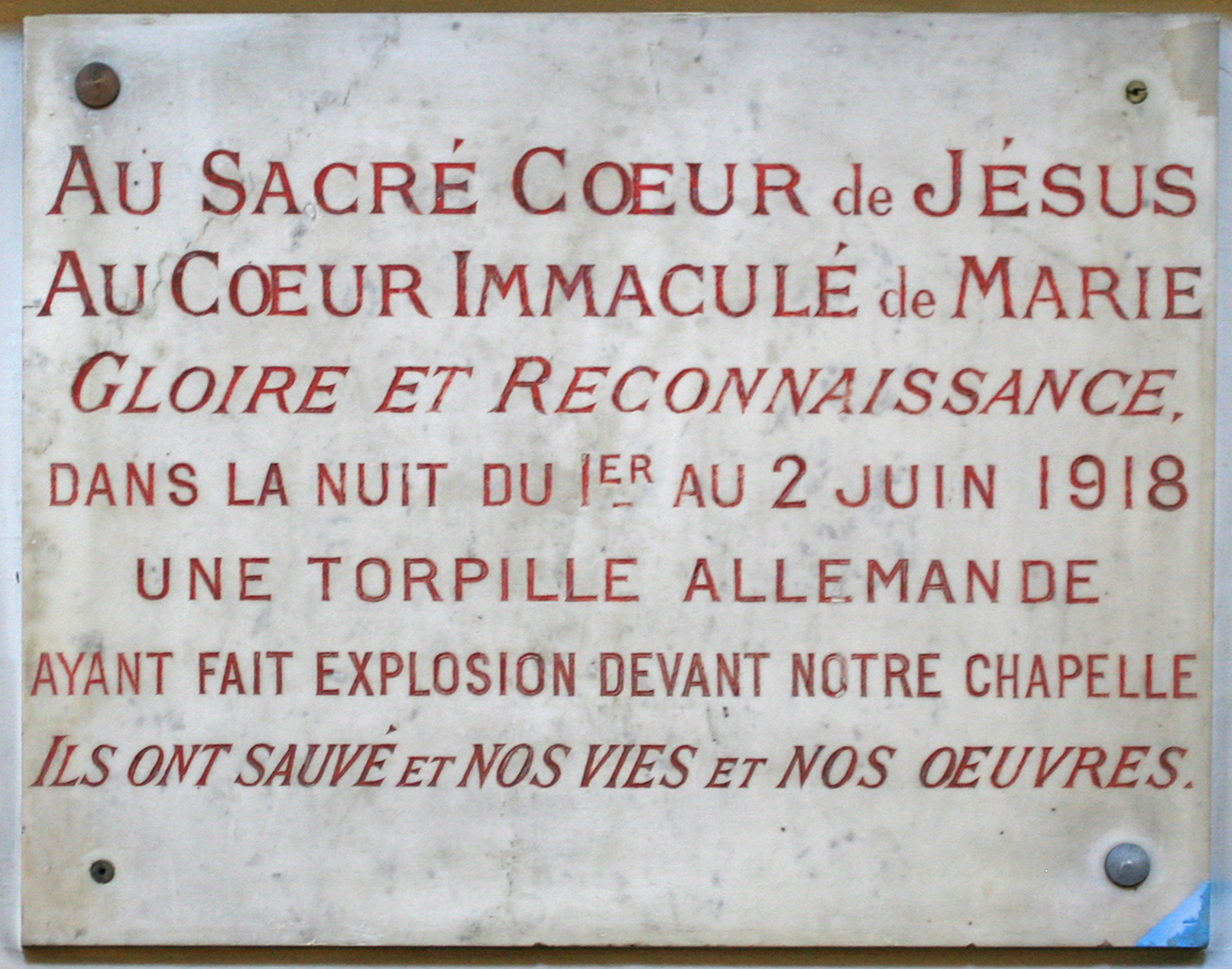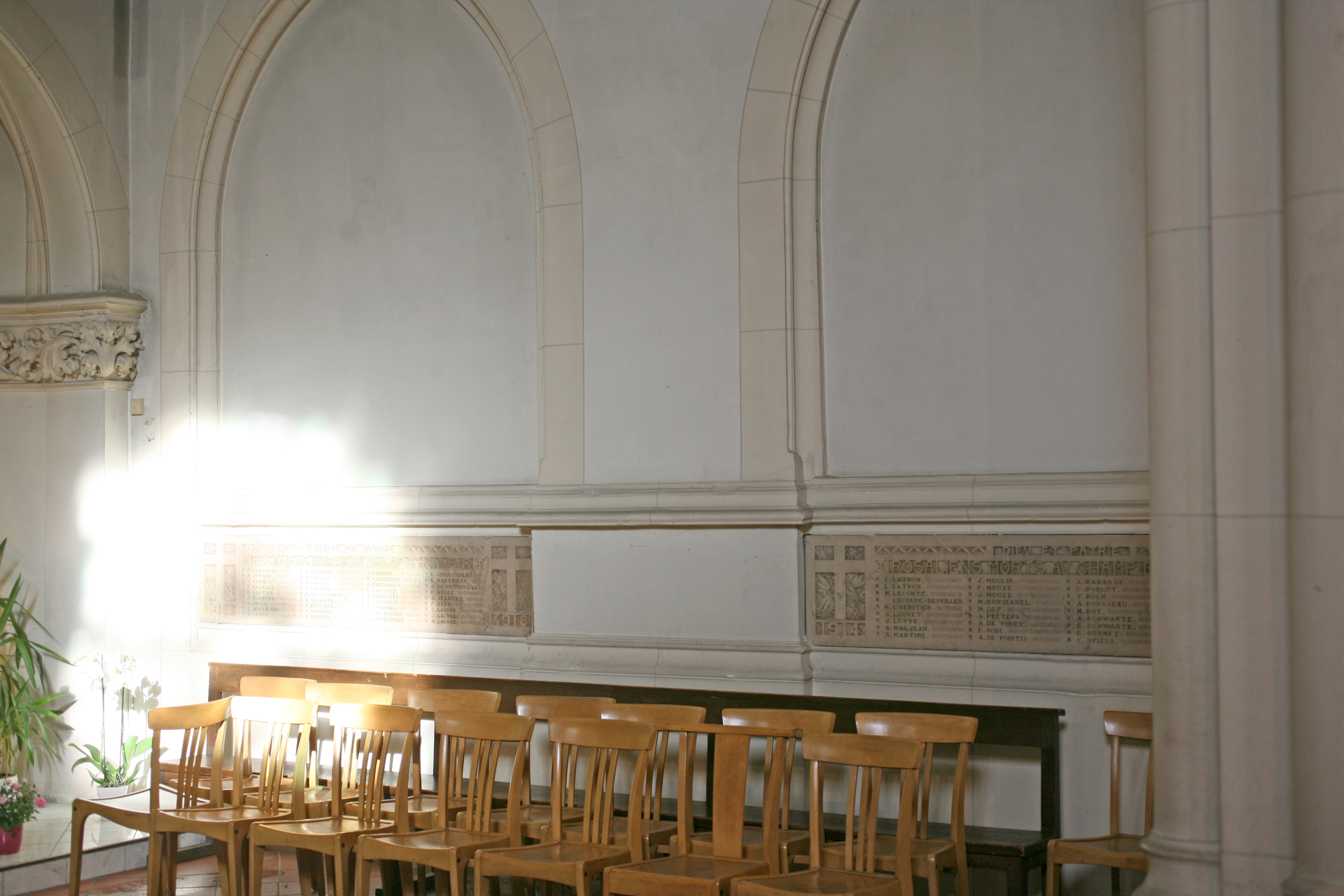 Localisation : bras droit du transept. Description : deux plaques en marbre couleur crème, lettres et décors gravées. Les lettres sont coloriés en noir, les décors et les titres ont des fonds coloriés en rouge. Les décors géométriques et végétaux sont propres aux arts de l'entre deux-guerres. Dimensions : h. 40 x l. 195 cm. Les deux plaques mentionnes 72 noms de victimes. Une deuxième plaque peut-être signalée : Epitaphe : 'Au Sacré Coeur de Jésus / Au Coeur Immaculé de Marie / Gloire et Reconnaissance, / Dans la nuit du 1er au 2 juin 1918 / une torpille allemande / ayant fait explosion devant notre chapelle / Ils ont sauvé et nos vies et nos oeuvres'. Localisation : bas-côté droit, première travée. Description : plaque en marbre, lettres gravées et coloriées en rouge. Dimensions : h. 38 x l. 42 p. 2 cm. © Frédéric Jiméno / CHVP / Ville de Paris