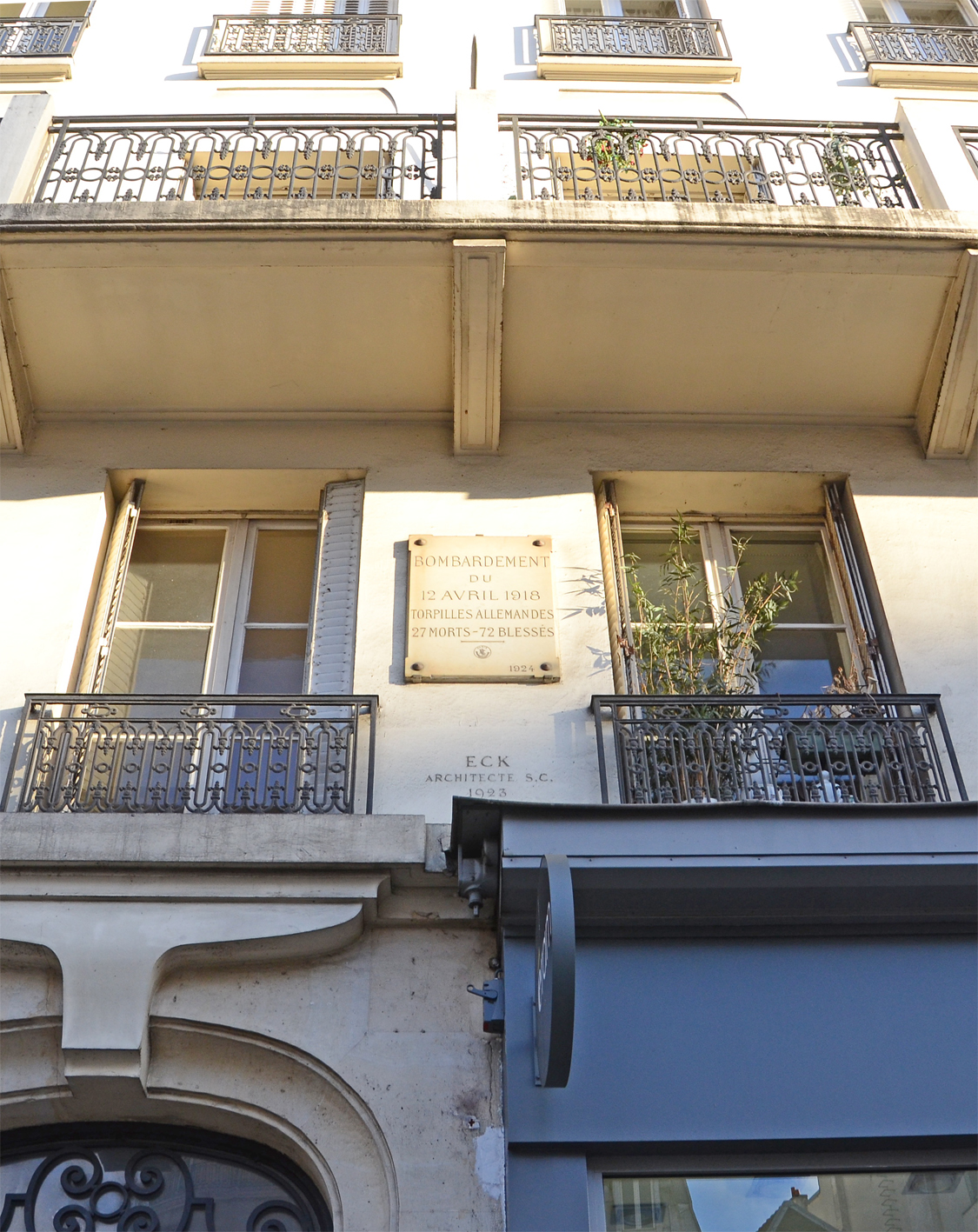 Une plaque en marbre décoré des armes de la Ville, en bas à droite, figure l'année de pose de la plaque : '1924'. L’épitaphe choisie par le Conseil de Paris, et que la plaque porte toujours, est la suivante : Épitaphe : Bombardement du 12 avril 1918 Torpilles allemandes 27 morts – 72 blessés Historique : dans la délibération présentée au Conseil de Paris le 15 février 1924, le projet est présenté ainsi : « Tendant à l’apposition, sur la maison portant le n° 12 de la rue de Rivoli, d’une inscription commémorant le bombardement aérien du 12 avril 1918 dans la région de l’église Saint-Paul-Saint-Louis, l’un des plus meurtriers de la sinistre série qui visait l’Hôtel de Ville, cœur et cerveau de Paris, et c’est bien lui-même qui a été frappé. » Le projet date de 1922, puisqu’une proposition de délibération est votée le 13 juillet de cette année-là. Il est adopté par le Conseil de Paris le 15 février 1924. Il prévoit la fabrication d’une plaque 'en marbre' pour une dépense évaluée par le Conseil de Paris à 600 francs. Bibliographie : BMO, 13 février 1924, p. 1032. © Frédéric Jiméno / DHMMA / Mairie de Paris