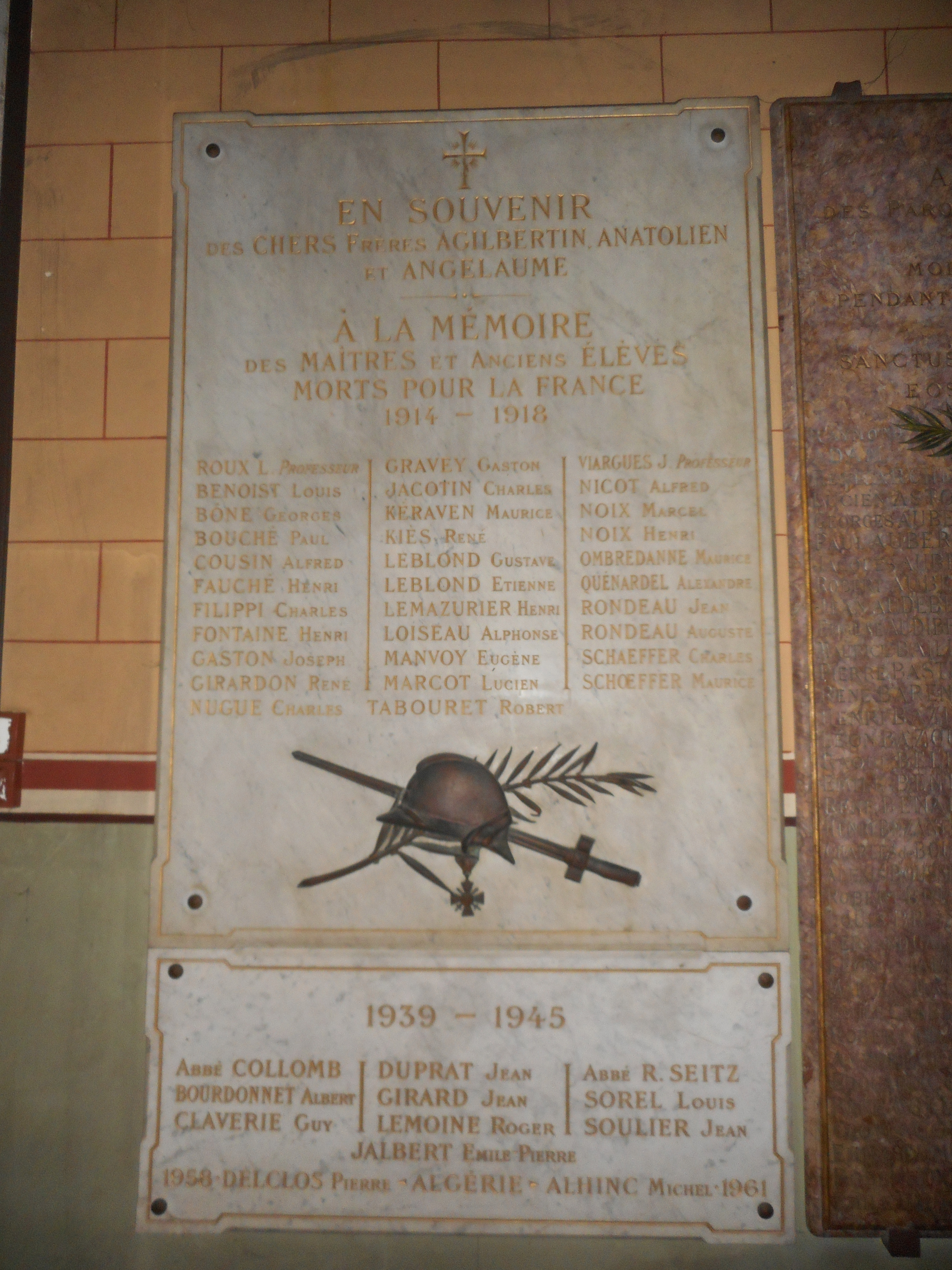 Localisation : bas-côté gauche, ensemble de plaques situées sous un vitrail de Janiaud (1947-1948) représentant Saint Michel terrassant le dragon. Sous le vitrail, dominant l'ensemble, une plaque de marbre blanc où l'épitaphe suivante est gravée et réchampies d'or : BIENHEUREUX CEUX QUI SOUFFRENT PRESÉCUTION POUR LA JUSTICE CAR LE ROYAUME DES CIEUX EST A EUX HEUREUX LES AFFLIGÉS PARCEQU'ILS SERONT CONSOLÉS Plaque 1 : Épitaphe : EN SOUVENIR DES CHERS FRÈRES AGILBERTIN, ANATOLIEN ET ANGELAUME À LA MEMOIRE DES MAÎTRES ET ANCIENS ÉLÈVES MORTS POUR LA FRANCE 1914 - 1918 Une plaque en marbre blanc légèrement veinée de gris, disposant du haut vers le bas : une croix avec les rayons du saint-Esprit, l'épitaphe elle-même, trois colonnes de noms, une ligne d'encadrement, le tout gravé et réchampi d'or. Au bas de la plaque, en métal, un casque de poilu, une épée, une branche de laurier et une croix de guerre. La plaque comprend 32 noms de soldats. Cette plaque devrait provenir de l’école paroissiale de garçons du 16 de la rue du Moulin-Vert, dit Cours Saint-Pierre, dont l’édifice fut démoli en 2006. En effet, le bulletin paroissial signale le décès de frère Anatolien le 27 novembre 1918, il fut pendant vingt ans chargé de la direction de cette école. La plaque se réfère sans-doute à lui et à deux autres religieux de l’établissement. Bibliographie : La Voix de Saint-Pierre. Bulletin mensuel de la Paroisse Saint-Pierre de Montrouge et ses œuvres, 15 décembre 1918, p. 16. Plaque 2 : Épitaphe : A LA MEMOIRE DES PAROISSIENS DE SAINT-PIERRE DE MONTROUGE MORTS POUR LA PATRIE PENDANT LA GUERRE DE 1914 1918 Puis épitaphe en latin. Une plaque en marbre rouge tacheté, les épitaphes sont gravées et réchampies d'or, les noms sur 3 colonnes sont gravés, pour seul décor deux drapeaux français, deux palmes de laurier et une croix de guerre. En tout, 366 sur 448 des noms figurants sont des victimes de la Première Guerre Mondiale. © D. Grenèche / DHMMA / Mairie de Paris