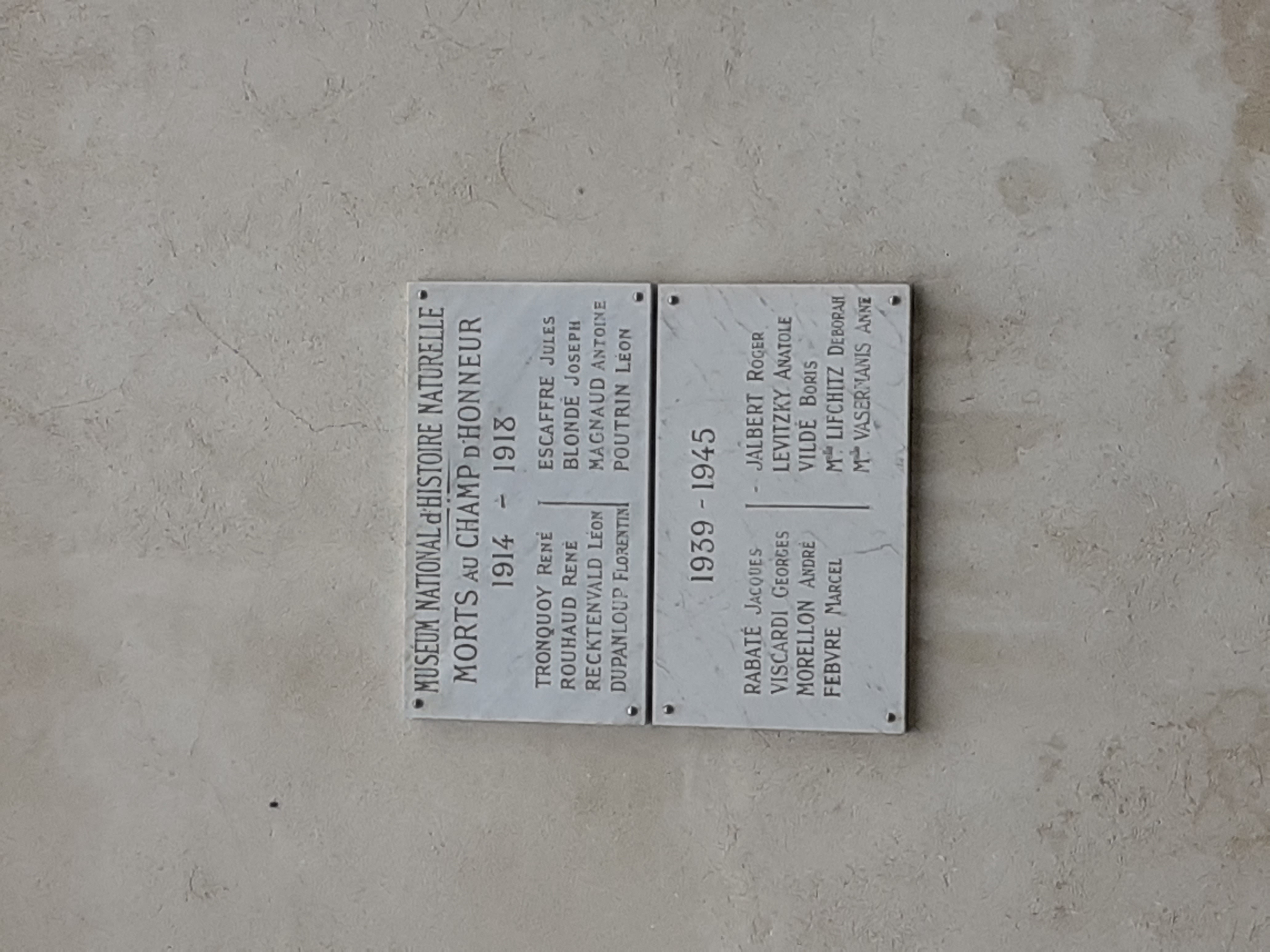 Muséum national d'histoire naturel Morts au champ d'honneur 1914 - 1918 Plaque toute simple située sur la façade latérale de l'hôtel de Magny, à l'intérieur du Jardin des plantes. © Ville de Paris / DHMMA